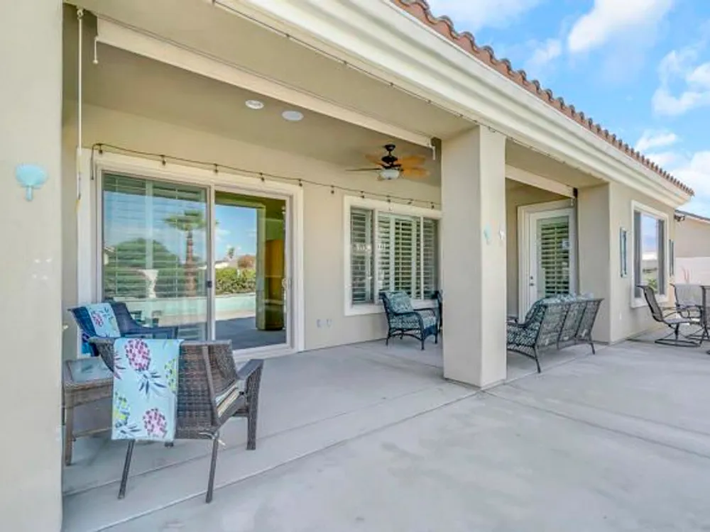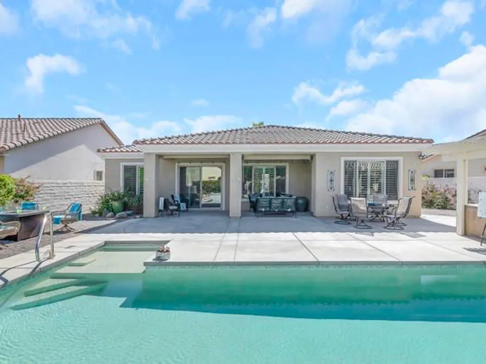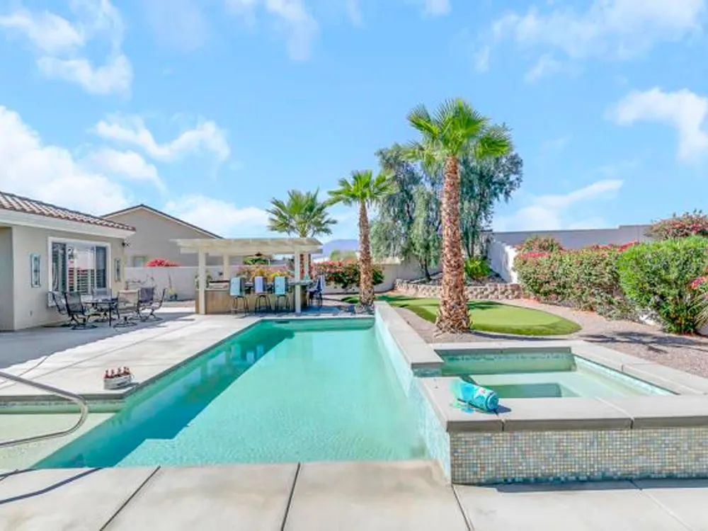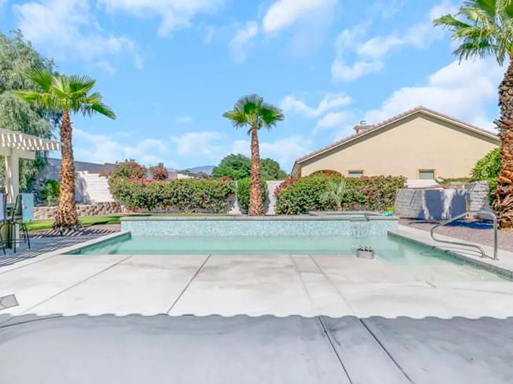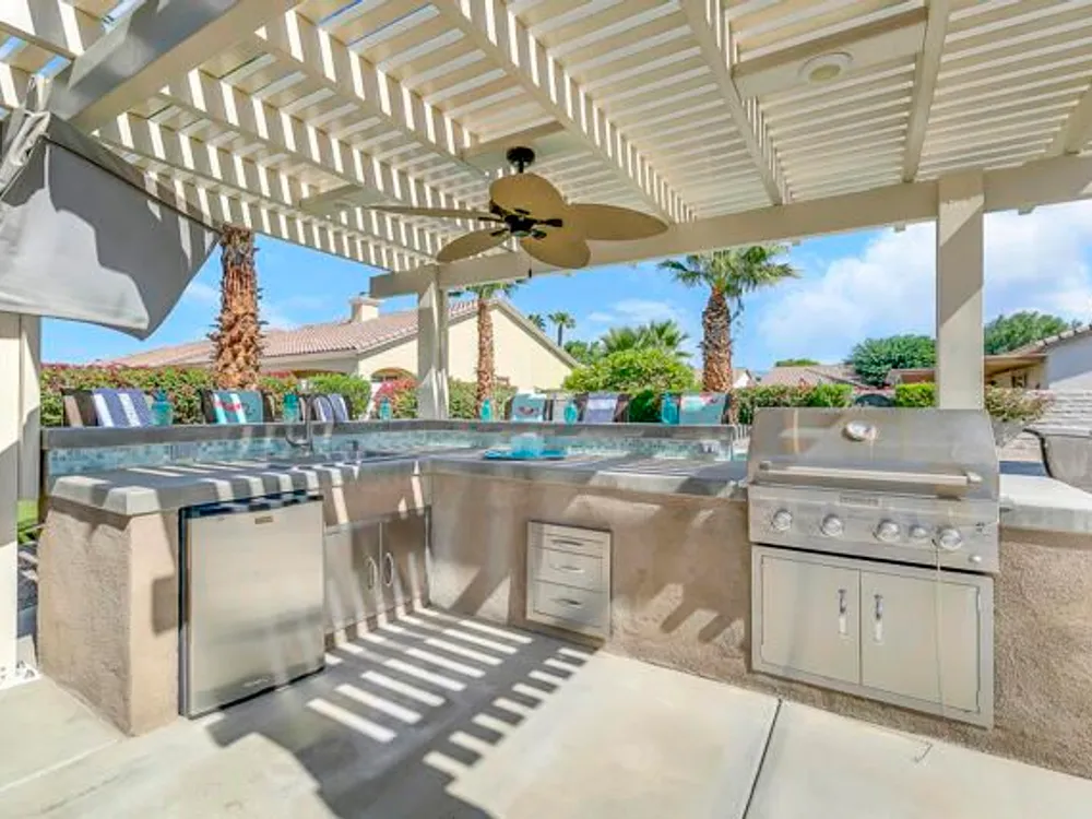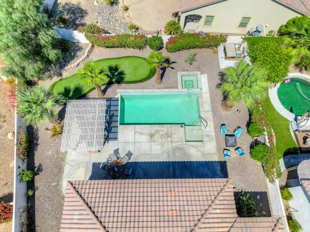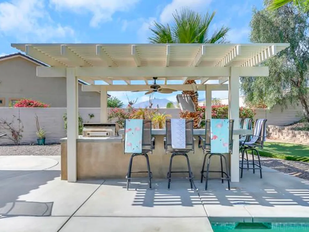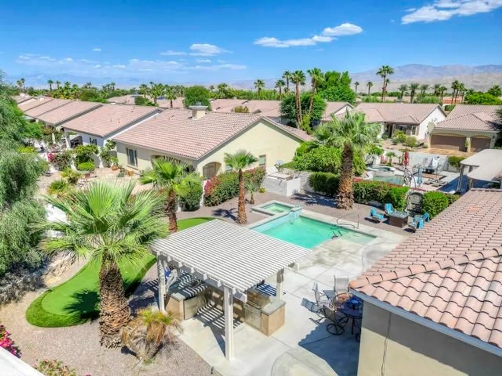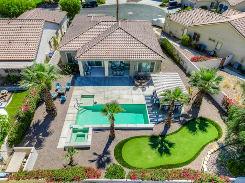 Welcome to your desert retreat in Sun City Shadow Hills. This popular San Emilio plan 2BD + Den, 2BA welcomes you with 10-ft ceilings and sun-filled spaces. The chef's kitchen is made for gathering featuring expansive granite counters, an 8-ft island, freshly painted white cabinetry, a roomy pantry off the breakfast nook, and a full suite of LG stainless appliances including dishwasher, cooktop, microwave, refrigerator, and double ovens. Throughout the home, you'll find plantation shutters and luxury vinyl flooring.Slide open the doors from the living room or the private primary suite and step into a resort backyard on a 9,148 SF lot: salt-water PebbleTec pool with tanning shelf, spa, and an outdoor kitchenette/bar equipped with a mini-fridge, sink, drawers, lighting & TV beneath an Alumawood pergola, plus a putting green and misting system with surround sound. Bask in glowing west-facing sunsets and peekaboo mountain views. The primary suite features a walk-in closet and step-in shower; the guest bath offers a tub/shower combo. A 2-car garage + golf-cart space and a dedicated laundry room with sink and storage add everyday ease. Welcome home to vibrant, low-maintenance living in a premier 55+ community!