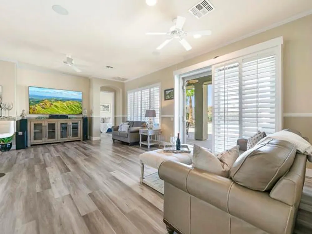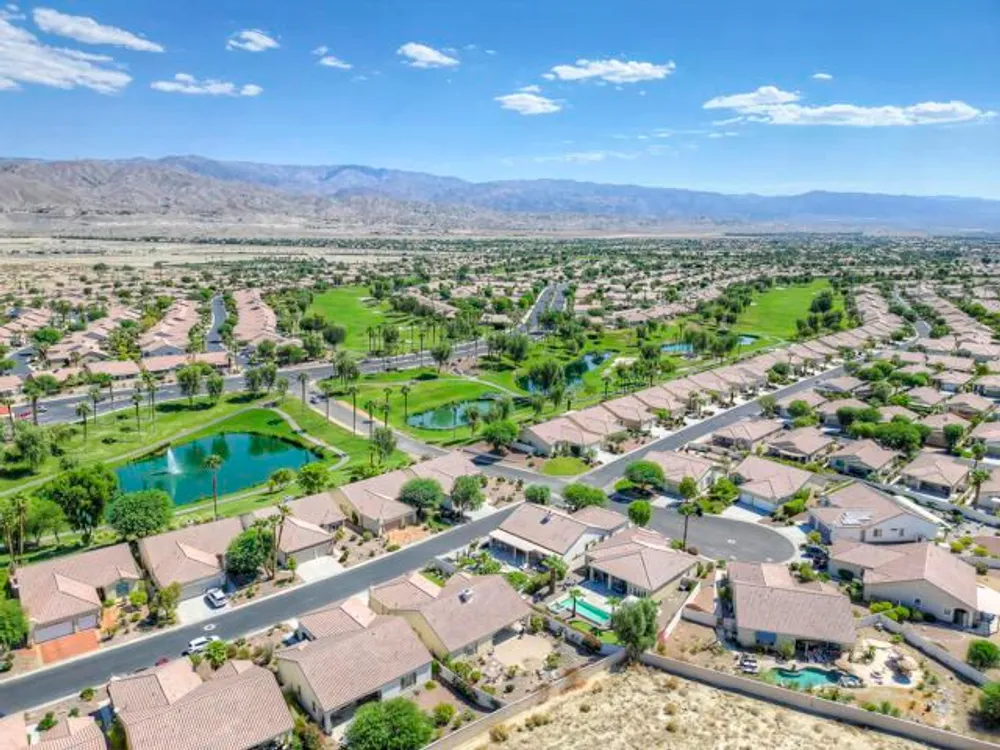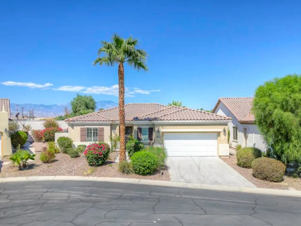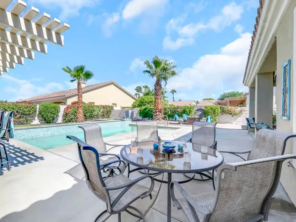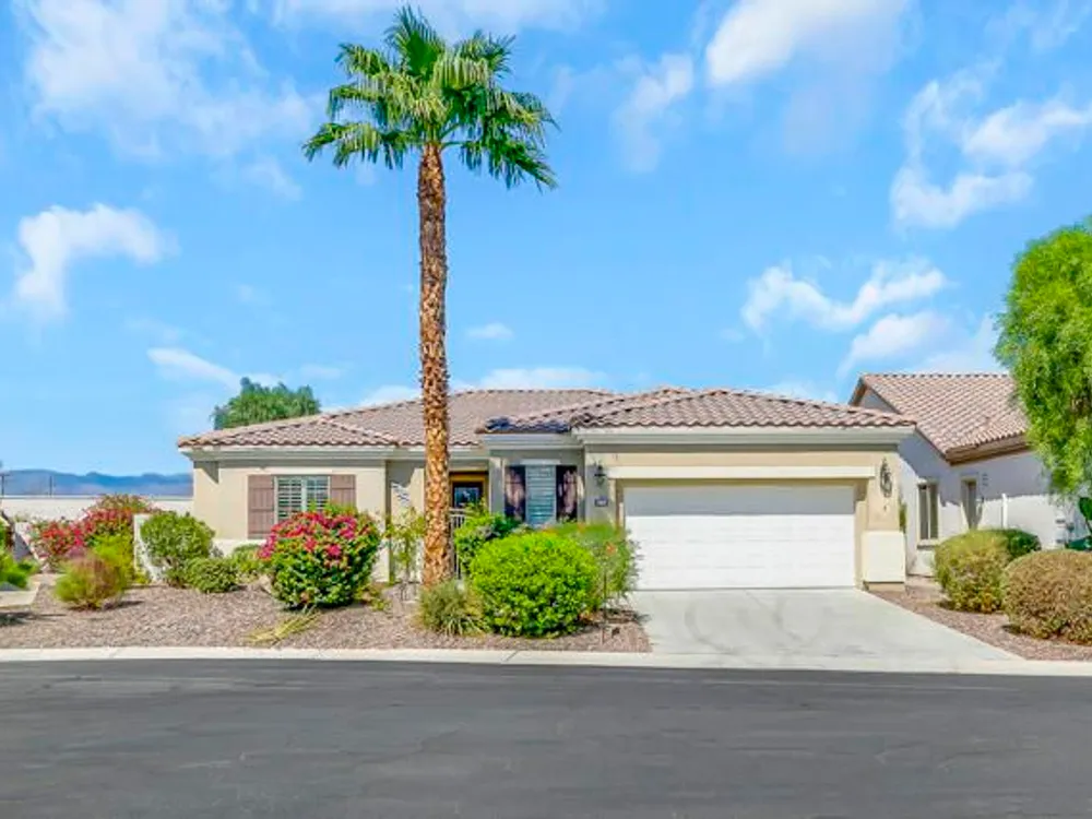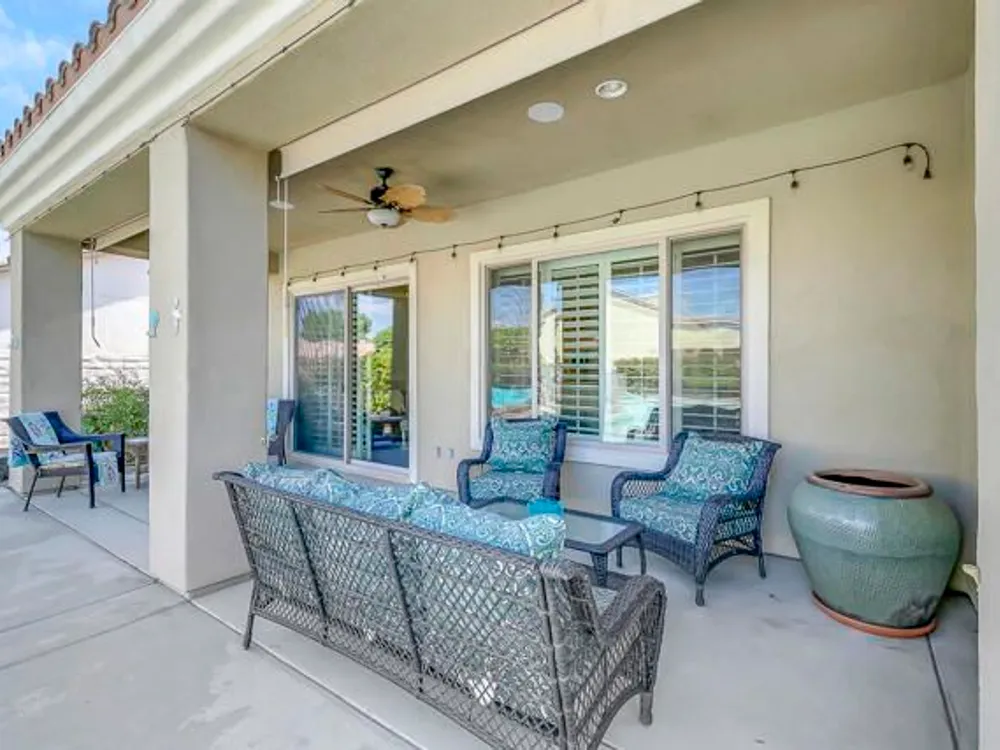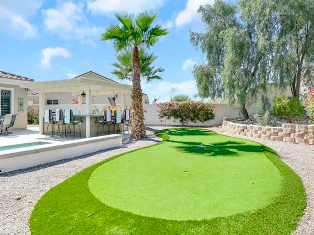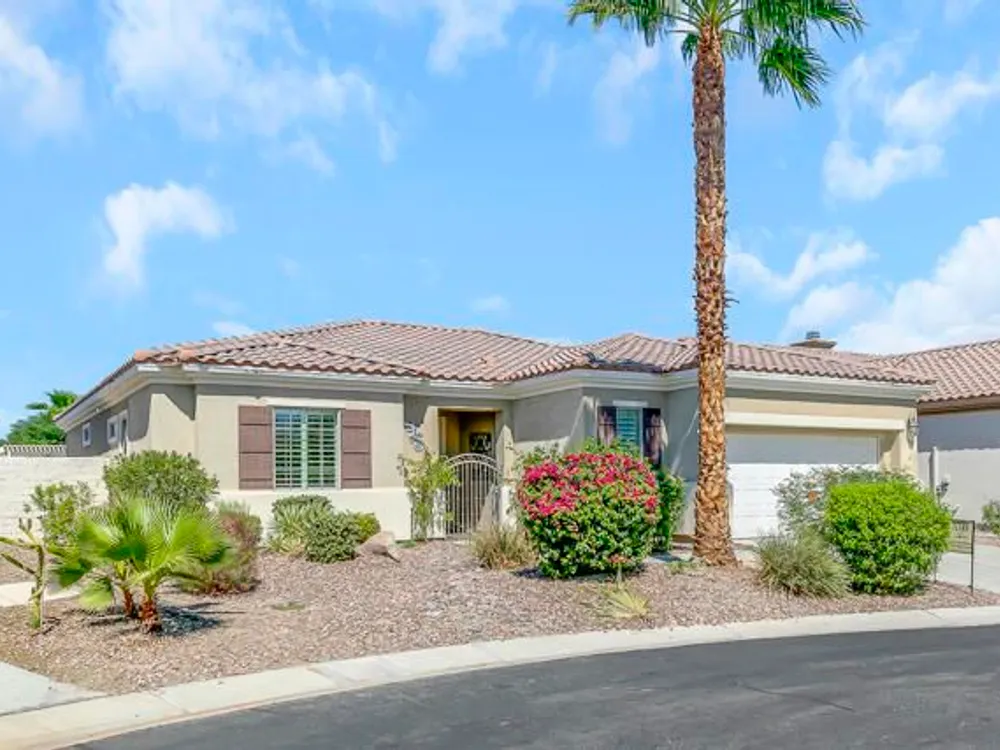 Welcome to your desert retreat in Sun City Shadow Hills. This popular San Emilio plan 2BD + Den, 2BA welcomes you with 10-ft ceilings and sun-filled spaces. The chef's kitchen is made for gathering featuring expansive granite counters, an 8-ft island, freshly painted white cabinetry, a roomy pantry off the breakfast nook, and a full suite of LG stainless appliances including dishwasher, cooktop, microwave, refrigerator, and double ovens. Throughout the home, you'll find plantation shutters and luxury vinyl flooring.Slide open the doors from the living room or the private primary suite and step into a resort backyard on a 9,148 SF lot: salt-water PebbleTec pool with tanning shelf, spa, and an outdoor kitchenette/bar equipped with a mini-fridge, sink, drawers, lighting & TV beneath an Alumawood pergola, plus a putting green and misting system with surround sound. Bask in glowing west-facing sunsets and peekaboo mountain views. The primary suite features a walk-in closet and step-in shower; the guest bath offers a tub/shower combo. A 2-car garage + golf-cart space and a dedicated laundry room with sink and storage add everyday ease. Welcome home to vibrant, low-maintenance living in a premier 55+ community!