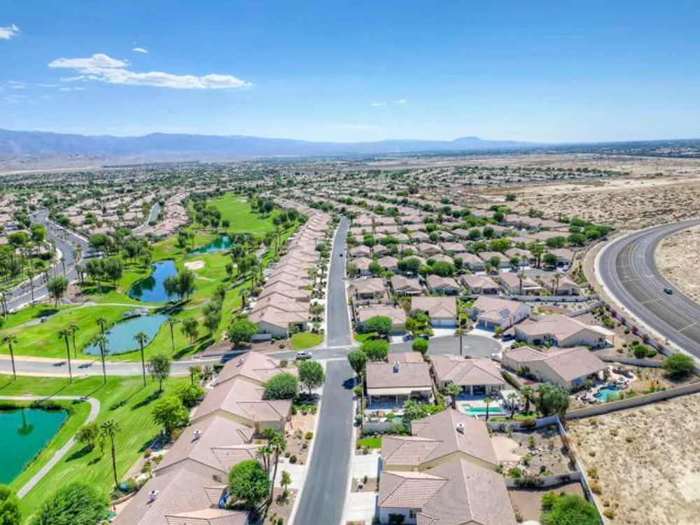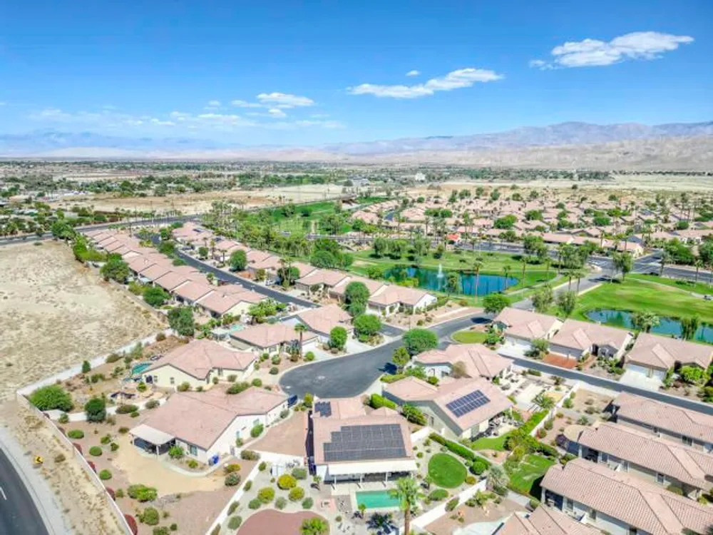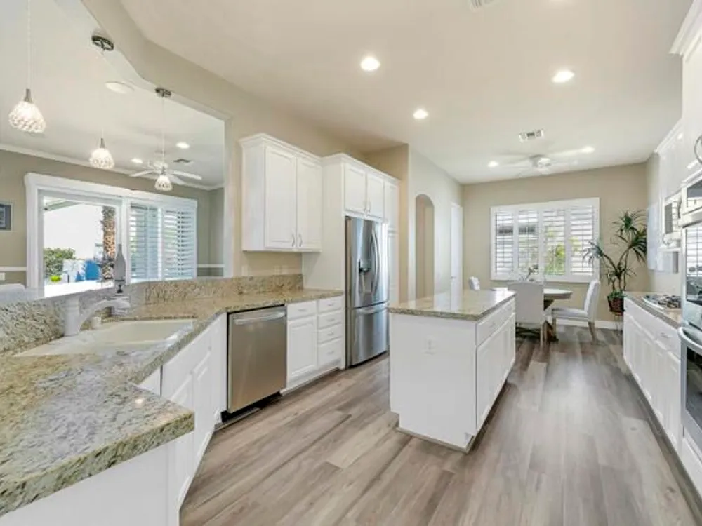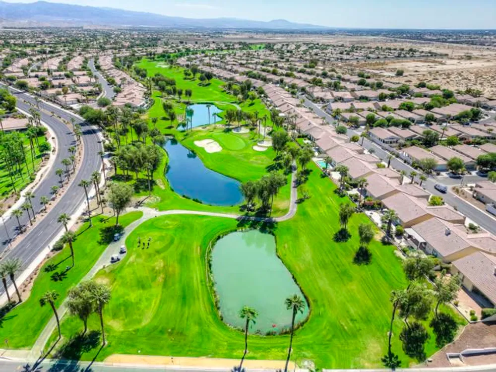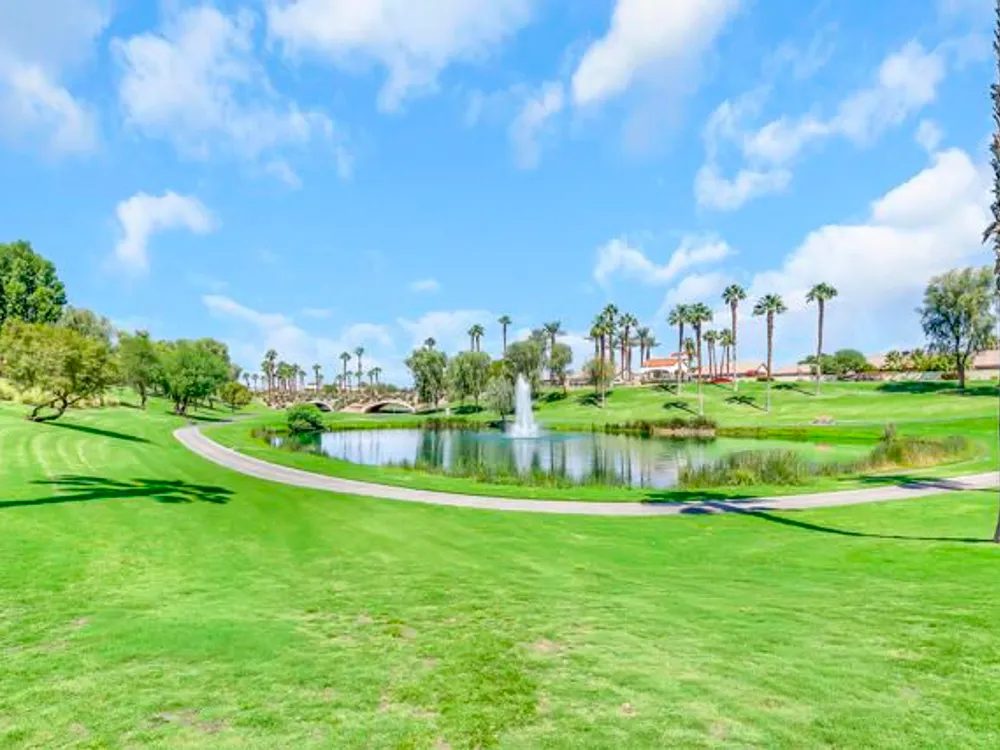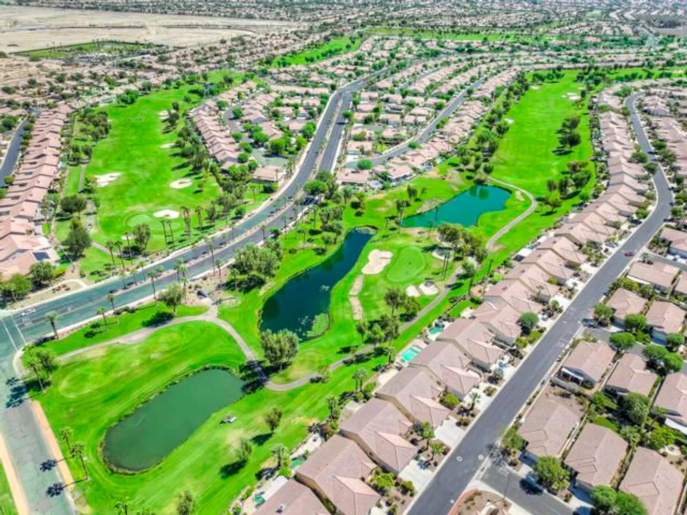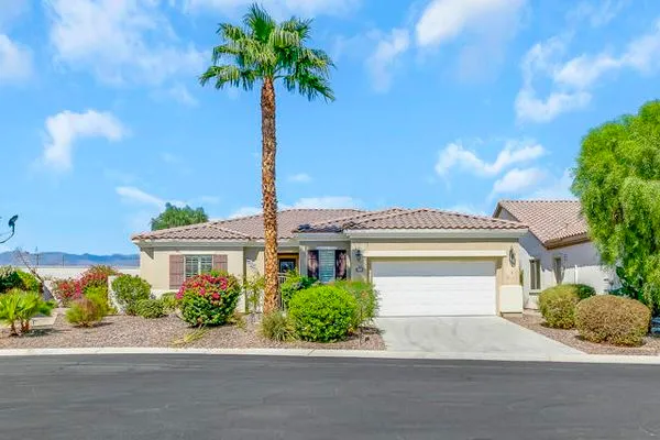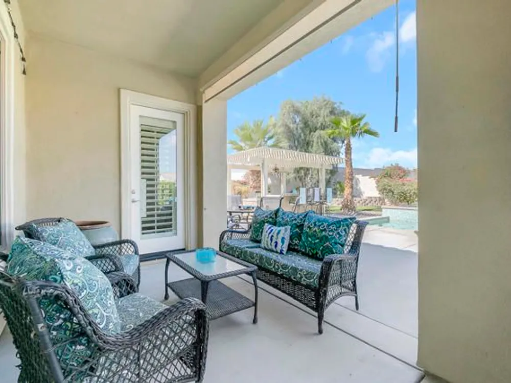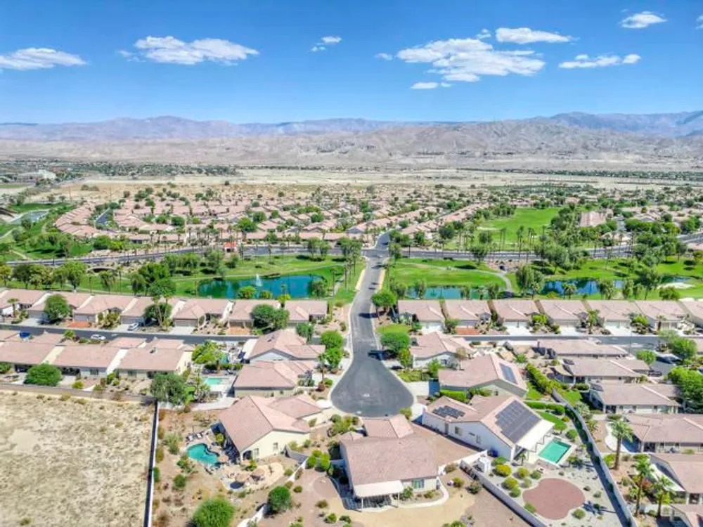 Welcome to your desert retreat in Sun City Shadow Hills. This popular San Emilio plan 2BD + Den, 2BA welcomes you with 10-ft ceilings and sun-filled spaces. The chef's kitchen is made for gathering featuring expansive granite counters, an 8-ft island, freshly painted white cabinetry, a roomy pantry off the breakfast nook, and a full suite of LG stainless appliances including dishwasher, cooktop, microwave, refrigerator, and double ovens. Throughout the home, you'll find plantation shutters and luxury vinyl flooring.Slide open the doors from the living room or the private primary suite and step into a resort backyard on a 9,148 SF lot: salt-water PebbleTec pool with tanning shelf, spa, and an outdoor kitchenette/bar equipped with a mini-fridge, sink, drawers, lighting & TV beneath an Alumawood pergola, plus a putting green and misting system with surround sound. Bask in glowing west-facing sunsets and peekaboo mountain views. The primary suite features a walk-in closet and step-in shower; the guest bath offers a tub/shower combo. A 2-car garage + golf-cart space and a dedicated laundry room with sink and storage add everyday ease. Welcome home to vibrant, low-maintenance living in a premier 55+ community!