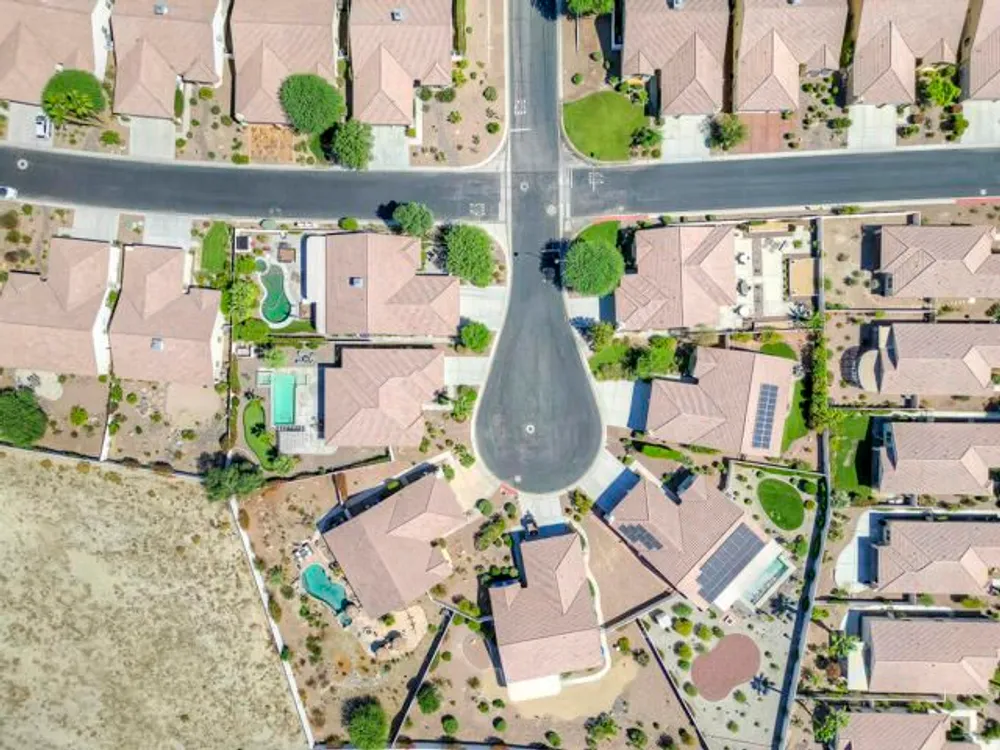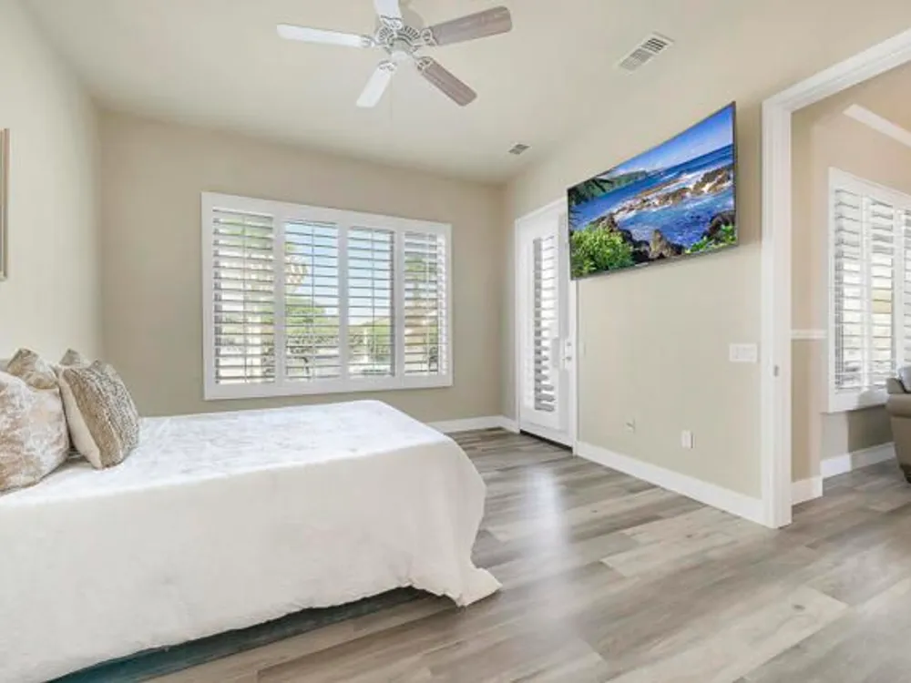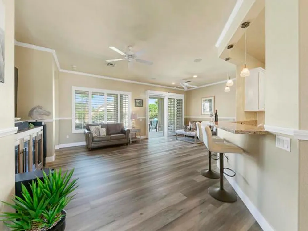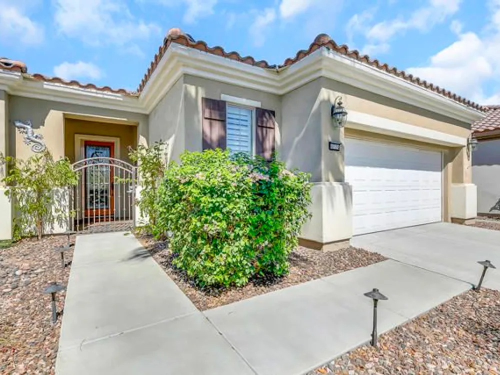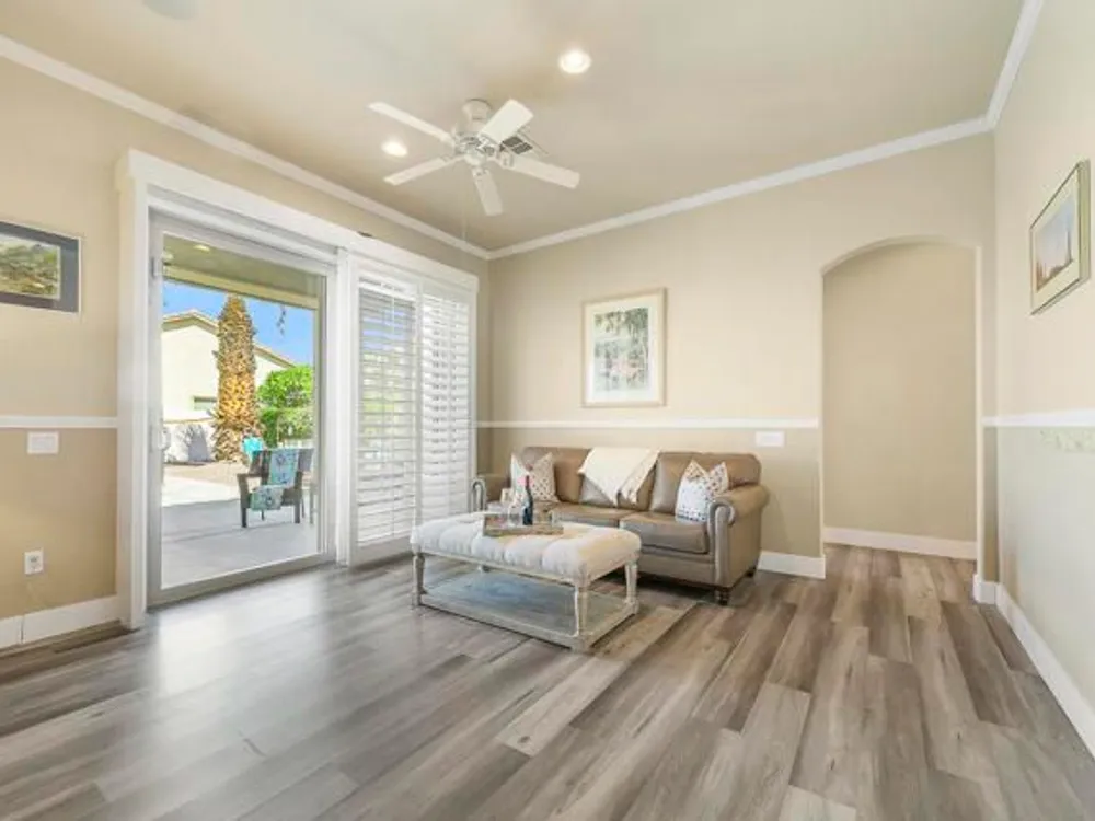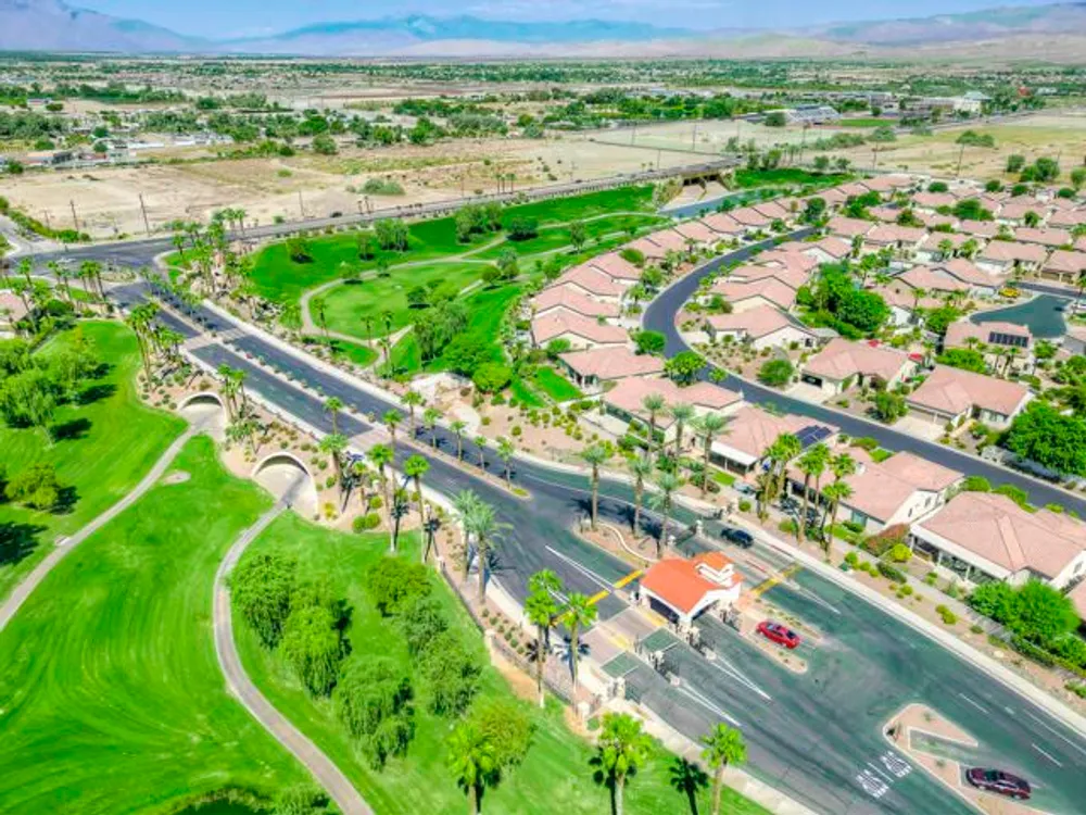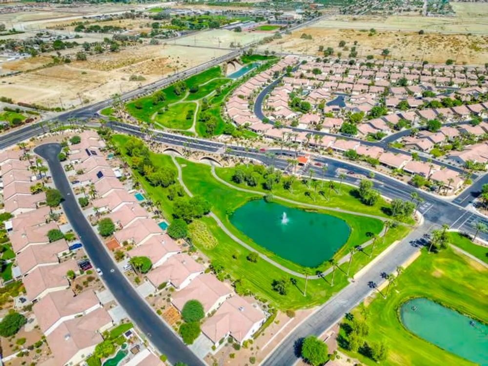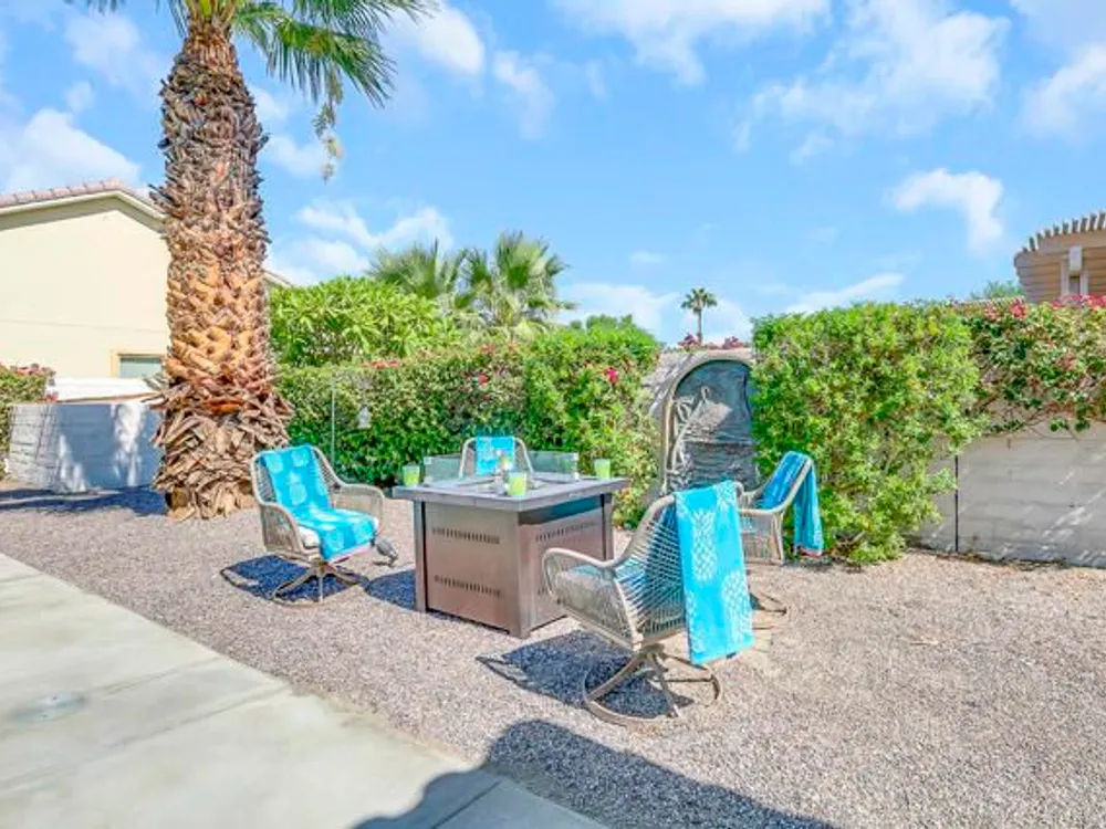 Welcome to your desert retreat in Sun City Shadow Hills. This popular San Emilio plan 2BD + Den, 2BA welcomes you with 10-ft ceilings and sun-filled spaces. The chef's kitchen is made for gathering featuring expansive granite counters, an 8-ft island, freshly painted white cabinetry, a roomy pantry off the breakfast nook, and a full suite of LG stainless appliances including dishwasher, cooktop, microwave, refrigerator, and double ovens. Throughout the home, you'll find plantation shutters and luxury vinyl flooring.Slide open the doors from the living room or the private primary suite and step into a resort backyard on a 9,148 SF lot: salt-water PebbleTec pool with tanning shelf, spa, and an outdoor kitchenette/bar equipped with a mini-fridge, sink, drawers, lighting & TV beneath an Alumawood pergola, plus a putting green and misting system with surround sound. Bask in glowing west-facing sunsets and peekaboo mountain views. The primary suite features a walk-in closet and step-in shower; the guest bath offers a tub/shower combo. A 2-car garage + golf-cart space and a dedicated laundry room with sink and storage add everyday ease. Welcome home to vibrant, low-maintenance living in a premier 55+ community!