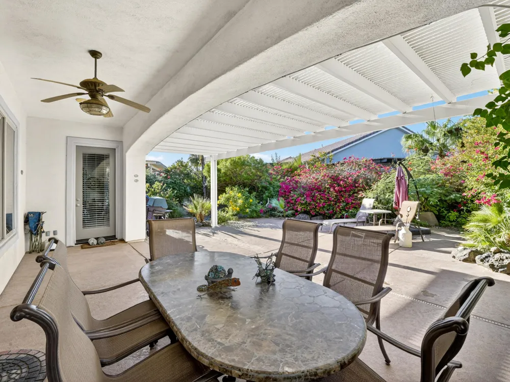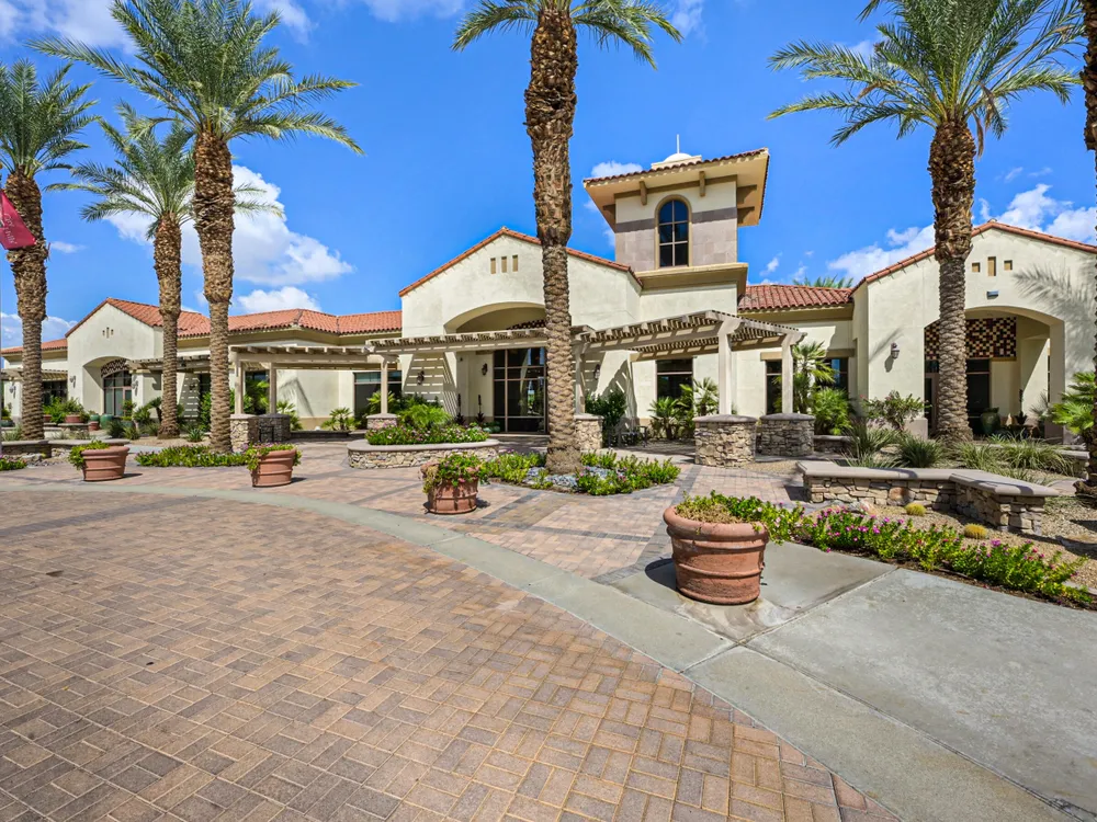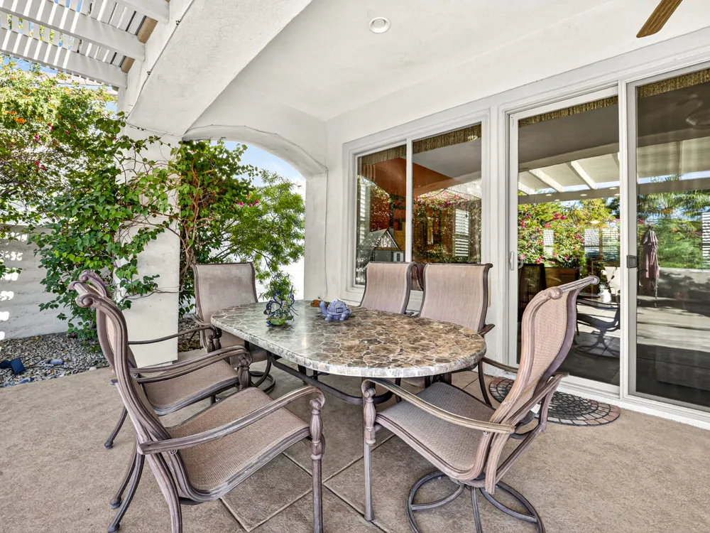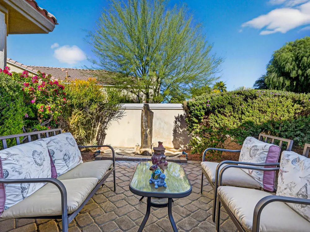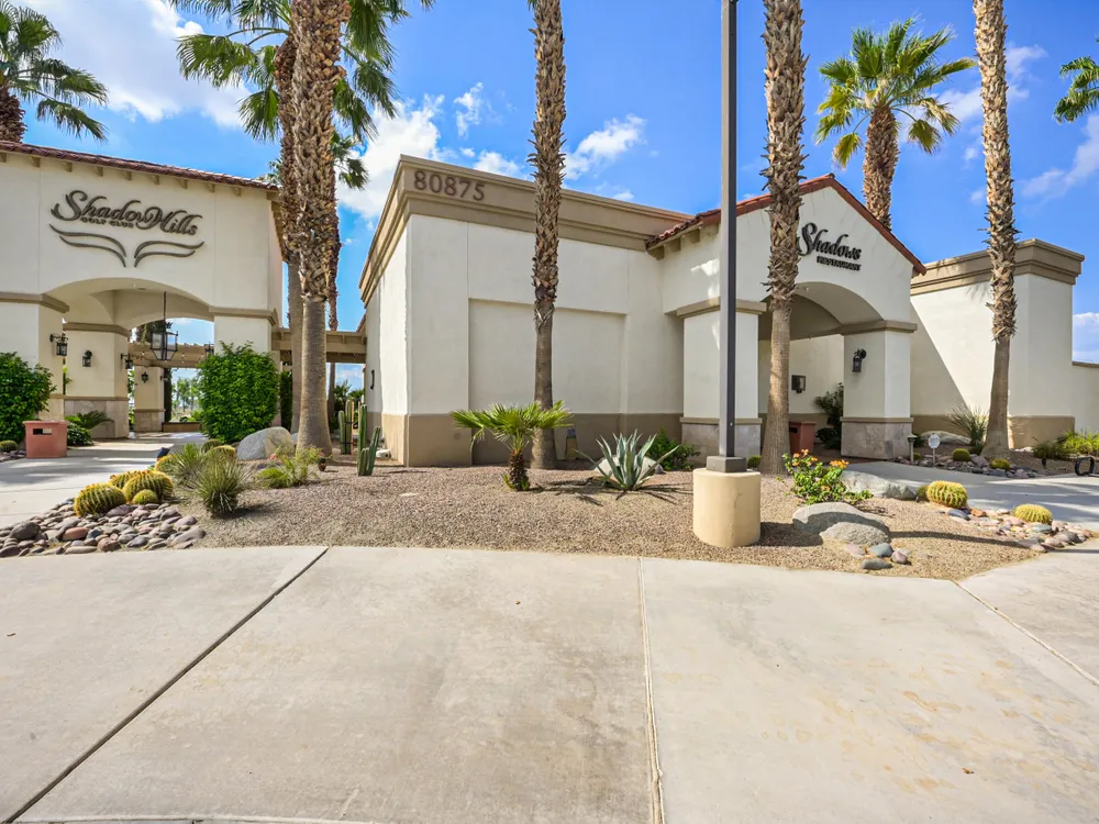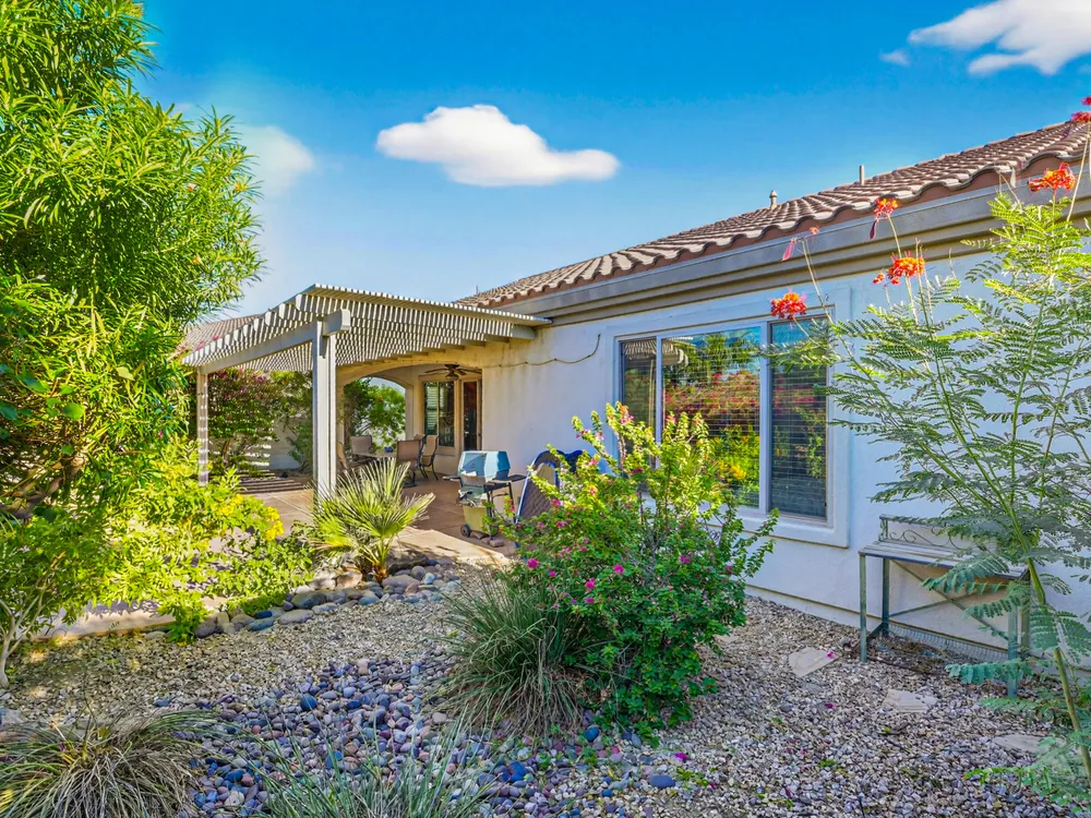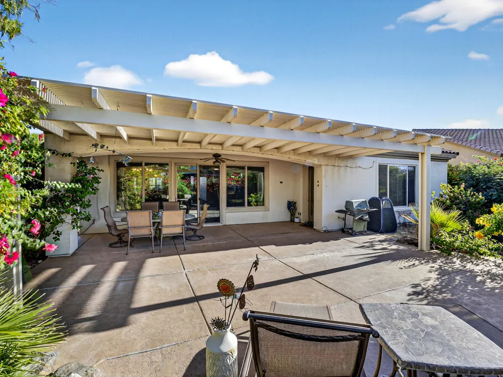 Located in the desirable 55+ community of Sun City Shadow Hills, this beautifully maintained San Benito floor plan offers 2,147 sq. ft. of stylish and comfortable living. The home features a charming front courtyard with a stone fountain and pavers across the entire front. Inside, the open living and dining area showcases tile flooring, abundant natural light, and a sliding glass door leading to the backyard. The kitchen includes granite slab countertops, extensive cabinetry, bay windows, and a cozy breakfast nook with plantation shutters. A versatile den/office with a skylight and a bonus room with tile flooring provide additional space for work or hobbies. The primary suite features laminate flooring, backyard access, an updated en suite bath, and two walk-in closets. The guest bedroom offers cozy carpet and sits next to the guest bath. Both bathrooms include grab bars for added comfort. Additional highlights include a convenient golf cart garage for easy access to the community's amenities. Step outside to enjoy a spacious 9,000+ sq. ft. lot with extended concrete patios, a covered area with ceiling fans, and low-maintenance landscaping, perfect for relaxing or entertaining. Located within Sun City Shadow Hills, residents enjoy access to two golf courses, clubhouses, fitness centers, pools, pickleball and tennis courts, and a variety of social clubs and activities—offering a vibrant and active desert lifestyle.