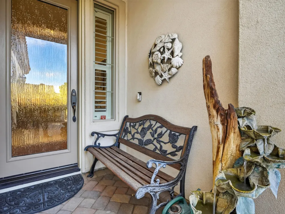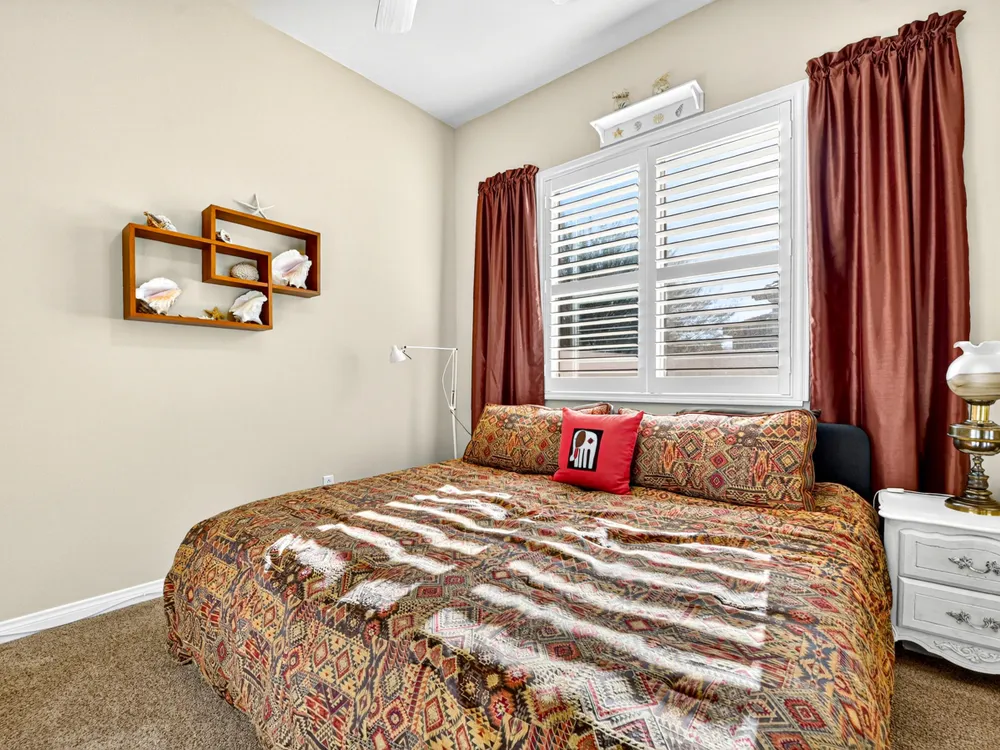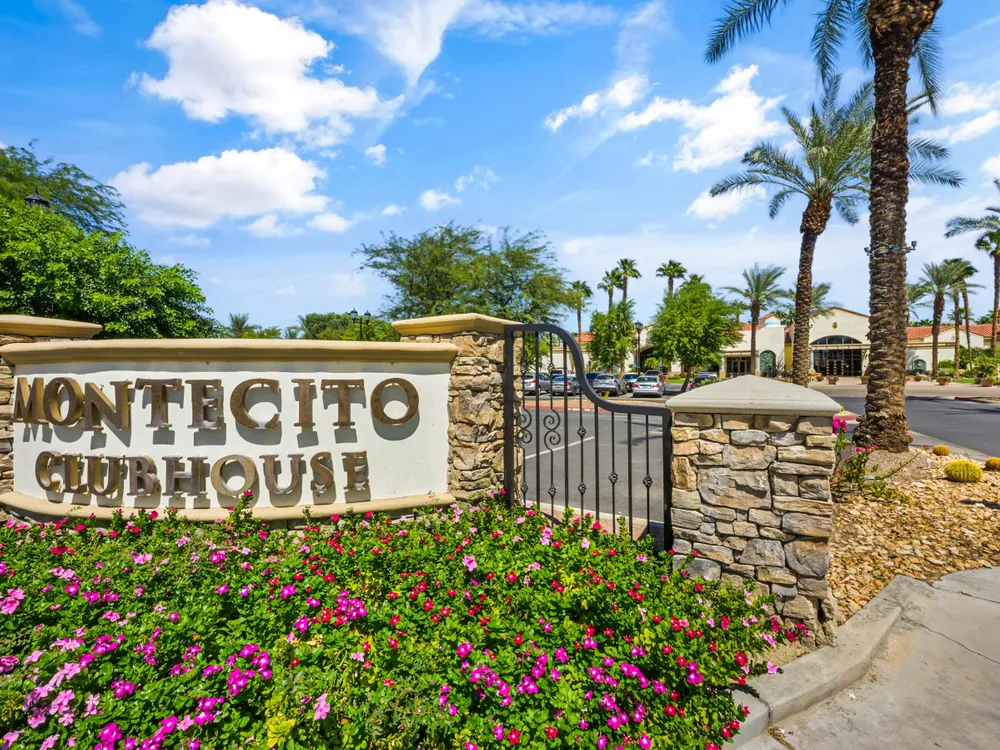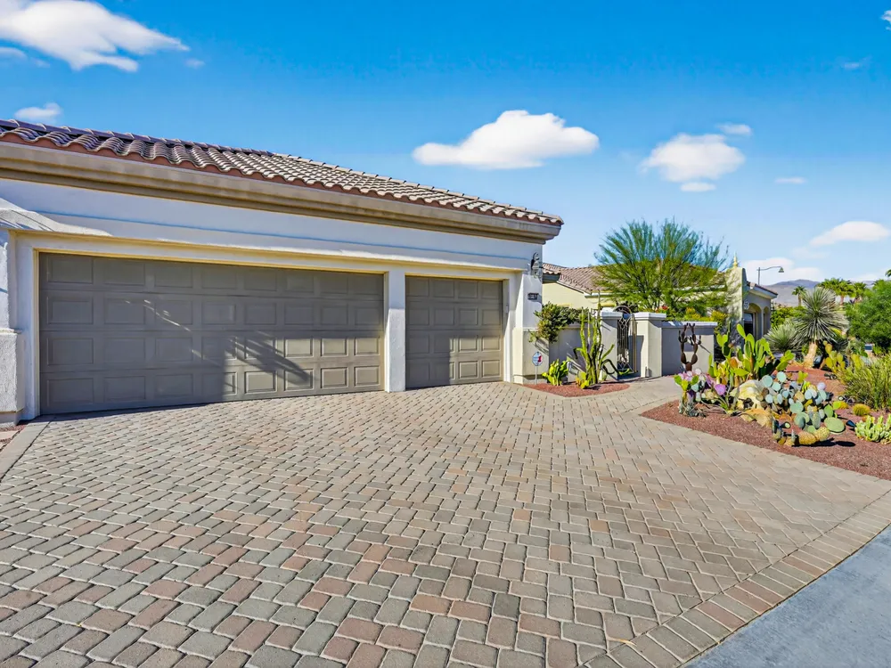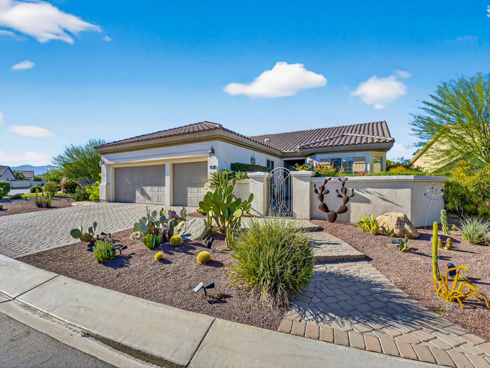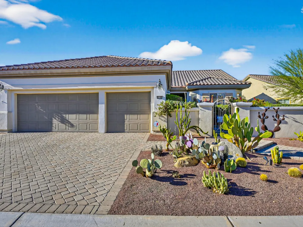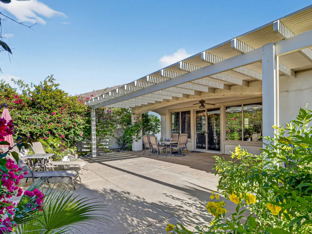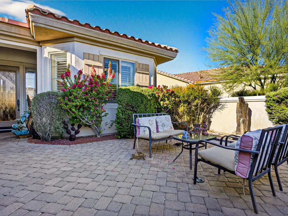 Located in the desirable 55+ community of Sun City Shadow Hills, this beautifully maintained San Benito floor plan offers 2,147 sq. ft. of stylish and comfortable living. The home features a charming front courtyard with a stone fountain and pavers across the entire front. Inside, the open living and dining area showcases tile flooring, abundant natural light, and a sliding glass door leading to the backyard. The kitchen includes granite slab countertops, extensive cabinetry, bay windows, and a cozy breakfast nook with plantation shutters. A versatile den/office with a skylight and a bonus room with tile flooring provide additional space for work or hobbies. The primary suite features laminate flooring, backyard access, an updated en suite bath, and two walk-in closets. The guest bedroom offers cozy carpet and sits next to the guest bath. Both bathrooms include grab bars for added comfort. Additional highlights include a convenient golf cart garage for easy access to the community's amenities. Step outside to enjoy a spacious 9,000+ sq. ft. lot with extended concrete patios, a covered area with ceiling fans, and low-maintenance landscaping, perfect for relaxing or entertaining. Located within Sun City Shadow Hills, residents enjoy access to two golf courses, clubhouses, fitness centers, pools, pickleball and tennis courts, and a variety of social clubs and activities—offering a vibrant and active desert lifestyle.
