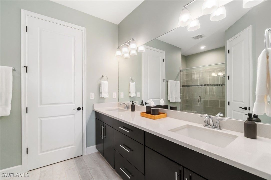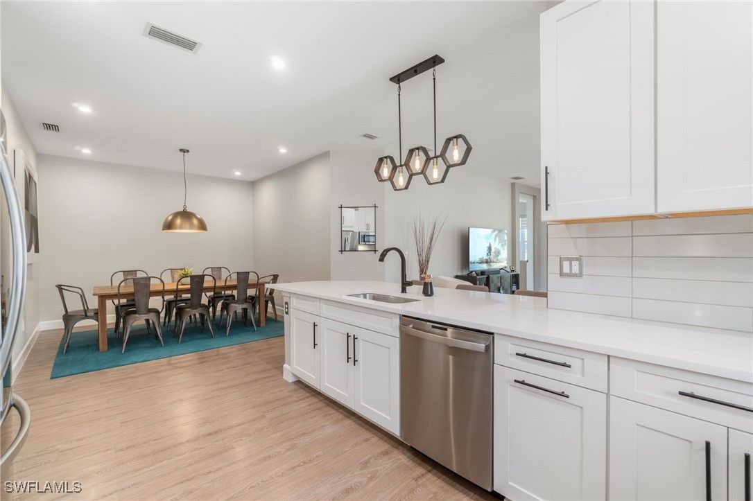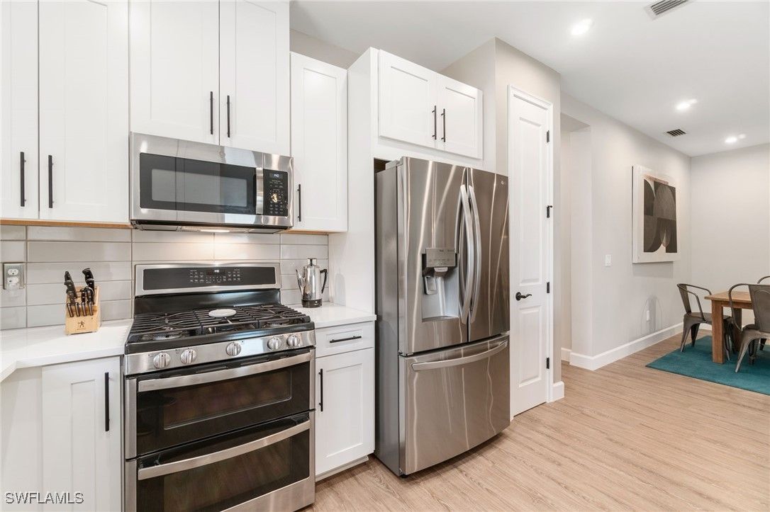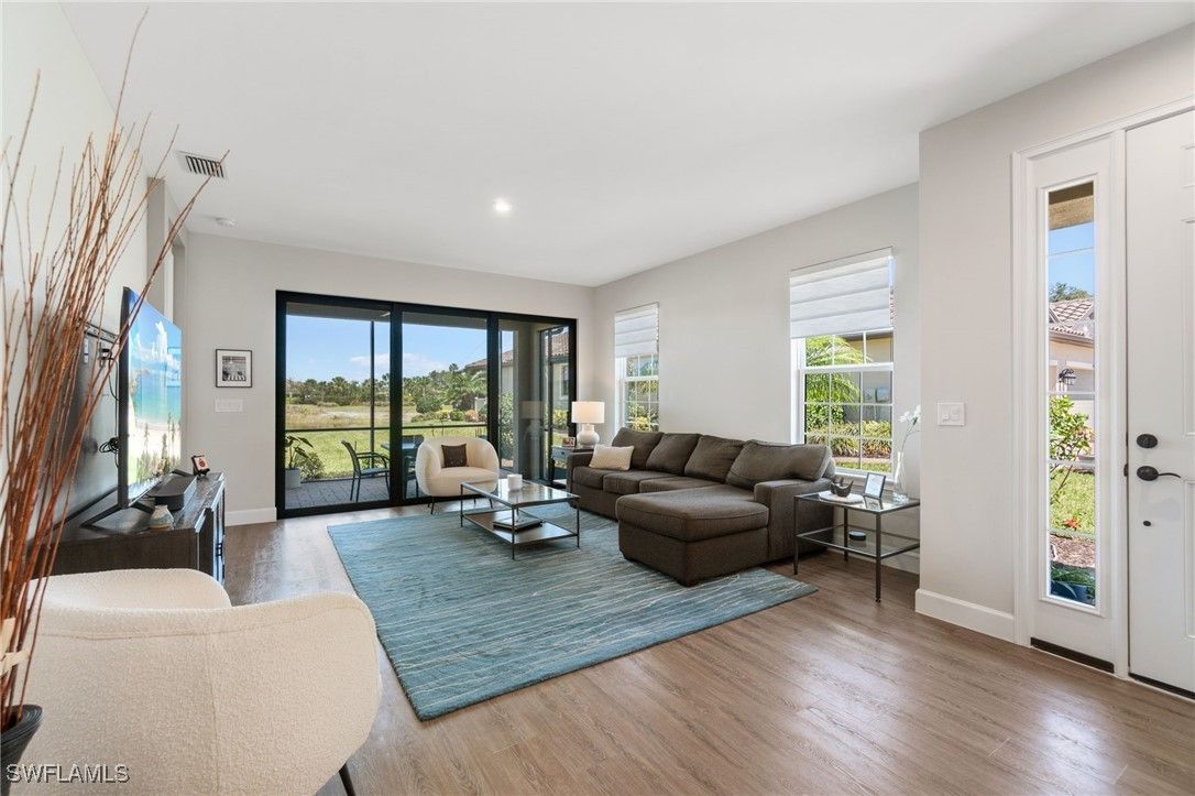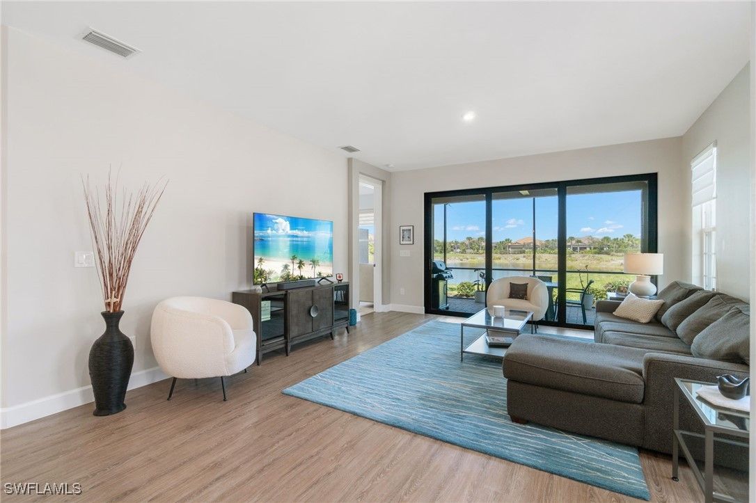 Step inside this meticulously maintained and beautifully upgraded 2020 attached villa, perfectly positioned on a premium waterfront lot with space to add your own private pool. Located in an X flood zone and equipped with full hurricane-impact doors and windows, this home offers peace of mind and worry-free living. The residence features two bedrooms plus a den and two full baths in a spacious split floor plan designed for comfort and privacy. The chef-inspired kitchen is highlighted by an oversized eat-in island, quartz countertops, solid wood cabinetry, high-end stainless steel appliances, and a stylish glass tile backsplash. Engineered vinyl plank flooring flows seamlessly throughout the main living spaces, complemented by solid wood doors, high-end finishes, and custom window treatments, including Hunter Douglas shades and plantation shutters. Enjoy outdoor living on the extended screened lanai, pre-plumbed for natural gas and ideal for entertaining, all while overlooking serene long lake views. As part of the sought-after Esplanade at Hacienda Lakes, residents enjoy an amenity-rich, gated community featuring a resort-style pool, state-of-the-art fitness center, pickleball, tennis, bocce, dining options, dog park, children’s playground, community fire pit, and a lively social calendar. With low HOA fees, this property offers the ultimate Naples lifestyle at an exceptional value—all under $500K