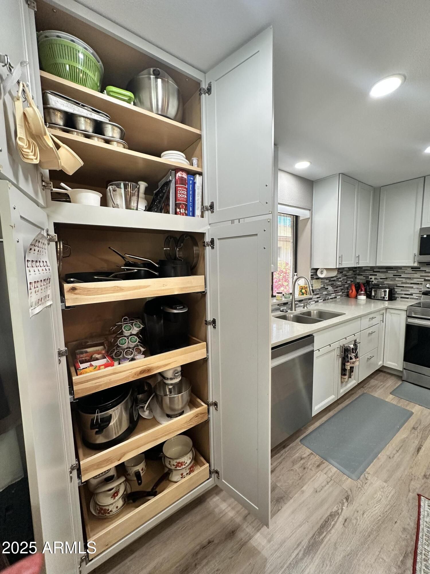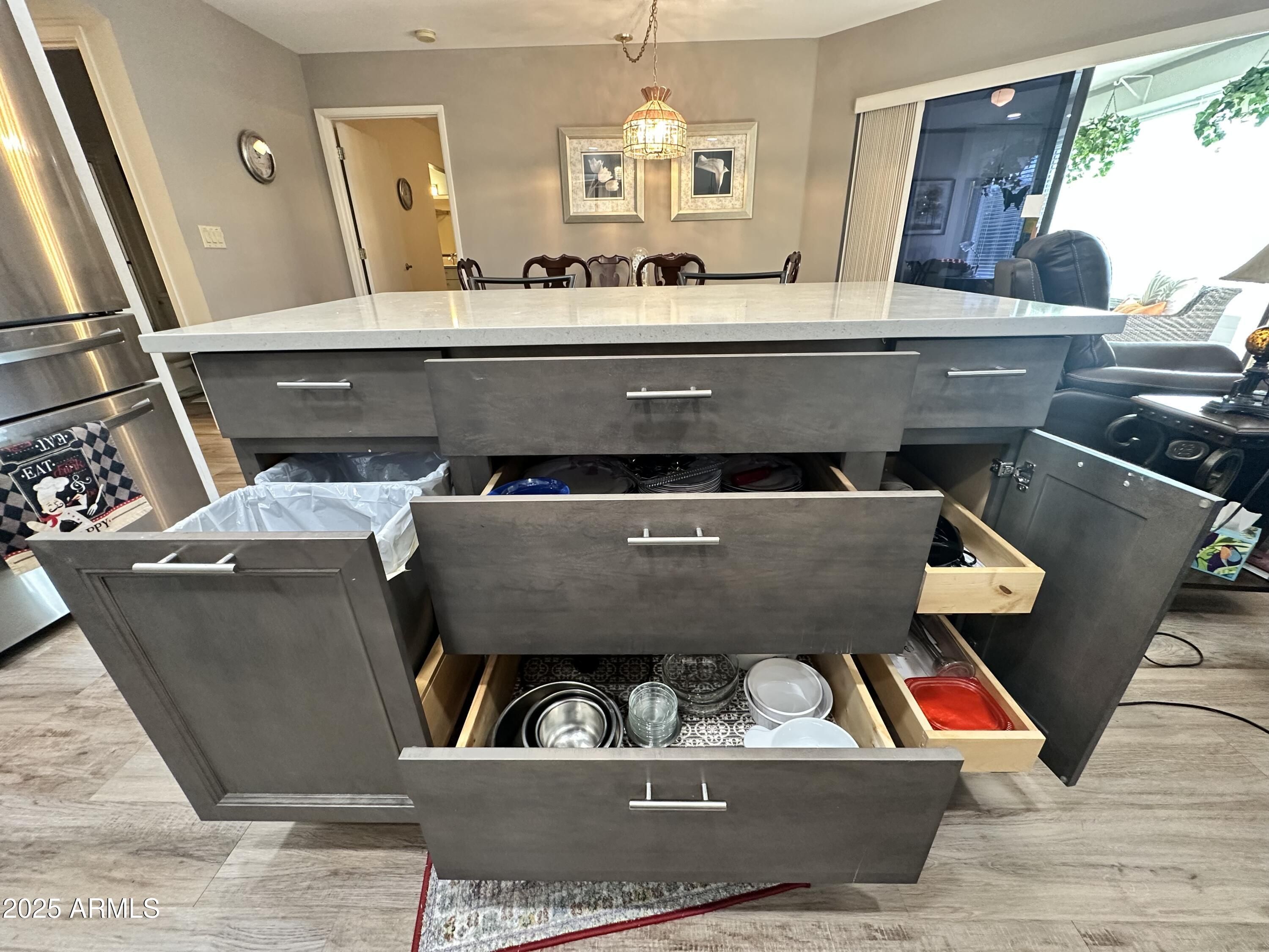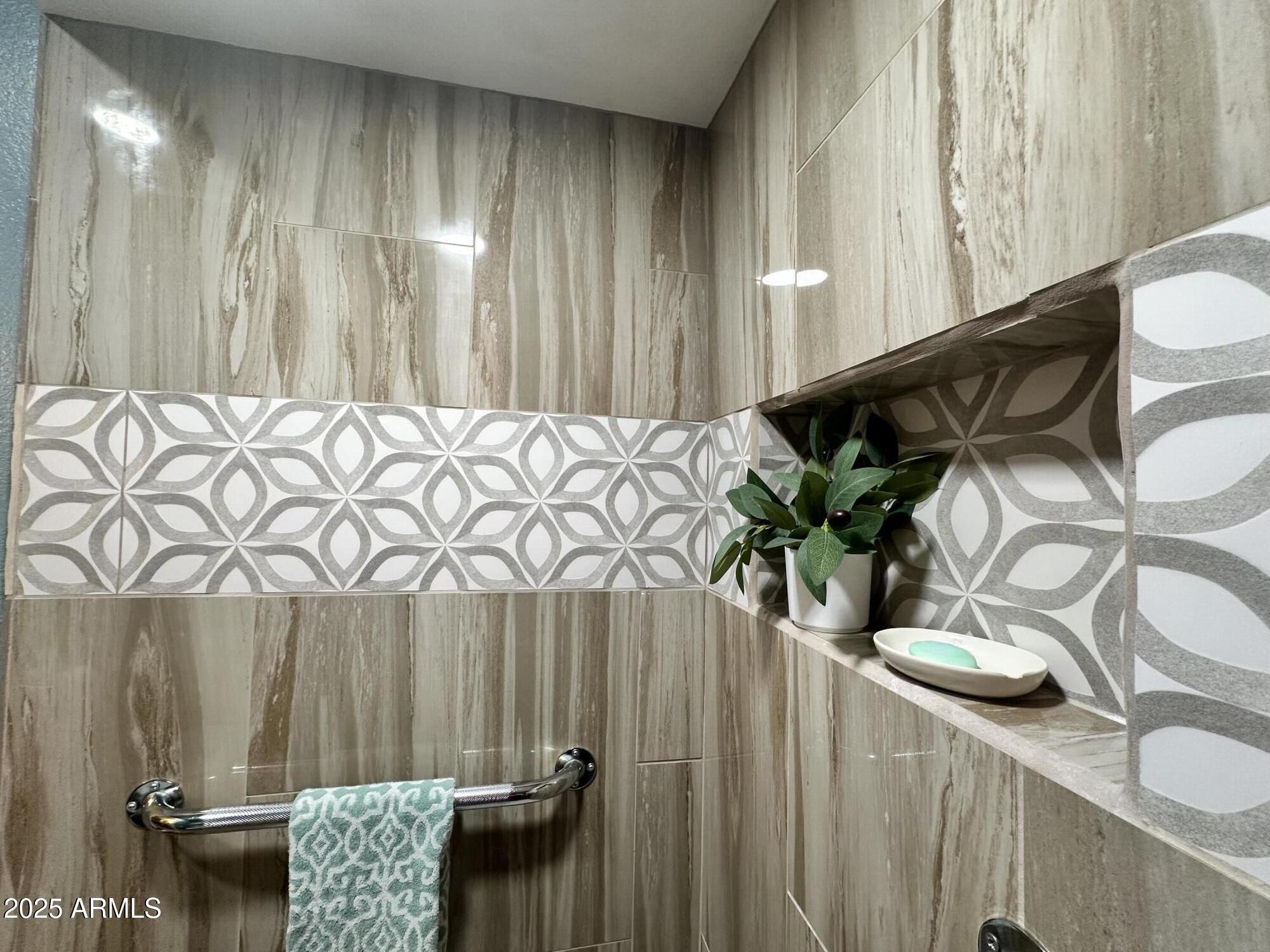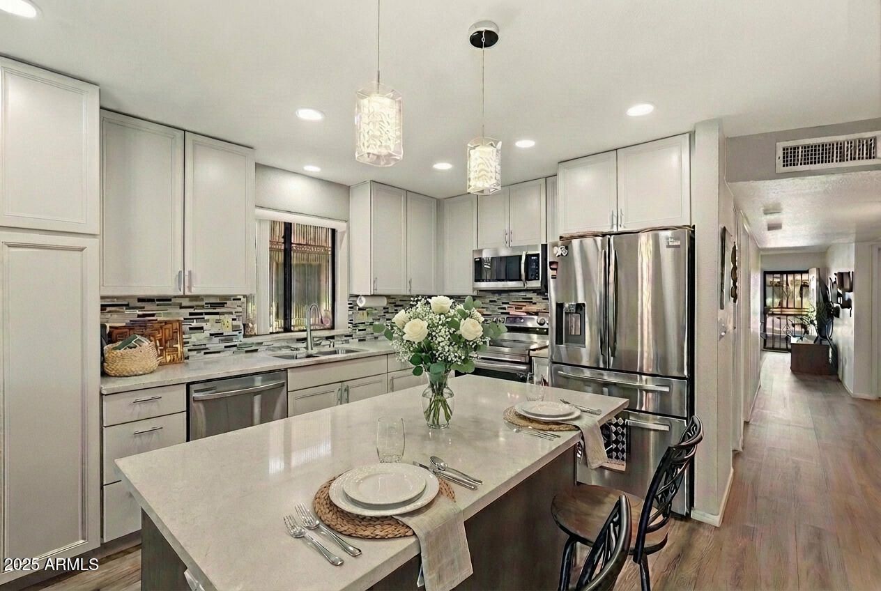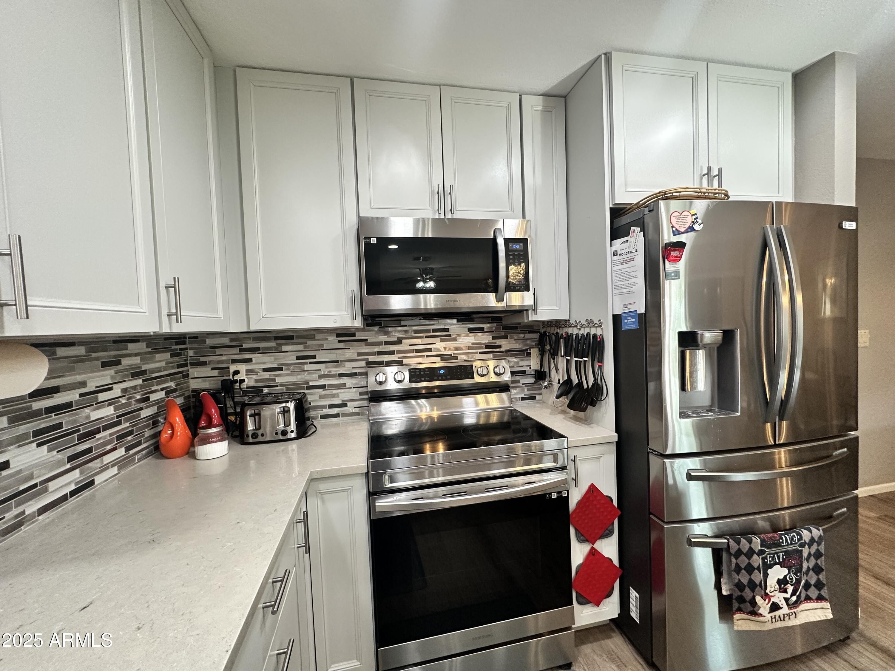 Beautifully remodeled 2 bedroom, 2 bathroom condo with a sought-after double garage, located in the amenity-packed community of Sunland Village East. Completely updated—no projects, no waiting—just move right in and start enjoying the SVE lifestyle. This light and bright condo features a welcoming front living room with a north-facing window and security door, flowing into an open family room and updated kitchen. The kitchen offers a center island, modern finishes, cabinetry with pull-outs, and all appliances convey. The spacious primary suite is located at the back of the unit and includes a walk-in closet and a beautifully remodeled bathroom with a raised vanity, dual sinks, and a gorgeous, tiled shower. The guest bedroom is conveniently located across from the guest bathroom with a tub/shower combinationideal for visitor privacy. Step into the sunny Arizona room overlooking green space, perfect for use as an extra sleeping area, home office, or bright craft/sewing room. The condo's location provides added privacy with no neighboring unit directly behind. Additional highlights include an inside laundry room with utility sink, cabinetry, and washer and dryer. Sunland Village East offers resort-style amenities including golf, tennis, pickleball, heated pools, and countless social activities. No pets are allowed in this section of the community. Sellers will be taking some personal items; select furnishings may be available to convey with the condo.