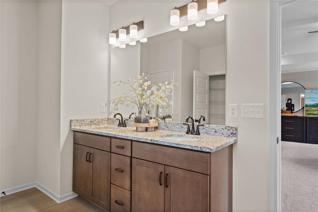 Move-In Ready April! The Harrington plan by Smith Douglas Homes in the Glen at Cave Springs community offers the perfect blend of modern design, space, and comfort in a prime Douglasville location. This two-story new construction home is one of our most popular floorplans, featuring an inviting wide foyer that opens to an expansive open-concept living area with an inviting fireplace—ideal for everyday living and entertaining. The inspiring kitchen boasts 42" upgraded cabinets, granite countertops, tile backsplash, a large center island, and a walk-in pantry, all overlooking the family room. Dining room off the front entry for more formal gatherings and a large 10x20 patio for outdoor entertaining. Luxury Vinyl Plank flooring enhances the first floor, laundry room and second story baths. Open iron staircase leads upstairs to the spacious primary suite that impresses with a tray ceiling, a tiled shower, and a walk-in closet. Three additional bedrooms, a full bath, and a convenient laundry room complete the second floor. Enjoy 9ft ceilings on both levels, energy-efficient features, and builder incentives with preferred lender. Experience the best of Douglasville new construction living at Glen at Cave Springs with a planned pool, walking trail and more—where comfort, style, and convenience meet!