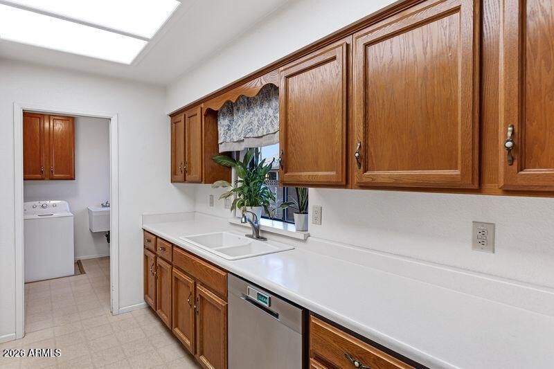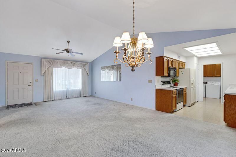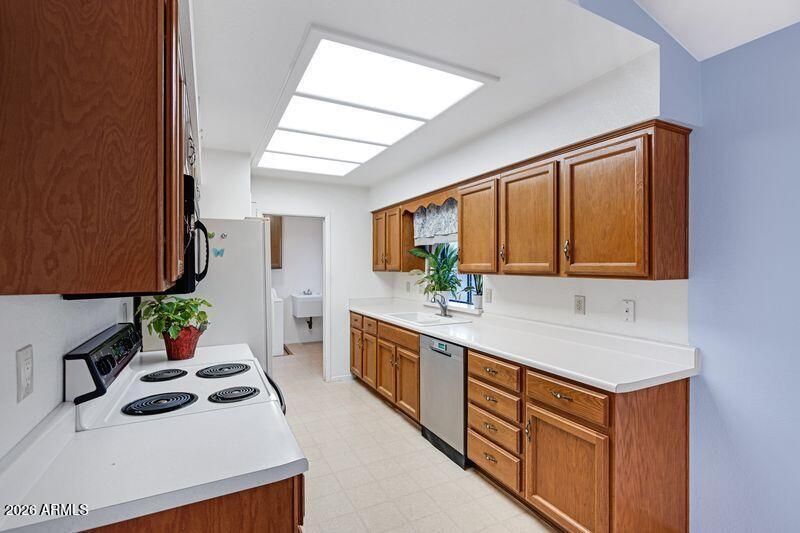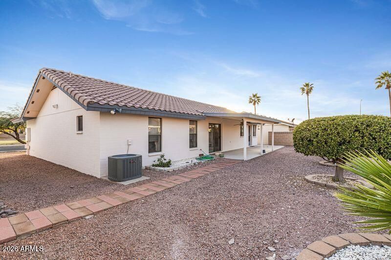 Highly desired great room floor plan perfectly situated across from the greenbelt! Very well kept and charming home in the Active Adult community of Sunland Village East. Custom cathedral ceilings, lots of storage space, huge laundry room with a utility sink and built in cabinets, custom changes to the primary bathroom, walk-in closet with solar tube for extra lighting, ceiling fans throughout, security screen door, new HVAC unit in 2018, new exterior trim paint, covered patio, low maintenance landscaping with beautiful backyard rose bushes and fruit trees, attached storage shelves in garage and Refrigerator, Washer & Dryer are included! Priced to sell, this one is a GEM!