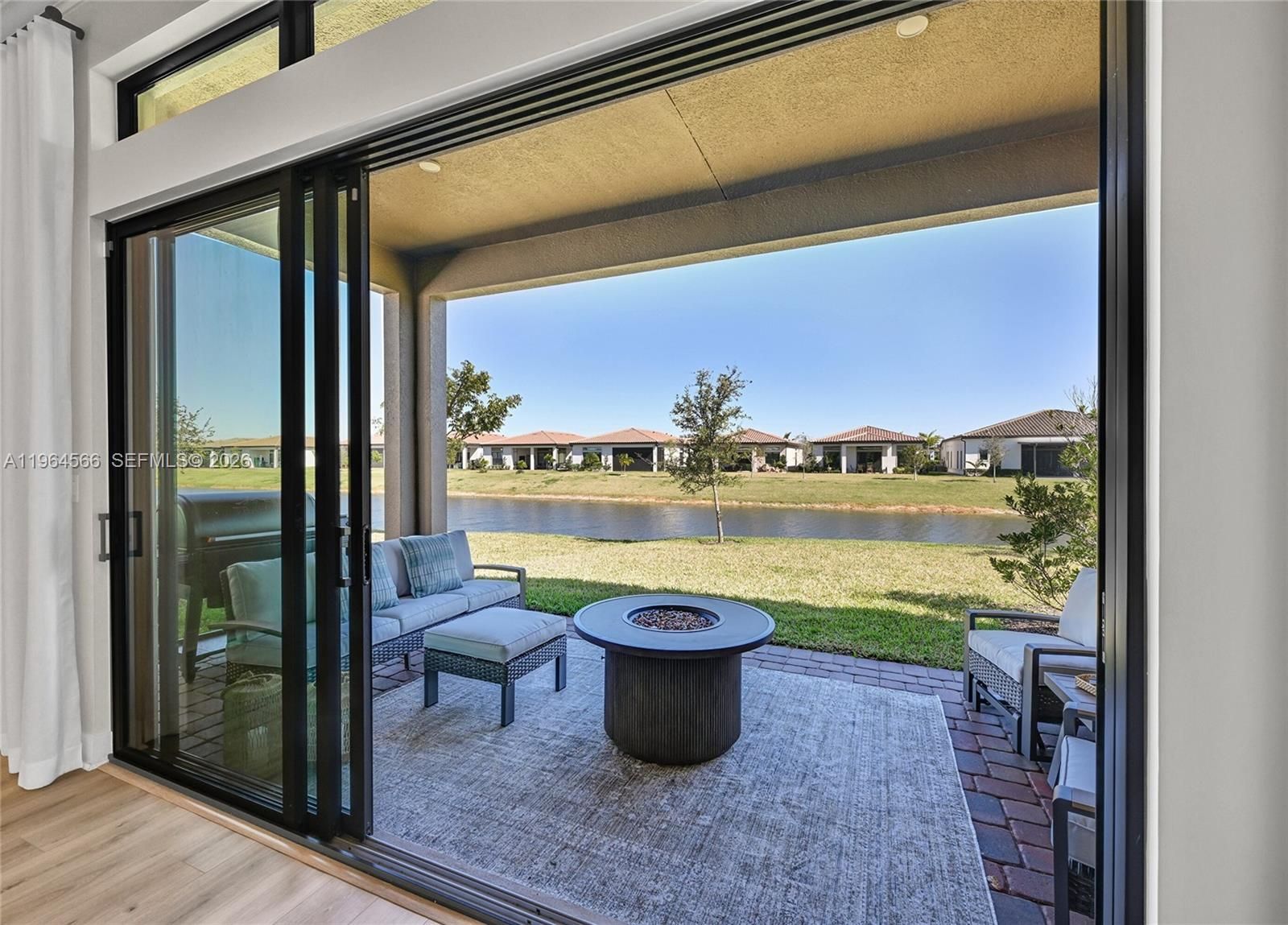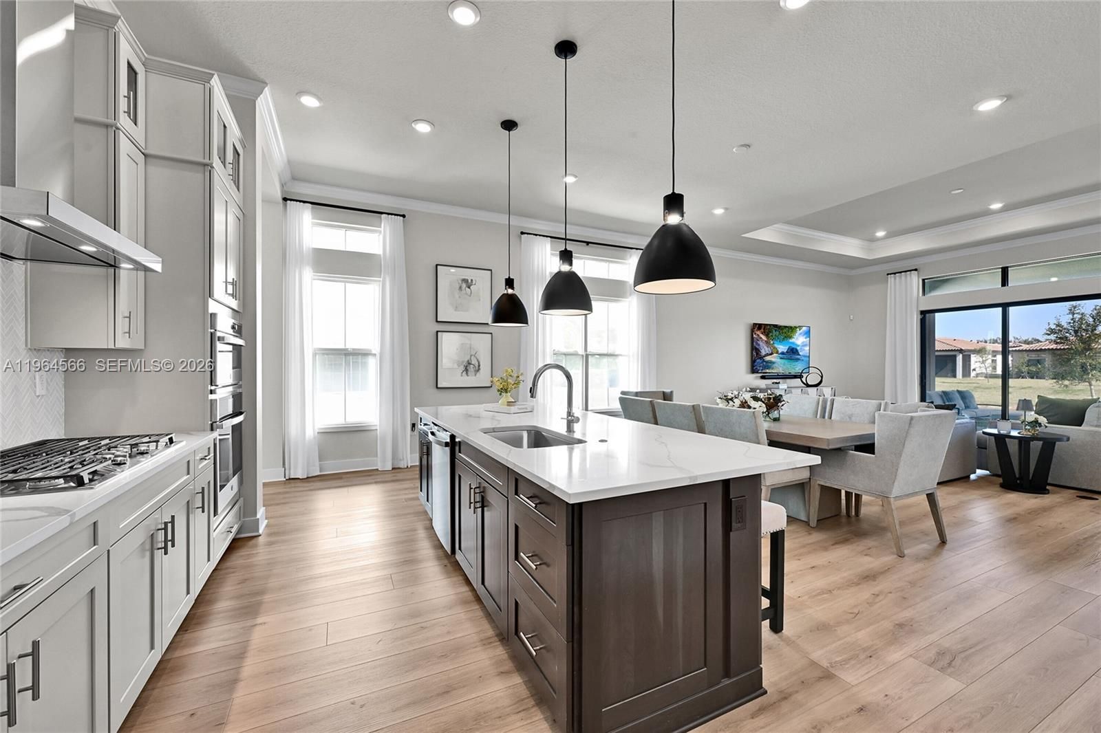 Move-in ready 2023 Antigua Grande Model on the lake in The Falls at Parkland, a 55+ gated community. This 2,709 sq ft home offers 3 bedrooms, 2.5 baths, with builder and owner upgrades. Designer kitchen with light gray cabinetry, dark brown oversized island, quartz countertops, gas cooktop, and custom walk-in pantry. High and tray ceilings, wood-finished flooring throughout, crown molding, and recessed lighting. Other features include custom built-in closets, laundry room cabinetry, epoxy garage flooring, ceiling storage lift, tankless water heater, and whole-home water softener. Covered patio with lake views. Residents enjoy a 24,000± sq ft clubhouse with resort-style amenities, including a pool. Furniture optional.