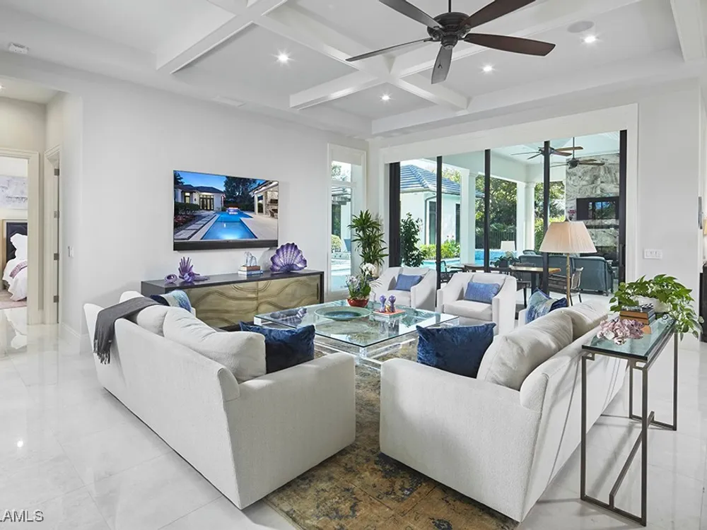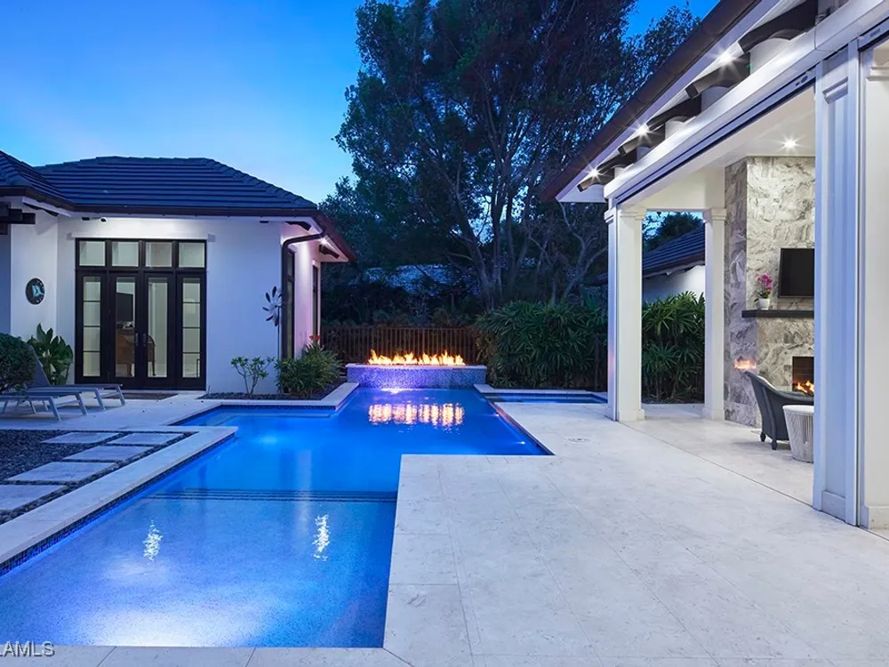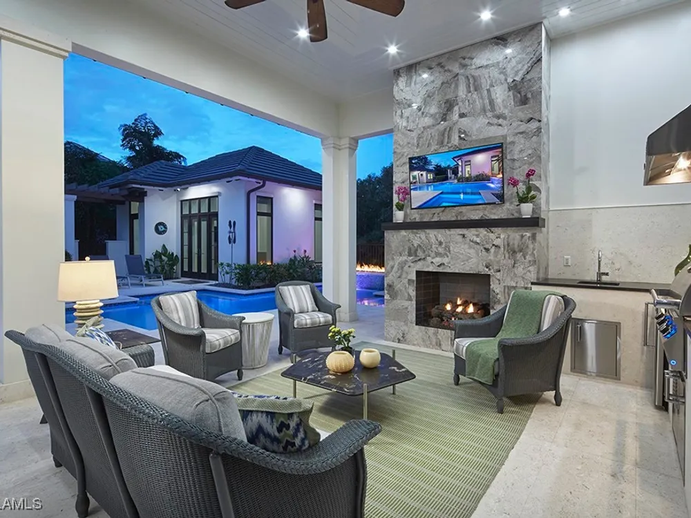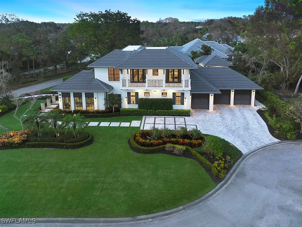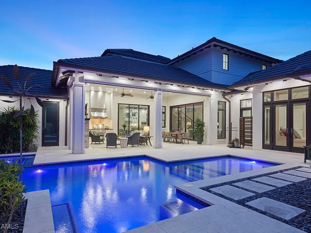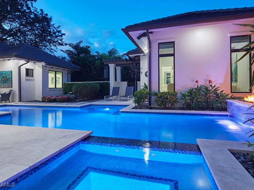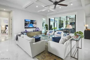Discover unparalleled luxury in this 2018-built masterpiece located in the prestigious Oakmont subdivision of Pelican Bay. Perfectly positioned on a generous 0.38-acre corner lot in a quiet cul-de-sac, this exquisite residence offers 4,607 square feet under air and 6,137 square feet under roof. Set at a high elevation with no history of storm flooding, the home provides both peace of mind and refined living. Inside, soaring vaulted and tray ceilings, a striking open floating staircase, and gleaming marble floors highlight the home’s sophisticated design, while natural light pours in through Anderson impact windows. The chef’s kitchen is a showstopper, featuring Cristallo quartz countertops, Wolf and Sub-Zero appliances, a spacious eat-in island, wine cooler, and walk-in pantry—ideal for everyday comfort and upscale entertaining. The thoughtfully designed layout includes four en-suite bedrooms and a formal dining room that can double as a den. Upstairs, two guest suites and a spacious loft offer flexible living options. A detached casita provides a private fourth bedroom, perfect for guests or a home office, and two laundry rooms—one on each floor—add everyday convenience. Step outside into your private outdoor oasis. The expansive lanai features a summer kitchen and dramatic floor-to-ceiling marble fireplace, perfect for entertaining. Enjoy the saltwater pool with sun shelf and integrated spa, surrounded by lush landscaping, built-in seating, and complete privacy. An outdoor shower adds to the resort-like experience. Additional highlights include a three-car garage, motorized hurricane screens, and a new 24kW whole-house generator. Ideally located within the community, this home offers easy access to Pelican Bay’s world-class amenities: nearly three miles of private beach, beachfront restaurants, a state-of-the-art fitness center, 18 Har-Tru tennis courts, and upcoming pickleball courts. You're also just minutes from Waterside Shops, Artis–Naples, and a variety of upscale dining and shopping options. This exceptional property seamlessly blends elegance, comfort, and an unbeatable location—delivering the ultimate Naples lifestyle.