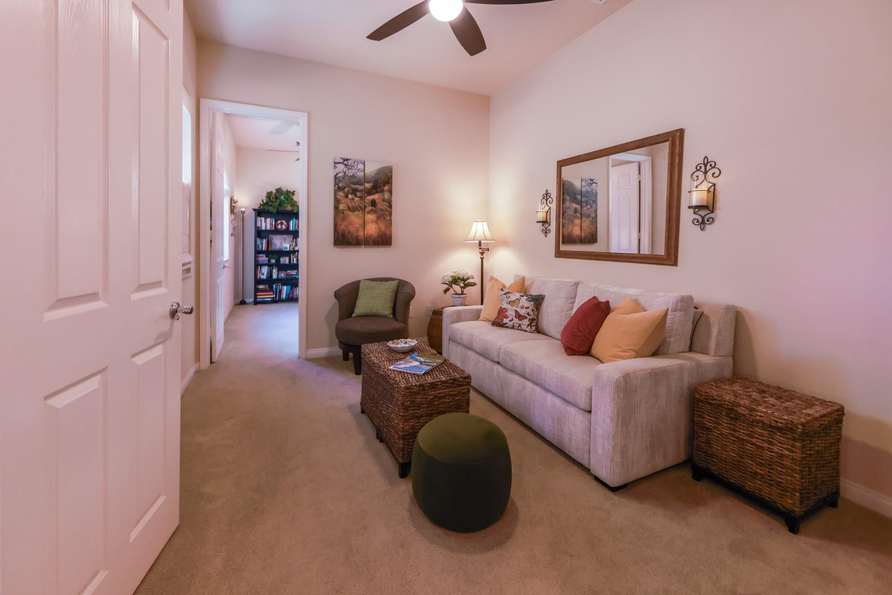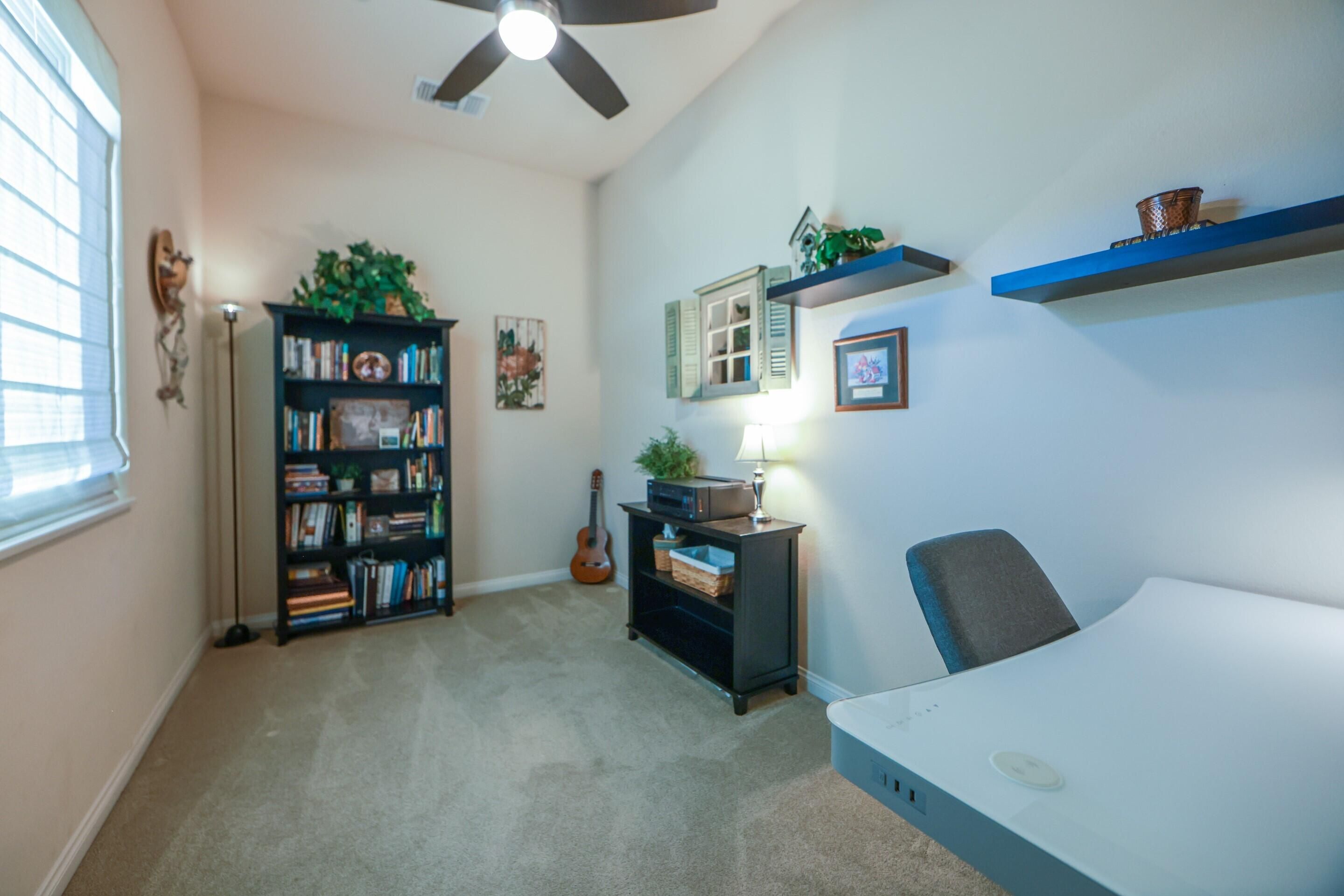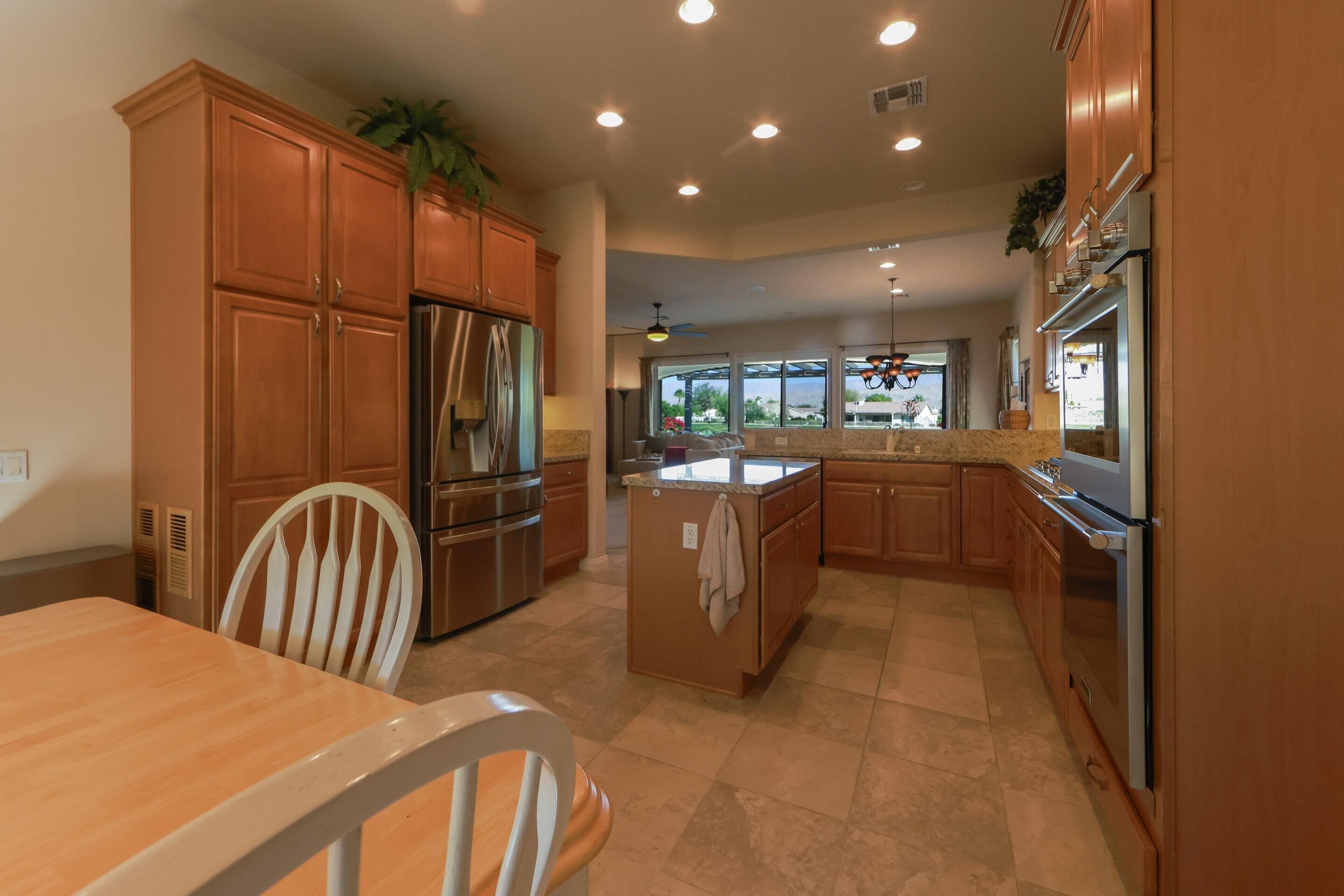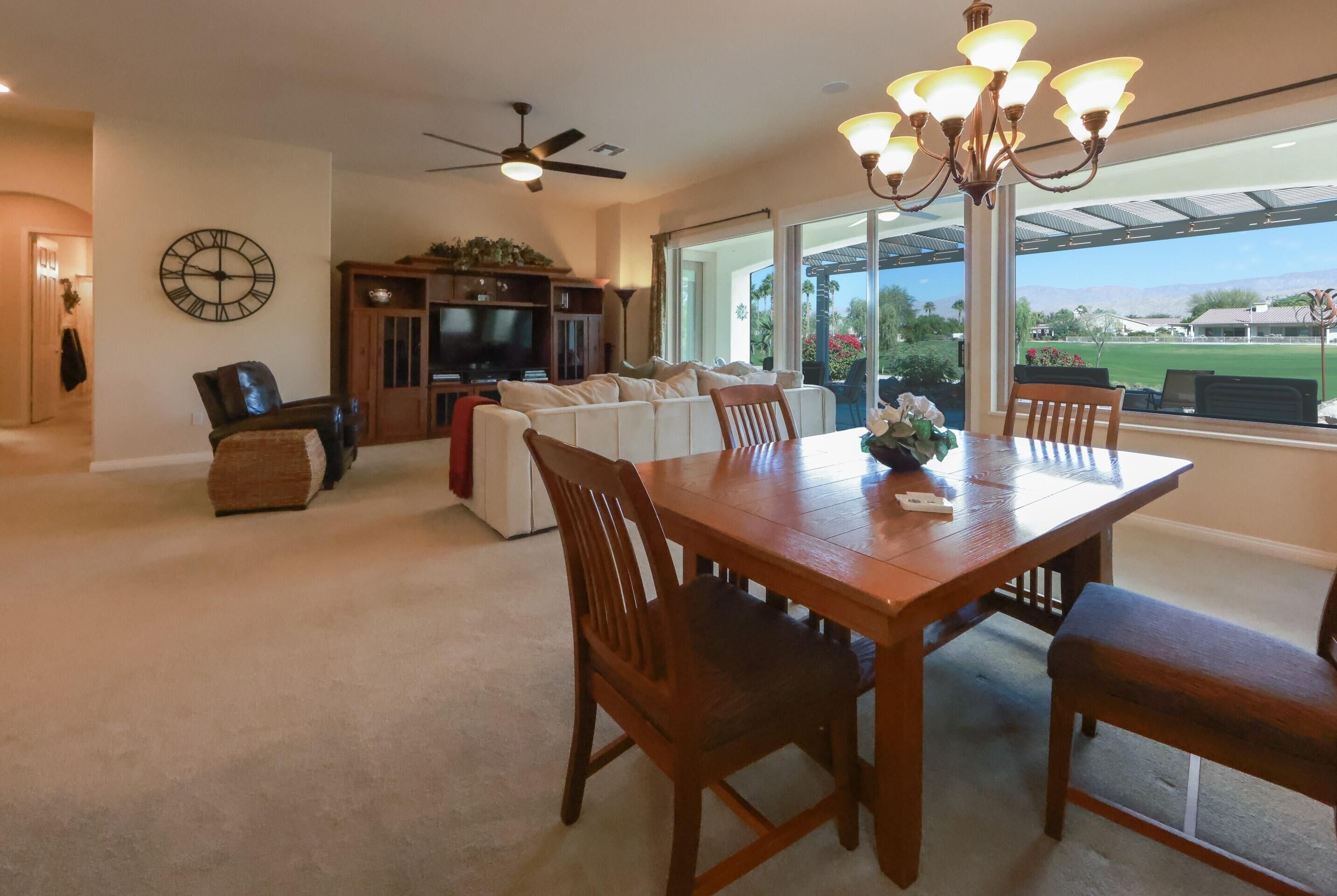 Enjoy stunning golf course, lake, and Chocolate Mountain views from this beautifully upgraded San Benito model, perfectly positioned on the 13th tee of the South Course in highly sought-after Sun City Shadow Hills Phase I. This spacious and thoughtfully designed home features 2 bedrooms, 2 baths, a den/office, and an additional bonus room, offering flexible options for guests, work, hobbies, or a quiet retreat. The open-concept Great Room showcases large view windows and flows seamlessly into the chef's kitchen, complete with slab-granite countertops, stainless steel appliances, a center island, double ovens, a breakfast bar, and a bright breakfast nook. Motorized shades in the Great Room, kitchen, and primary suite add comfort and convenience throughout. The primary suite is a private haven with backyard access, dual vanities, a soaking tub, separate shower, and an oversized walk-in closet, while the guest bedroom and bonus spaces provide versatility for a wide range of lifestyle needs. Step outside to a beautifully designed north-facing backyard oasis offering cooler year-round enjoyment, featuring a remote-controlled raised spa with water feature, a 2023 fire pit, extended Alumawood patio cover with hung lighting, and thoughtful landscape lighting that enhances evening ambiance. The lot orientation provides excellent natural protection from seasonal winds while capturing peaceful pond, fairway, and mountain views. Significant upgrades add comfort and efficiency, including new windows installed in 2020, an HVAC system approximately eight years old, motorized blinds added in late 2020, ceiling fans in every room including the bathrooms (installed in 2021), Corian window sills, and an air-conditioned attic for improved temperature control. The oversized 2-car plus golf cart garage is another highlight, featuring a 2021 mini-split A/C system, overhead storage, insulated doors, and plenty of room for tools or seasonal belongings. With panoramic views, carefully selected upgrades, and inviting indoor-outdoor living spaces, this home offers the perfect blend of comfort, quality, and resort-style living in one of the desert's most desirable 55+ communities.