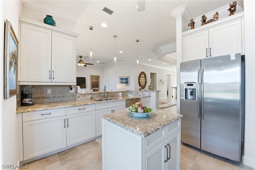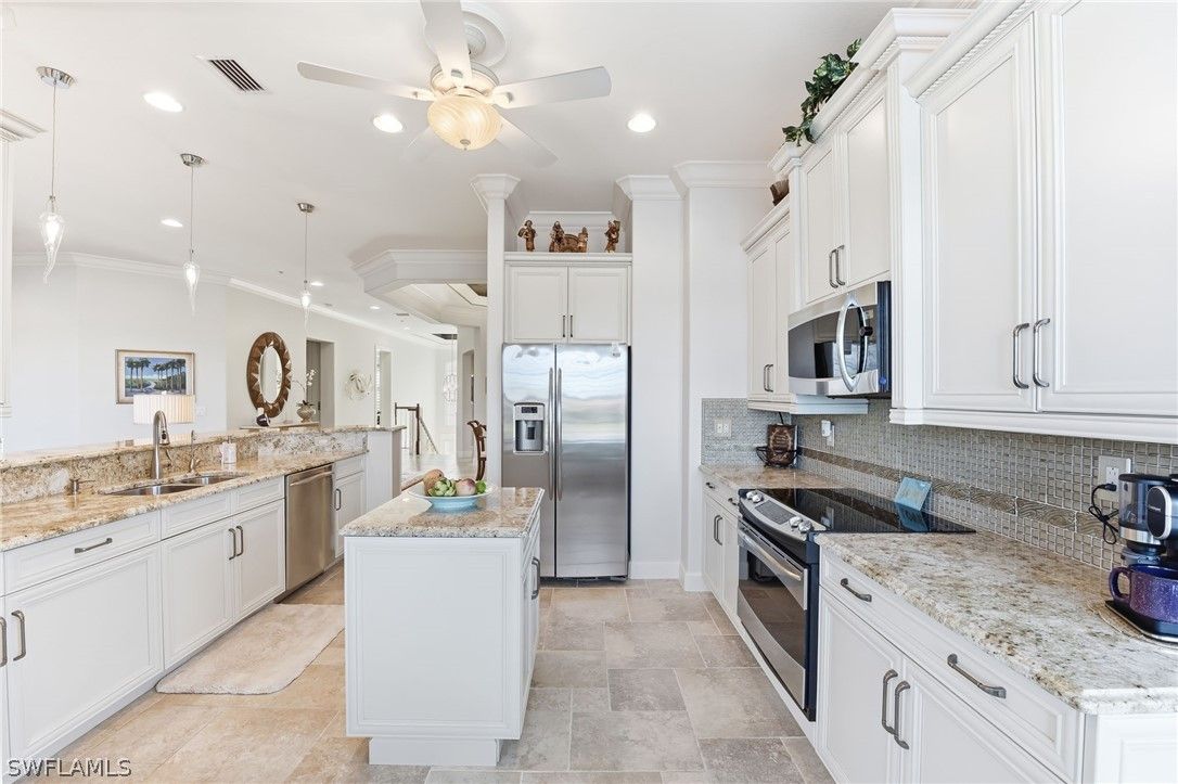 Welcome to the crown jewel of Players Cove at Lely Resort. This stunning Medallion floor plan occupies unquestionably the premier location within the community, offering breathtaking panoramic lake and golf course views from every possible vantage point within the home. Spanning an impressive 2,743 square feet, this second-floor residence has been meticulously updated with designer light fixtures and high-end finishes that reflect a sophisticated modern aesthetic. The heart of this three-bedroom plus den home is the gourmet island-style kitchen, which features upgraded cabinetry, granite countertops, and premium stainless-steel appliances. The expansive living areas flow seamlessly toward the view, accented by elegant crown molding and the refined touch of plantation shutters throughout. For ultimate relaxation, the spacious master suite serves as a private sanctuary highlighted by a contemporary open-design shower and luxury appointments. Beyond its interior beauty, this move-in-ready gem provides total peace of mind with high-impact glass doors and windows. Every detail of this three- bathroom residence has been carefully curated to offer a lifestyle of timeless style and unparalleled comfort. Whether you are enjoying a quiet morning on the lanai or entertaining guests against the backdrop of a Florida sunset, this property represents the very best of Lely Resort living. As a resident, you unlock the doors to the famed, Eight-time Club of the Year, Players Club and Spa. Imagine your weekends spent by the cascading 22- foot waterfall pool, enjoying drinks at the tiki hut, or challenging friends on the premier tennis and pickleball courts. With gourmet restaurants, a state- of-the-art fitness center, a full spa, and three championship golf courses all at your fingertips. This home perfectly blends luxury upgrades with a world-class resort lifestyle. Start living your best life today. Live, Laugh, and Love the Lely Lifestyle!