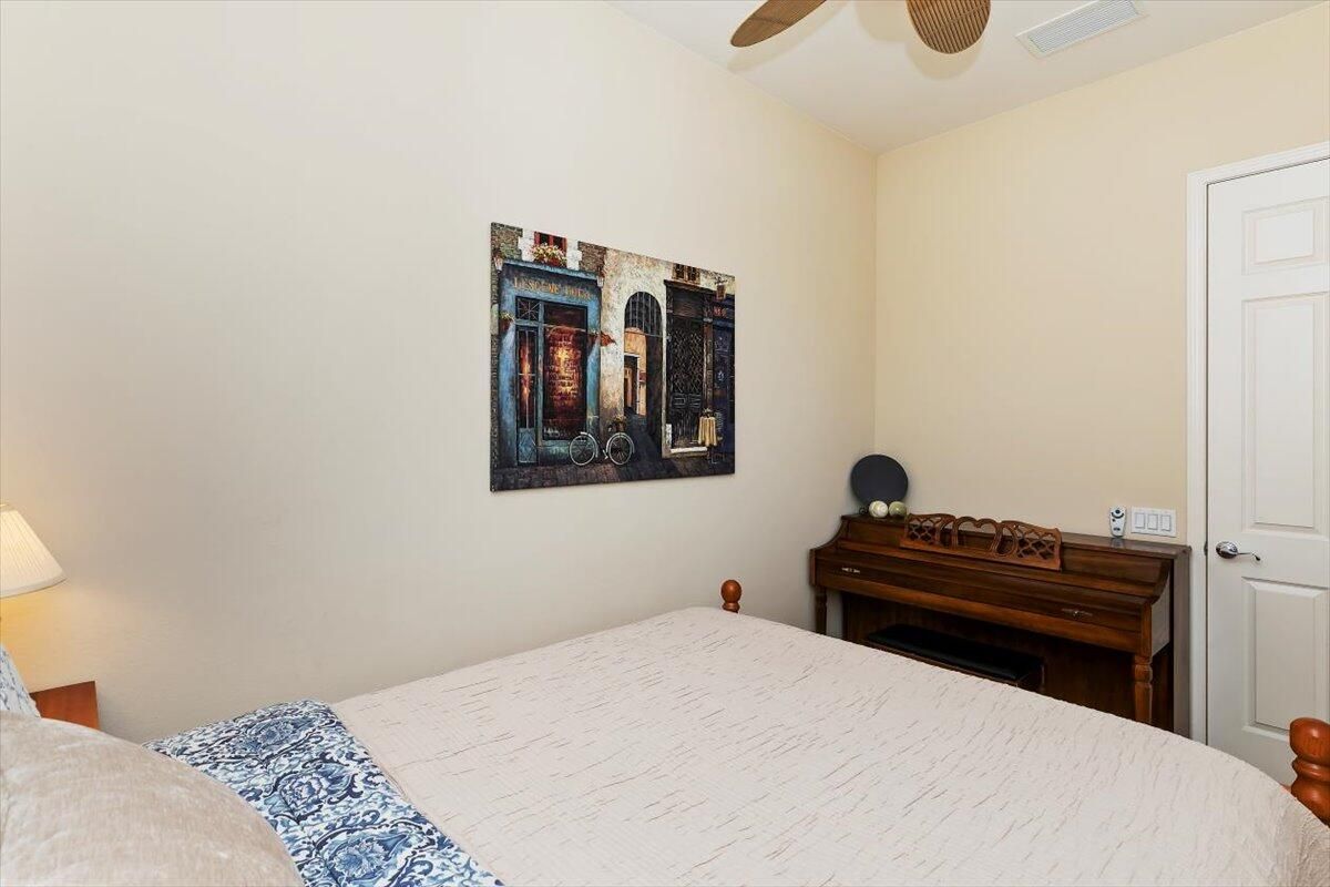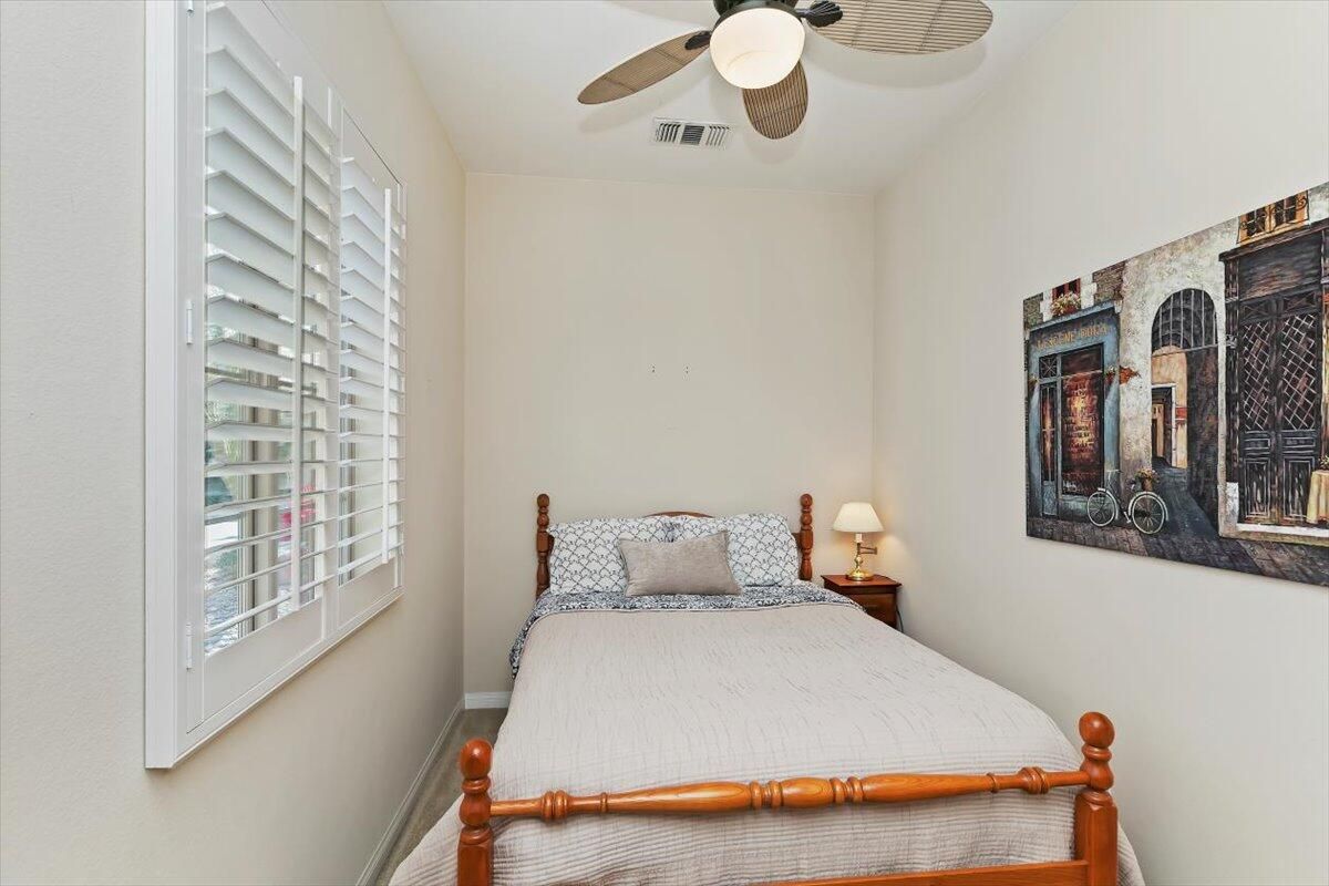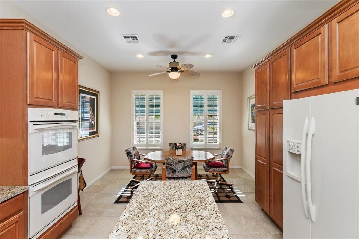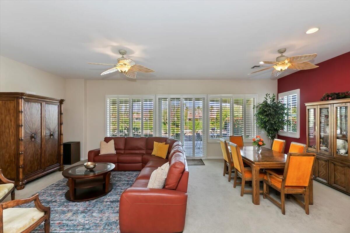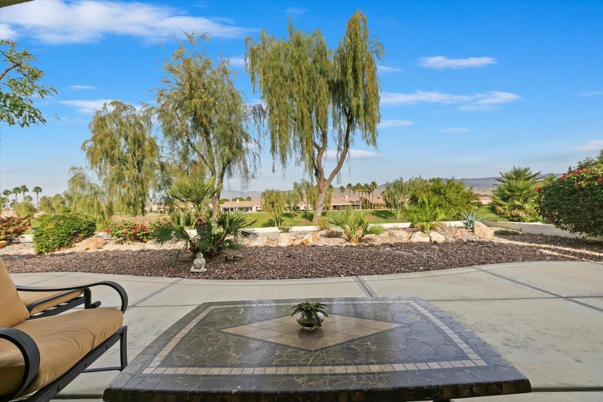 Perfectly positioned along the 12th tee of the South Course in Sun City Shadow Hills Phase I, this beautifully enhanced San Benito model captures sweeping views of the golf course, tranquil water features, and the Chocolate Mountains beyond. The setting, orientation, and layout come together to create an exceptional desert living experience. Inside, the home offers a flexible and well-planned design featuring 2 bedrooms, 2 bathrooms, a den/office, and an additional bonus room, allowing space for guests, hobbies, work-from-home needs, or a private retreat. The Great Room is filled with natural light and expansive windows that frame the outdoor scenery, seamlessly connecting to the open kitchen and dining areas. The kitchen is thoughtfully appointed with slab granite countertops, double ovens, a center island, breakfast bar seating, modern and a cheerful breakfast nook, making it ideal for both everyday living and entertaining. The primary suite provides a comfortable escape with direct backyard access, dual vanities, a soaking tub, separate shower, and an oversized walk-in closet. Guest accommodations and bonus spaces are equally versatile and inviting. Step outside to a north-facing backyard designed for year-round enjoyment, offering cooler afternoon shade, natural wind protection, and peaceful pond and fairway views. Low-maintenance landscaping in both the front and rear yards enhances the home's ease of ownership and lock-and-leave appeal. Additional features include plantation shutters throughout and an oversized 2-car garage with dedicated golf cart space. With its ideal lot orientation and scenic backdrop, this home delivers comfort, quality, and resort-style living in one of the Coachella Valley's most sought-after 55+ communities.