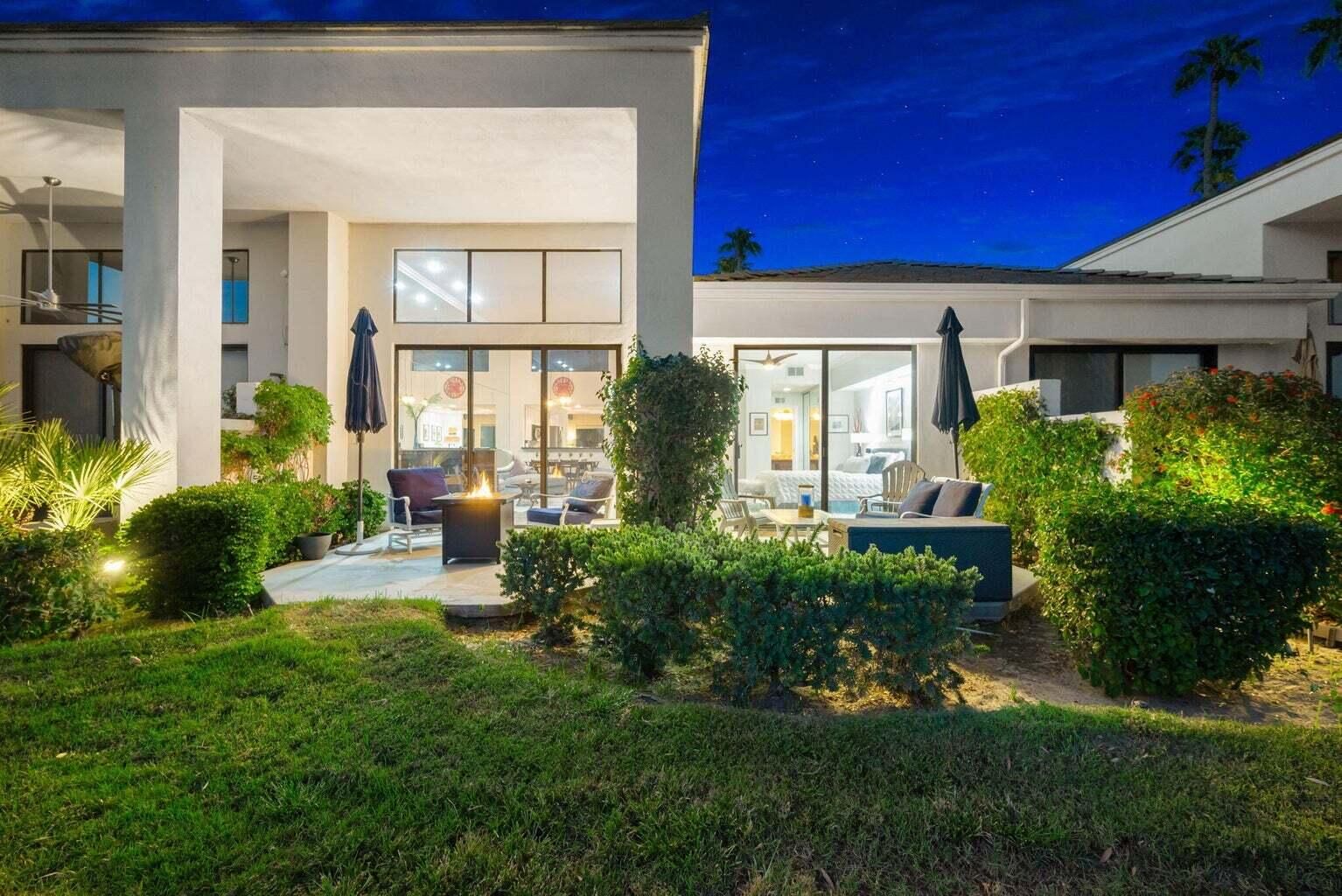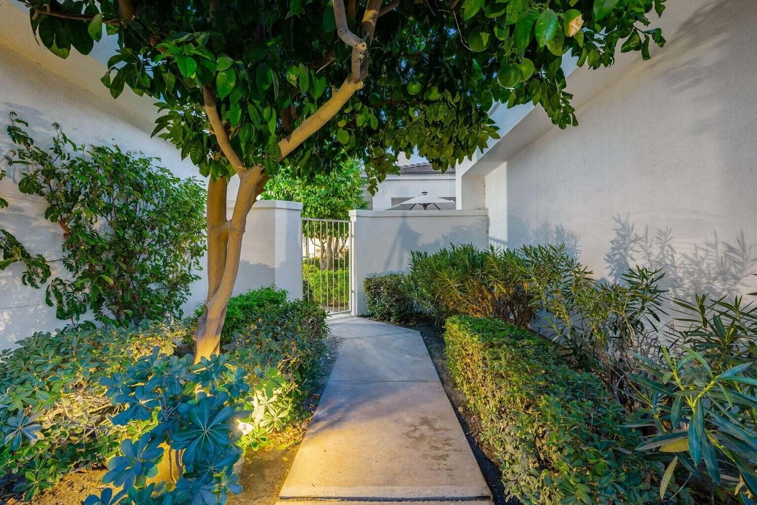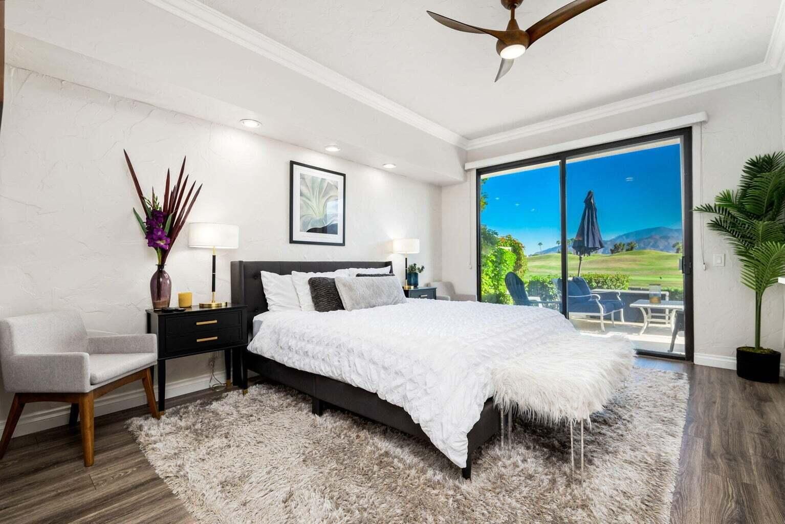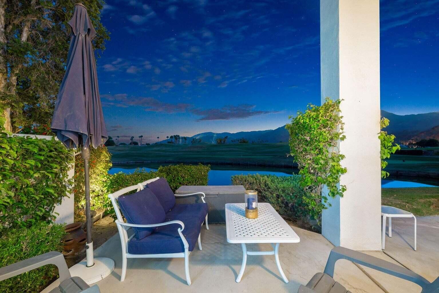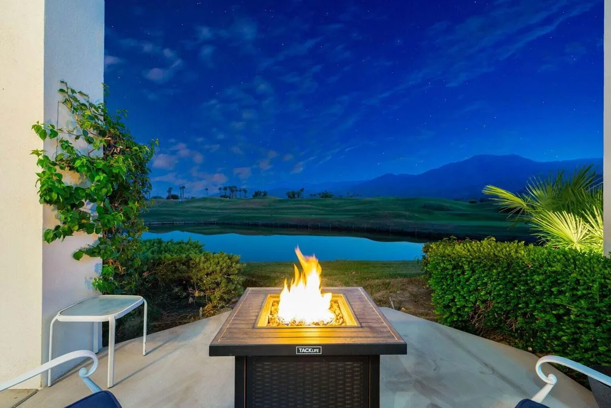 Walls of glass frame panoramic southern views of lake, fairway, and Santa Rosa mountains from the moment you enter this PGA West residence, set on the iconic Par 3 13th hole of the Pete Dye Stadium Course. This sought-after Champion 2 floor plan offers soaring ceilings, true indoor-outdoor flow, and a compelling alignment of golf, water, and mountain views. The residence features two bedrooms plus a versatile den and a thoughtfully designed kitchen with stone counters, stainless appliances including a newer refrigerator, and a clean, Scandinavian-inspired aesthetic that carries throughout the home. Well-appointed baths with walk-in showers and refined finishes complement the cohesive design, while a newer air-conditioning system adds everyday comfort and efficiency. A private courtyard and golf-view patio extend the living space, creating effortless indoor-outdoor living. A two-car garage with EV charging station adds modern convenience. Ideally located near community pools, spas, and clubhouse amenities, with access to championship golf, dining, clubhouse and 24-hour guard-gated security. Offered turnkey furnished for immediate enjoyment in one of PGA West's most visually striking settings.