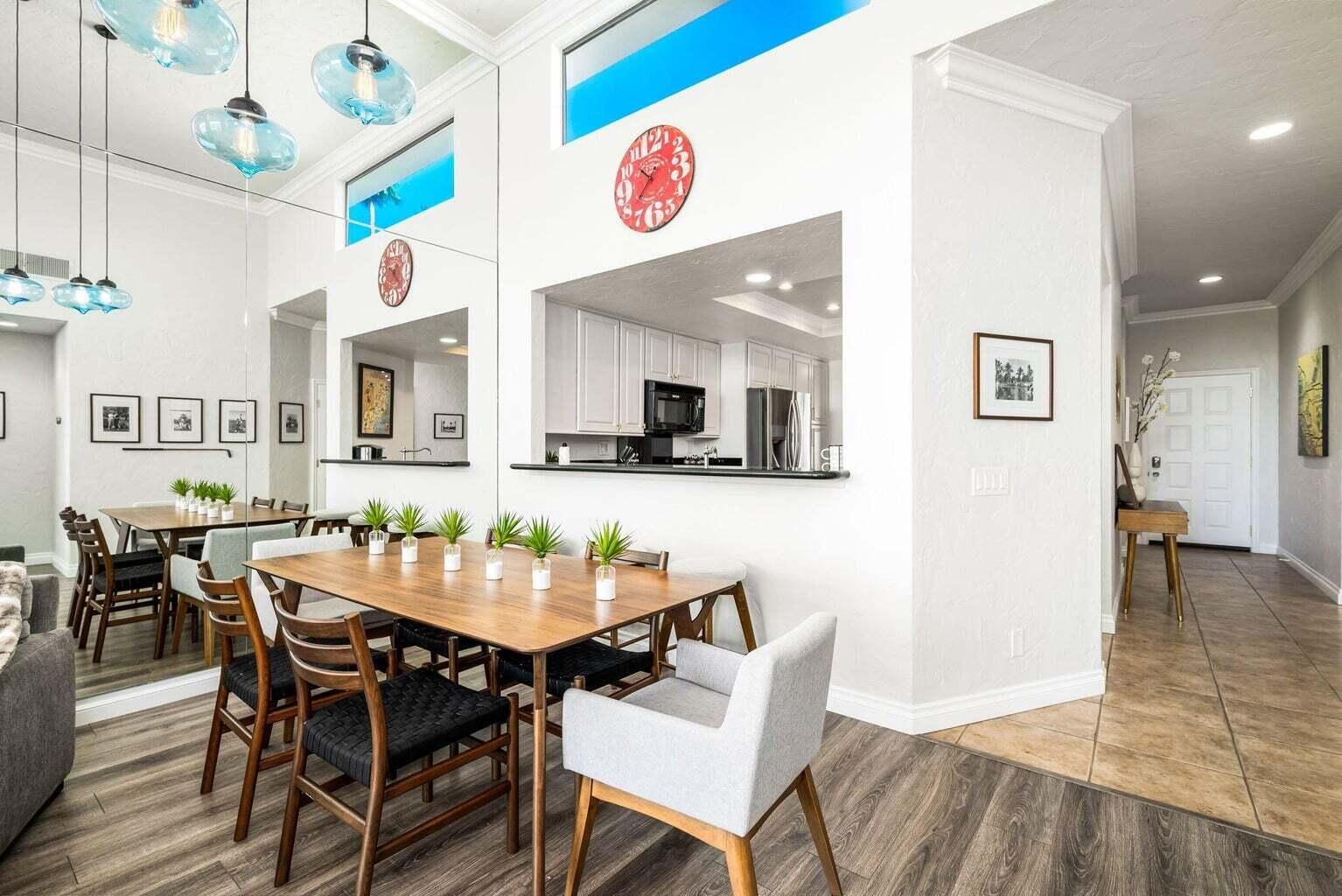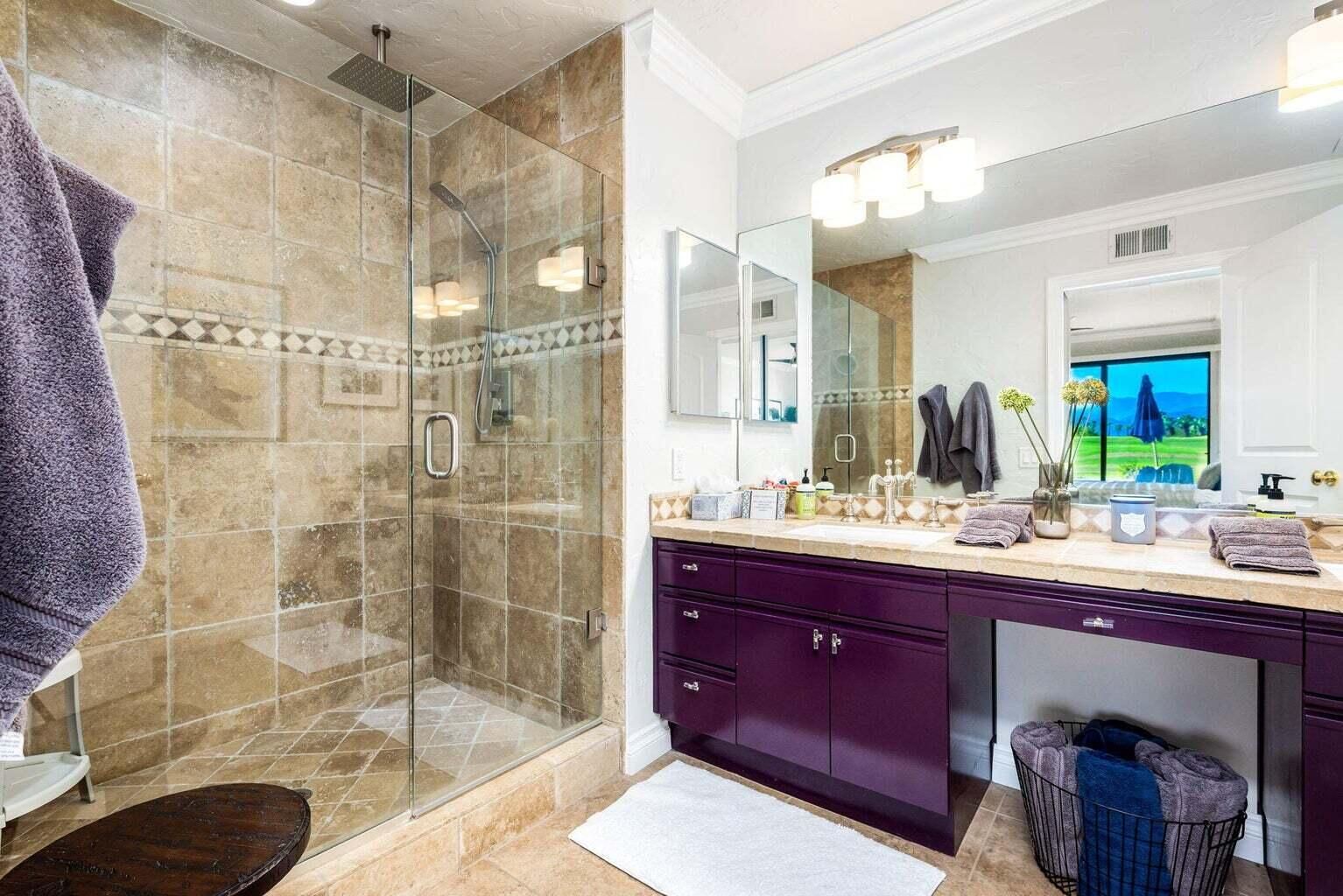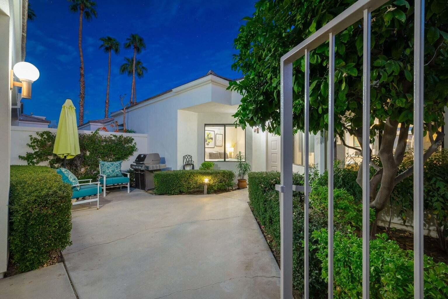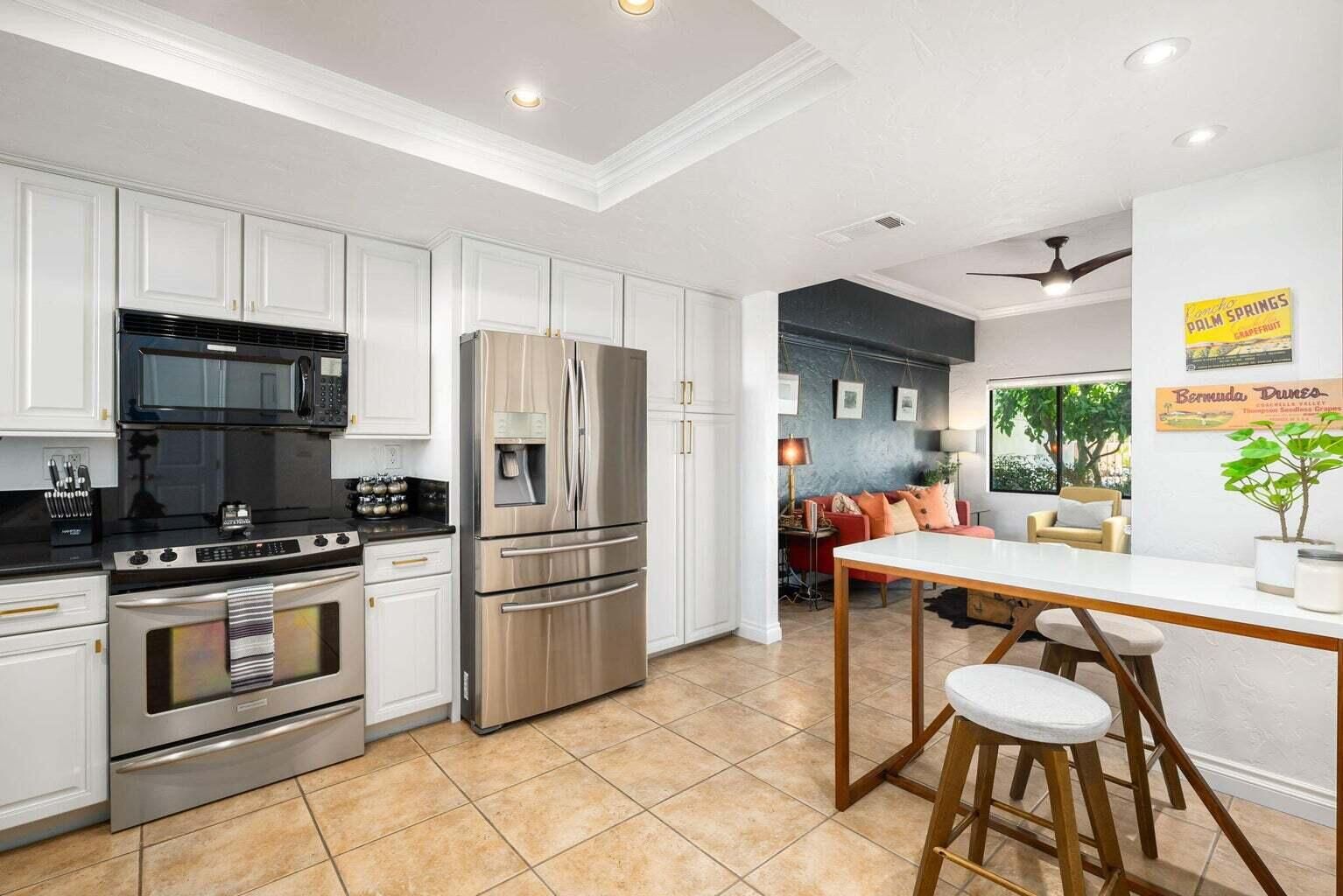 Walls of glass frame panoramic southern views of lake, fairway, and Santa Rosa mountains from the moment you enter this PGA West residence, set on the iconic Par 3 13th hole of the Pete Dye Stadium Course. This sought-after Champion 2 floor plan offers soaring ceilings, true indoor-outdoor flow, and a compelling alignment of golf, water, and mountain views. The residence features two bedrooms plus a versatile den and a thoughtfully designed kitchen with stone counters, stainless appliances including a newer refrigerator, and a clean, Scandinavian-inspired aesthetic that carries throughout the home. Well-appointed baths with walk-in showers and refined finishes complement the cohesive design, while a newer air-conditioning system adds everyday comfort and efficiency. A private courtyard and golf-view patio extend the living space, creating effortless indoor-outdoor living. A two-car garage with EV charging station adds modern convenience. Ideally located near community pools, spas, and clubhouse amenities, with access to championship golf, dining, clubhouse and 24-hour guard-gated security. Offered turnkey furnished for immediate enjoyment in one of PGA West's most visually striking settings.
