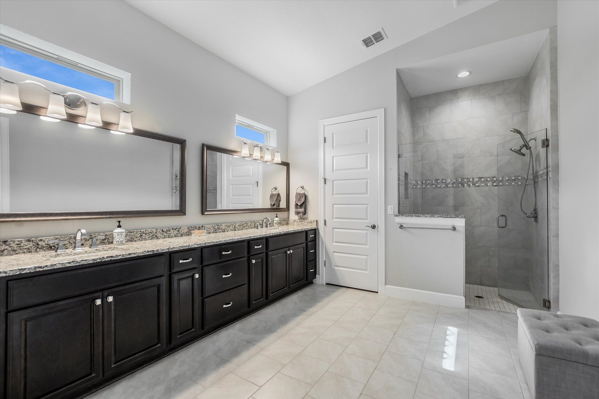 - Breakfast Bar, Ceiling Fan(s), Double Vanity, Granite Counters, High Ceilings, Kitchen Island, Main Level Primary, Multiple Primary Bathrooms, NoInteriorSteps, Open Floorplan, Pantry, Recessed Lighting, Walk-In Closet(s)