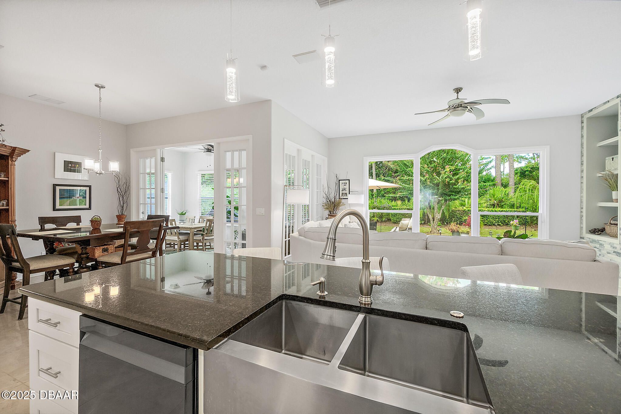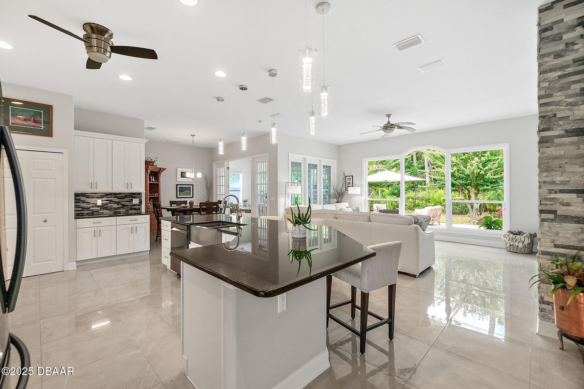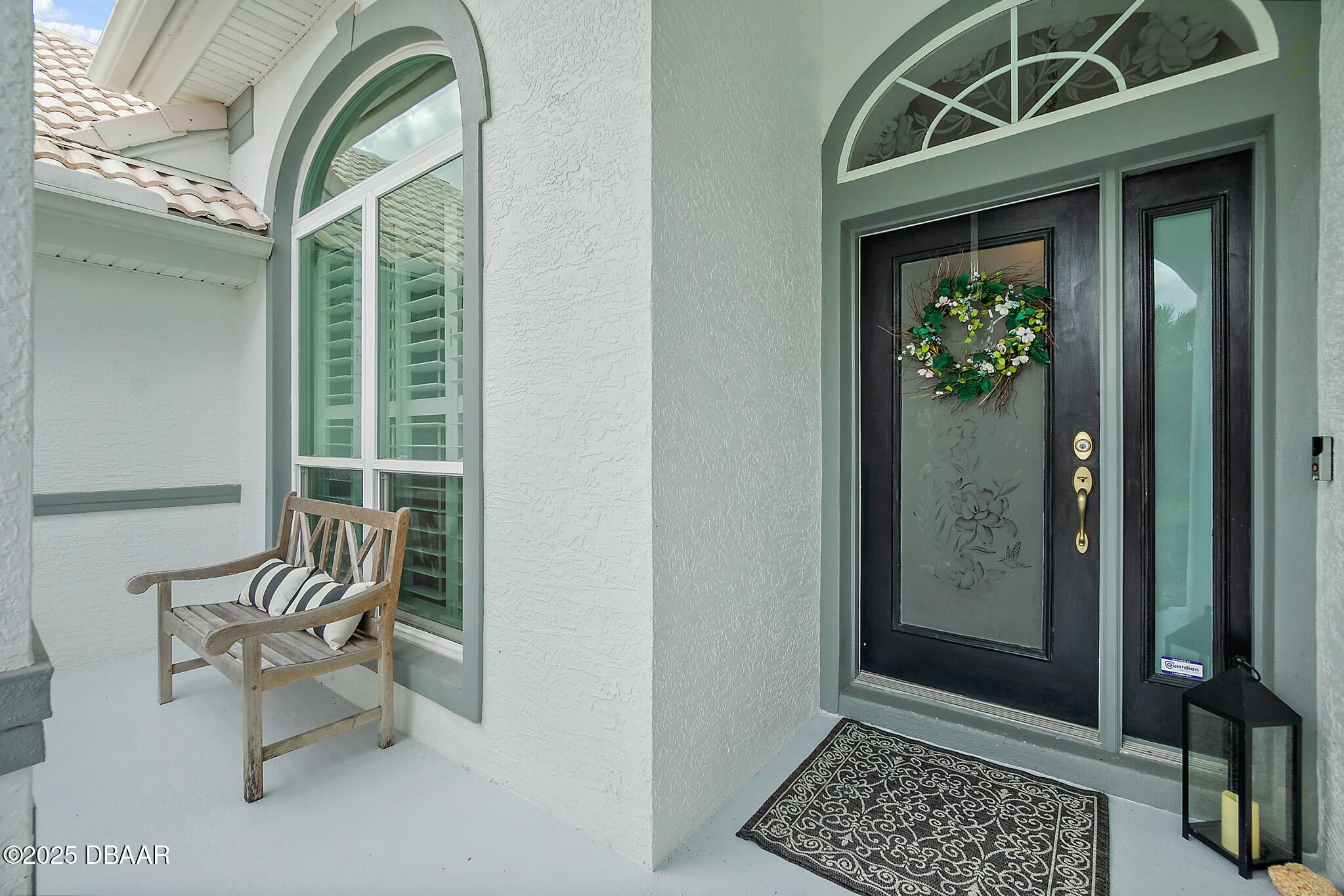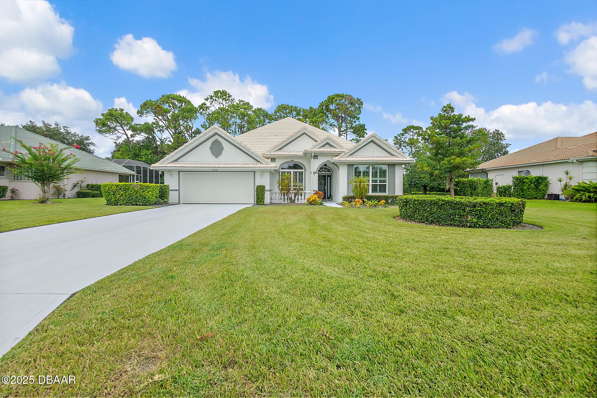 Experience a life of unparalleled luxury and serenity. This exquisite 4-bedroom, 2-bath residence is a modern masterpiece perfectly positioned on a sculpted, meticulously manicured, premium and oversized estate lot on over a third of an acre. This home offers a rare and coveted location on the south golf course, 12th tee, within the exclusive, guard gated community of Plantation Bay. This home's expansive layout features two distinct living spaces, with the heart of it all being the chef's kitchen. This culinary dream is designed for both functionality and style, boasting an oversized island, premium stainless steel appliances, and gorgeous granite countertops. It's a space where every detail has been considered for the discerning home chef. The kitchen flows effortlessly into the main living area, which is anchored by a striking, floor-to-ceiling TV and fireplace wall. Adorned with beautiful stone accents and custom cut-outs, this sophisticated focal point is bathed in natural light from a magnificent wall of windows that frames breathtaking views of the outdoor landscape. Just off this space, elegant French doors lead to a spacious, tiled Florida room, seamlessly blending indoor comfort with the beauty of the outdoors. This exceptional design creates a perfect atmosphere for both grand entertaining and quiet relaxation. The front of the home features a second, more private living area, providing a flexible space ideal for a formal sitting room or a library. Currently, the fourth bedroom is utilized as a dedicated home office, offering a quiet retreat from the rest of the home that's perfect for productivity and focus. Escape to your own private sanctuary in the luxury master bedroom and en-suite. This spa-like retreat boasts a deep soaking tub and a sleek frameless step in shower, offering the perfect way to unwind at the end of the day. The luxury continues with a spacious walk-in closet, complete with a custom closet system for optimal organization and storage. Three additional and spacious bedrooms offer flexible living arrangements for family, guests, a dedicated home gym, or hobby room. The outdoor oasis is an entertainer's dream, featuring a sophisticated patio area with pavers, ideal for al fresco dining or simply enjoying the tranquility of your surroundings. Additional notable features include: extended, deep garage, Pella fiberglass insulated windows throughout, new flooring, including 24x24 porcelain tile and herringbone wood tiles (2024), luxury vinyl plank (LVP) in the bedrooms, insulated overhead garage door, new 50-gallon hot water tank (2025), new lighting throughout, new epoxy driveway and porch (2025), plantation shutters. Beyond the home, life in Plantation Bay offers a world-class resort experience. This private, master-planned community features 45 holes of championship golf, two elegant clubhouses with fine dining, a 7,000 sq. ft. spa and fitness center, resort-style pools, and miles of scenic trails. Sports enthusiasts can enjoy Har-Tru tennis courts, pickle ball, bocce ball, basketball, and a full calendar of wellness classes. With optional memberships, you can tailor your lifestyle to focus on golf, social events, or pure relaxation. Located just minutes from pristine Atlantic beaches, shopping, and dining, Plantation Bay perfectly blends luxury, convenience, and natural beauty. This exceptional property is more than just a home; it's a statement of refined living.