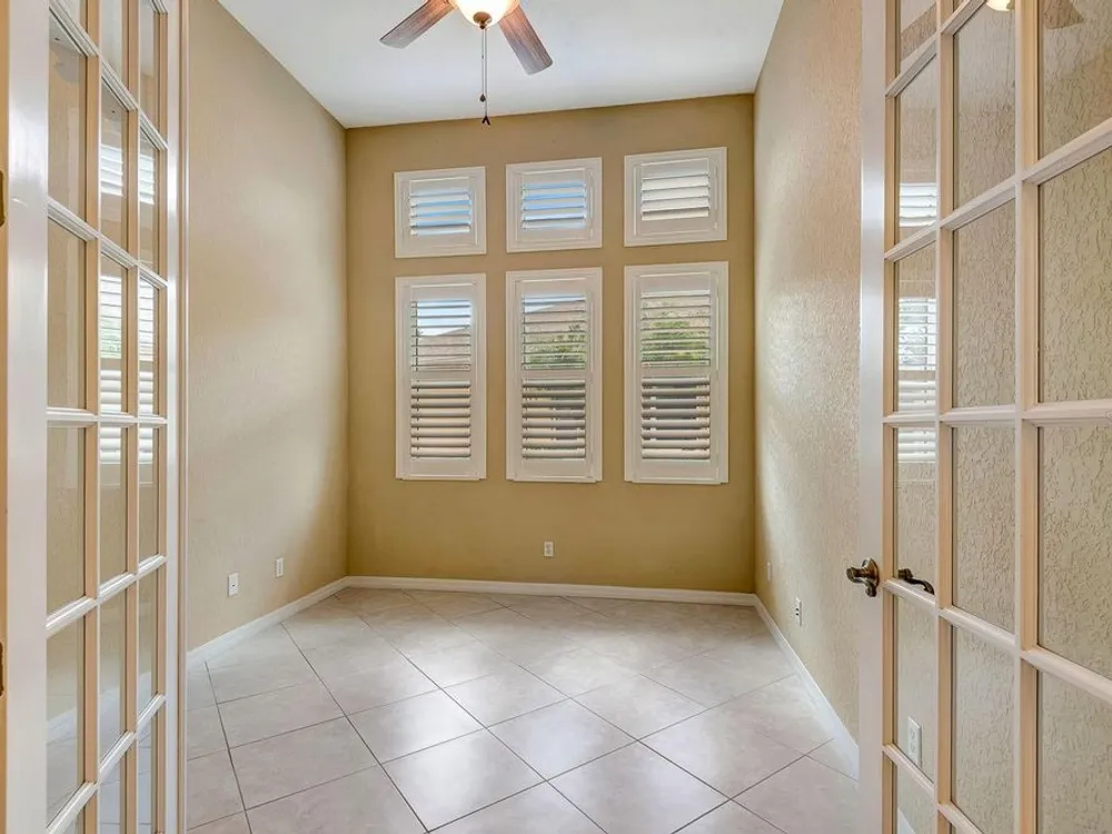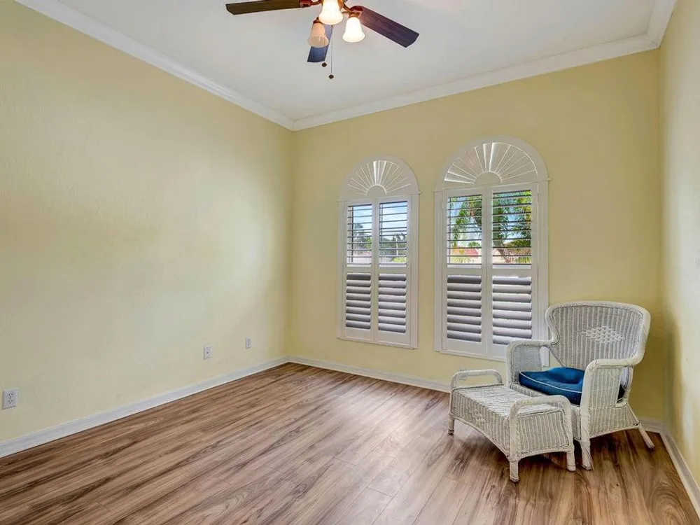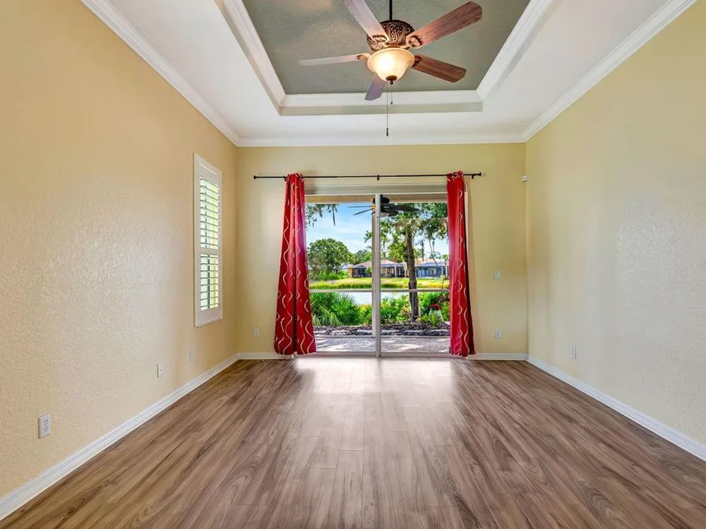 - Ceiling Fan(s), Crown Molding, Eat-in Kitchen, High Ceilings, Living/Dining Room, Open Floorplan, Main Level Primary, Solid-Wood Cabinets, Split Bedrooms, Stone Counters, Thermostat, Tray Ceiling(s), Walk-In Closet(s), Window Treatments