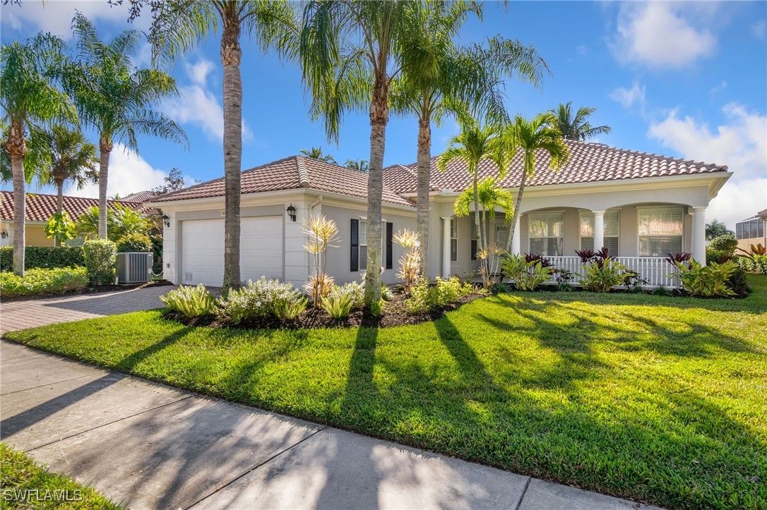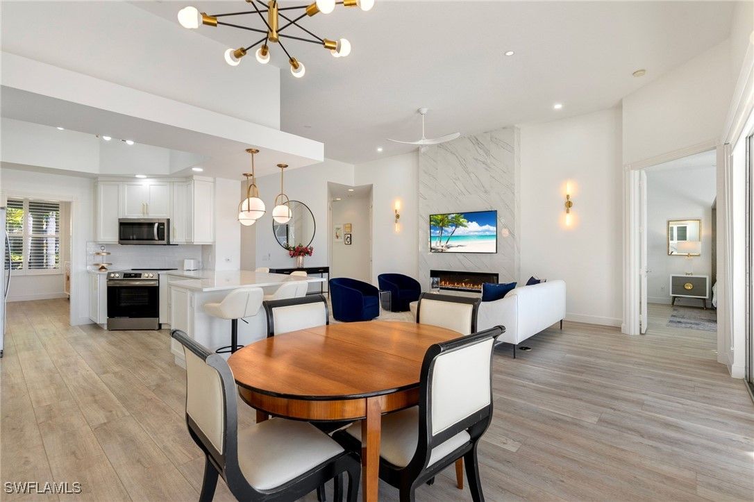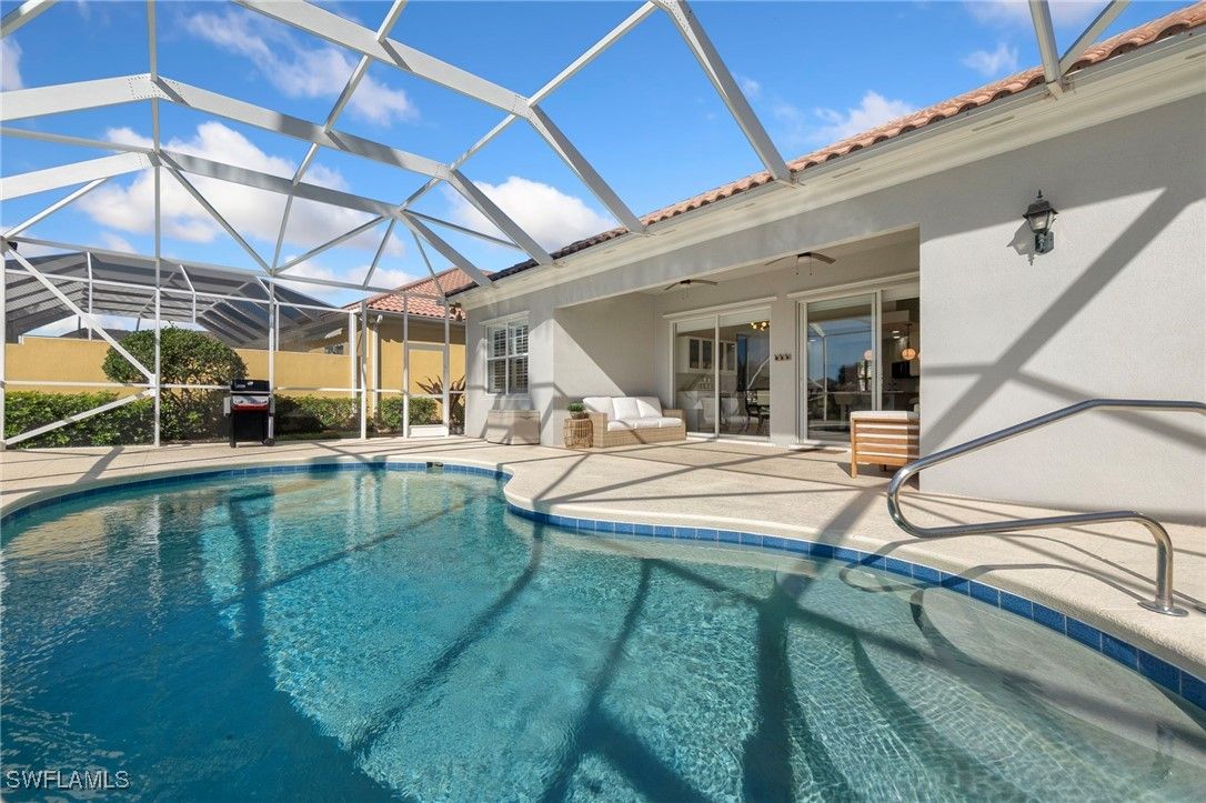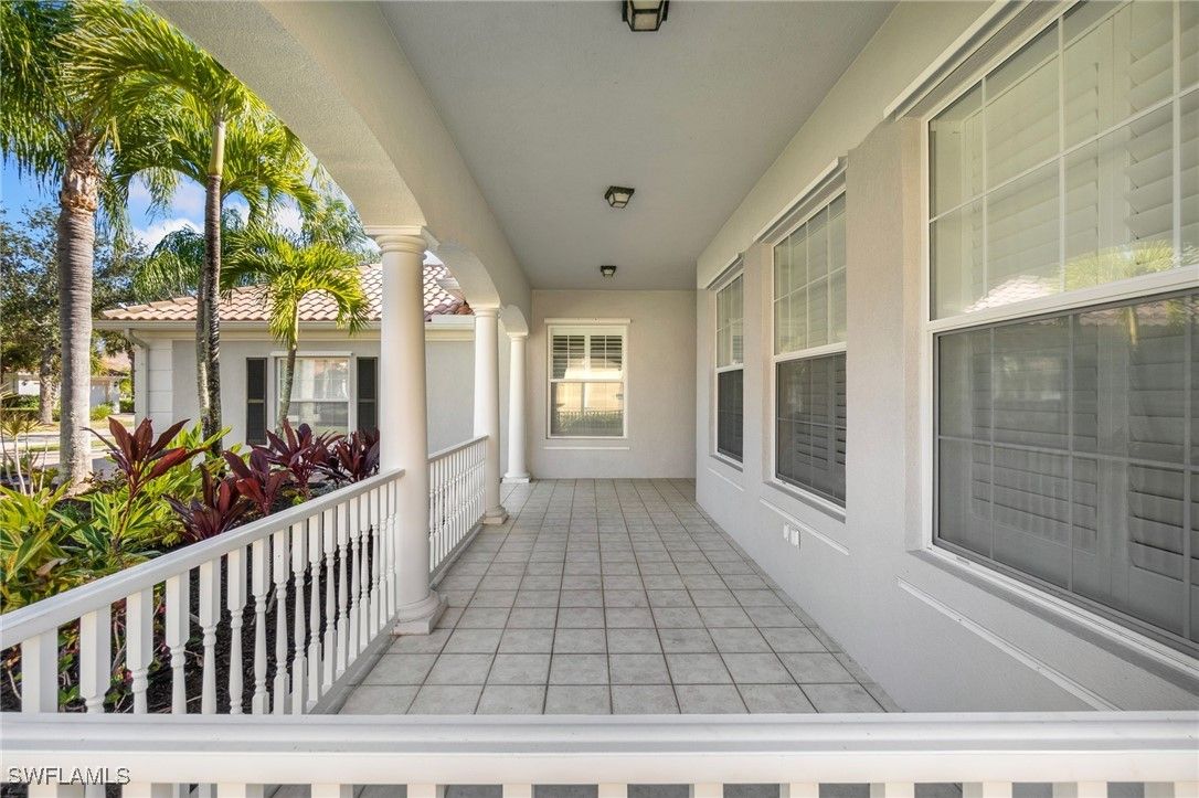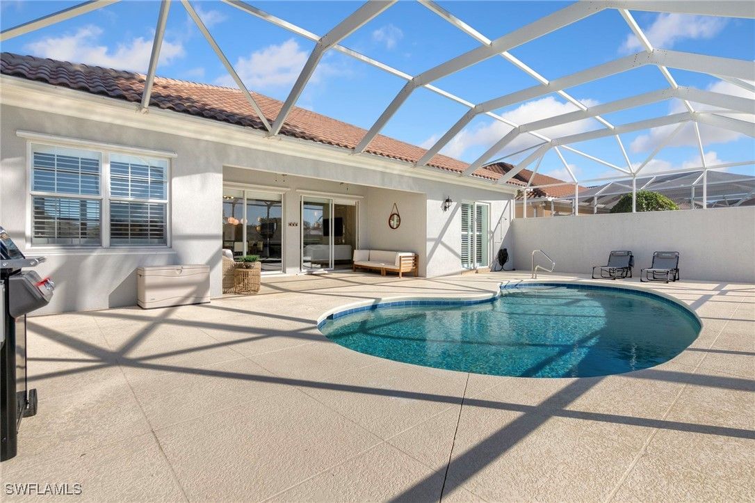 Welcome to this stunning solid poured concrete Carlyle model by Divosta with Southern exposure. This home offers 4 bedrooms plus a den and 3.5 baths. The den could easily be a 5th bedroom. This beautifully updated home features new wide plank laminate wood flooring throughout and an open, light-filled floor plan designed for comfortable Florida living. The updated kitchen showcases crisp white shaker cabinetry, quartz countertops, and ample storage, flowing seamlessly into the spacious great room highlighted by an electric fireplace with custom accent lighting. Step outside to your private outdoor retreat with a screened lanai and pool—perfect for relaxing or entertaining. Additional upgrades include a newer A/C system, newer pool heater, and fresh exterior paint, providing peace of mind and modern appeal. Enjoy resort-style living with Verona Walk’s incredible amenities: a 26,000 square foot town center, resort and lap pools, tennis, pickleball, fitness center, restaurant, gas station, post office, and ice cream shop. Miles of walking/biking trails are all connected by picturesque Venetian bridges. Low HOA fees, manned gated entry, and a prime Naples location just minutes from Marco Island beaches and 5th Avenue shopping making it an ideal location.