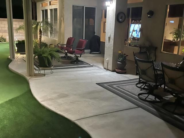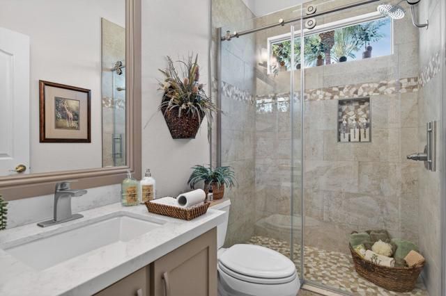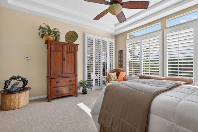 Welcome to this beautifully maintained 2,020 sq. ft. home in the highly desirable Heritage Palms Country Club, where comfort, style, and an active desert lifestyle come together.Step inside and you're immediately greeted by an abundance of natural light. High ceilings, charming eyebrow windows throughout, and an open, flowing floor plan create a bright and welcoming space that feels both spacious and inviting. The oversized great room and dining area are perfect for entertaining, hosting family gatherings, or simply enjoying everyday living, while the open kitchen offers plentiful cabinetry, generous counter space, and a seamless connection to the living areas so you're always part of the moment. The spacious primary suite provides a relaxing retreat, featuring elegant coffered ceilings, beautiful natural light, and a fully remodeled bathroom with a tiled walk-in shower, makeup vanity, and tasteful finishes. Guests will appreciate their own private suite with a separate entry door and a beautifully updated bathroom with a light, modern tiled shower. A large den adds valuable flexibility and can easily serve as a home office, hobby room, media space, or additional guest accommodations. Thoughtful features throughout the home include plantation shutters, ceiling fans, oversized tile flooring in the main living areas, comfortable carpet in the bedrooms, a laundry room with direct garage access, and a large air-conditioned garage with room for a golf cart. Step outside to your beautifully landscaped backyard retreat, complete with a private putting green redone in 2021 -- perfect for relaxing, entertaining, or enjoying quiet desert evenings. Dog lovers will especially appreciate the home's location near the community dog park for added convenience. Living here means enjoying resort-style amenities including golf, tennis, pickleball, pools, fitness classes, dining, and a vibrant social calendar just steps from your door. Plus, you're only minutes from shopping, dining, hiking trails, and the charm of Old Town La Quinta, offering the ideal balance of relaxation and local flavor. This is more than just a home -- it's a place to settle in, make memories, and truly enjoy the best of desert living.