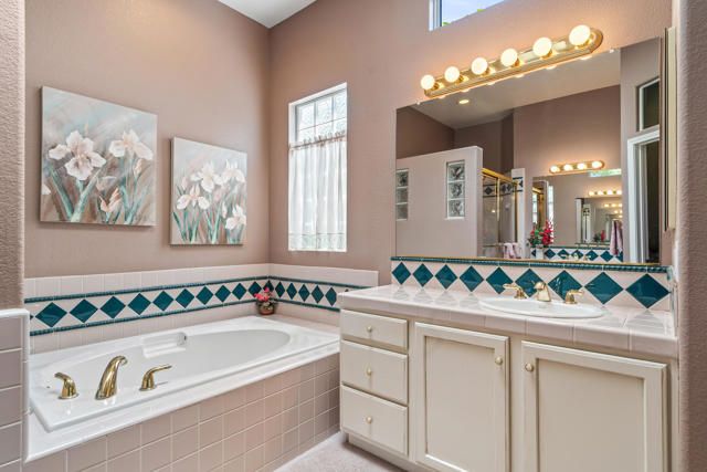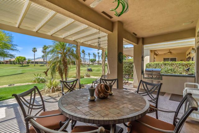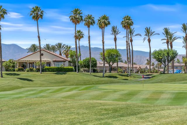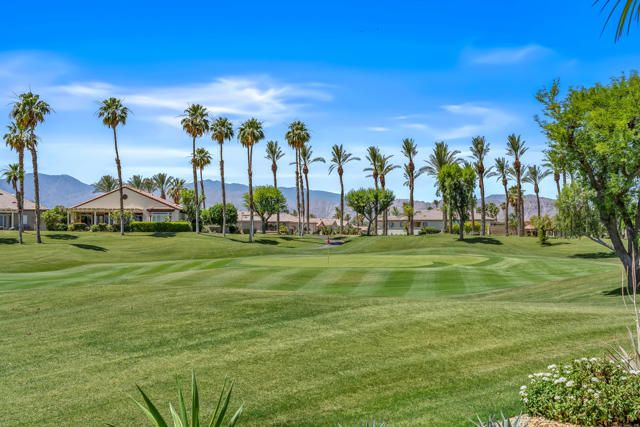 Location, Location, Location & SOUTH VIEWS of the 15th green, fairway and beautiful local mountains. Located just a short stroll to the clubhouse, this lovely 1827 sq.ft. 2 bedroom 2 bath home has never been on the market prior. Featuring an open great room design, beautiful slab granite kitchen counters, refinished cabinetry, SolaTube above kitchen sink for loads of natural light, Plantation shutters, extra deep garage to accommodate a golf cart and French doors in lieu of sliders. The roomy primary suite has dual closets, split vanities and custom tiled large shower and soaking tub. Additional upgrades include three bay windows, Fireplace, built-in BBQ, surround sound, artificial turf and entry courtyard. Located near the 15th green, the extended and covered SOUTH facing rear patio is a wonderful place to relax and take in the peaceful desert lifestyle. Heritage Palms is a premier adult community featuring an 18 hole championship golf course, indoor & outdoor pools, pickleball & tennis courts, fitness center, grill room, card rooms, billiards room, social clubs and more.