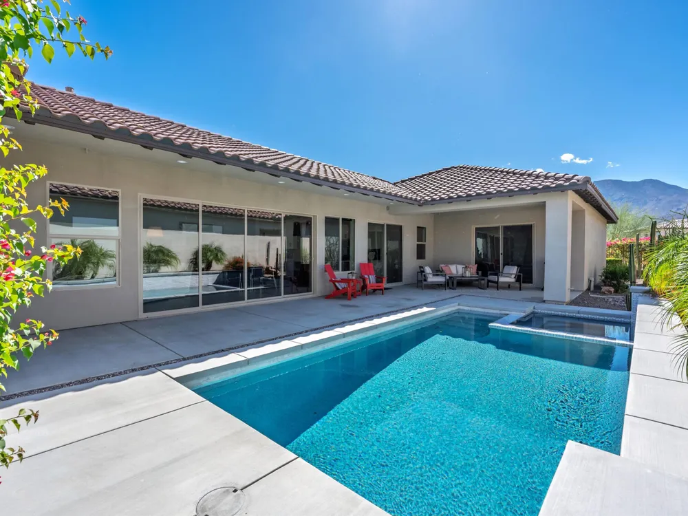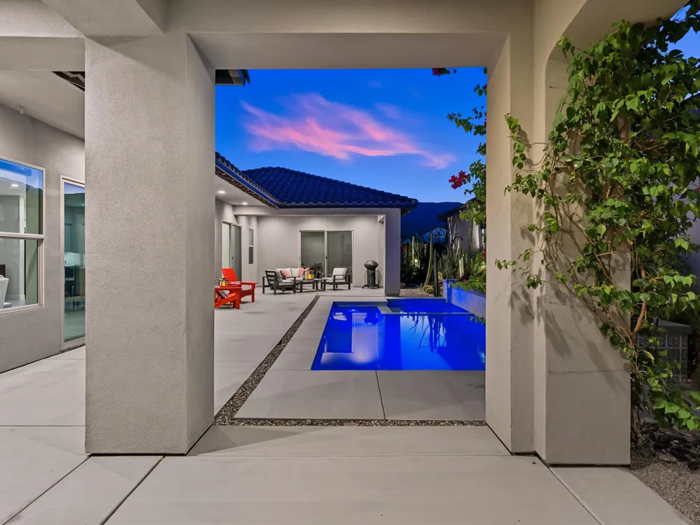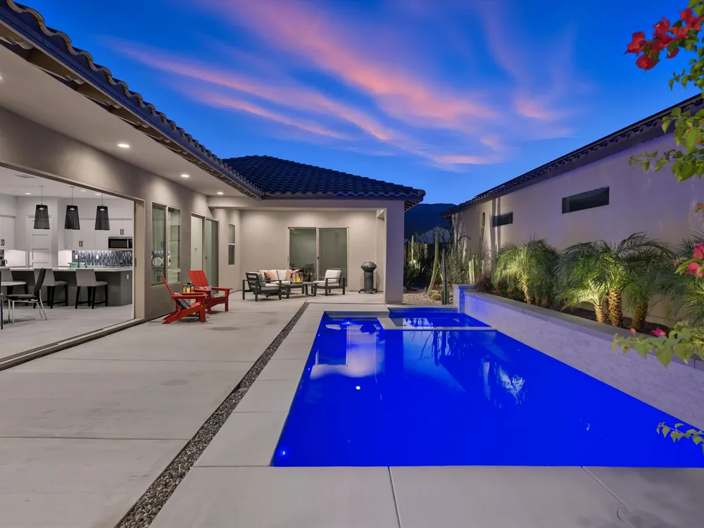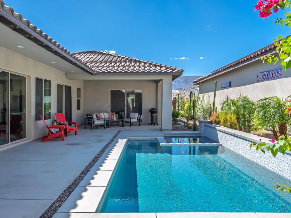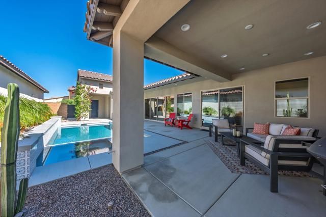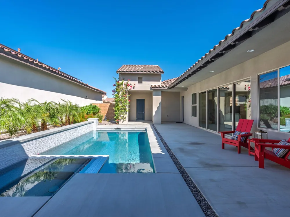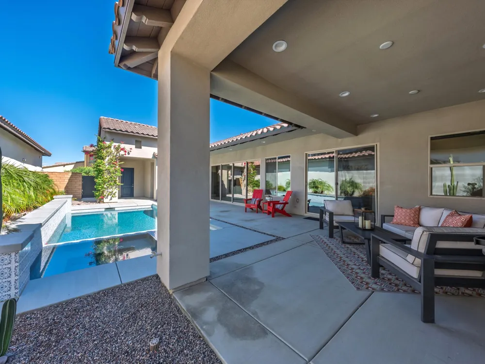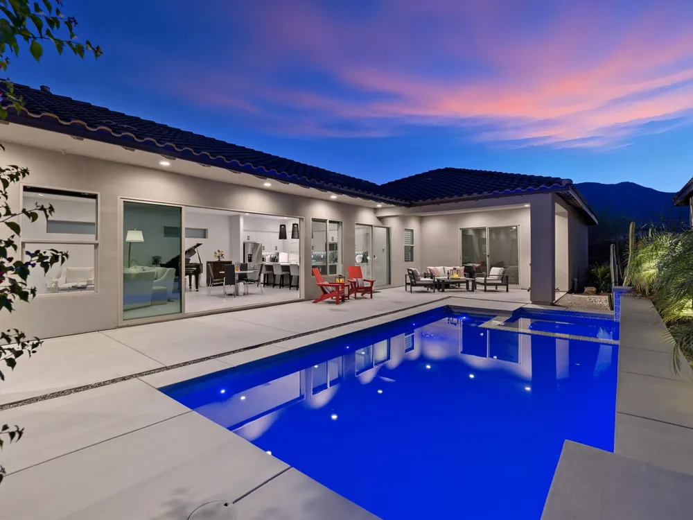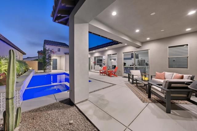 Gorgeous Woodbridge Pacific home on a unique lot in Signature at PGA West with no homes immediately behind providing south mountain views from the new Teserra-designed pool, spa and patio. Built in 2021, this 3-bedroom, 2-bath, 2131 square foot contemporary home is one of the larger single-level floor plans in the community. The great room floor plan features a floor-to-ceiling fireplace surround topped by a flat-screen TV on a unique motorized bracket system. These original owners are full-time desert residents, and they have added over $200,000 in upgrades to make this home uniquely theirs. Things like the 15-foot disappearing wall of glass between the great room and the pool/patio providing a spectacular indoor-outdoor living and entertaining experience; motorized Hunter-Douglas window coverings throughout the home; Solid wood doors; upgraded kitchen cabinetry and appliances; and much more. A full list is available upon request. The 16-panel owned solar system assures easily manageable energy bills in any season. Examples of monthly utility charges are also available on request. The Signature community is one of only three in all of La Quinta that allows short term rentals (STVR) making this an ideal property for investors as well as full or part time occupancy.