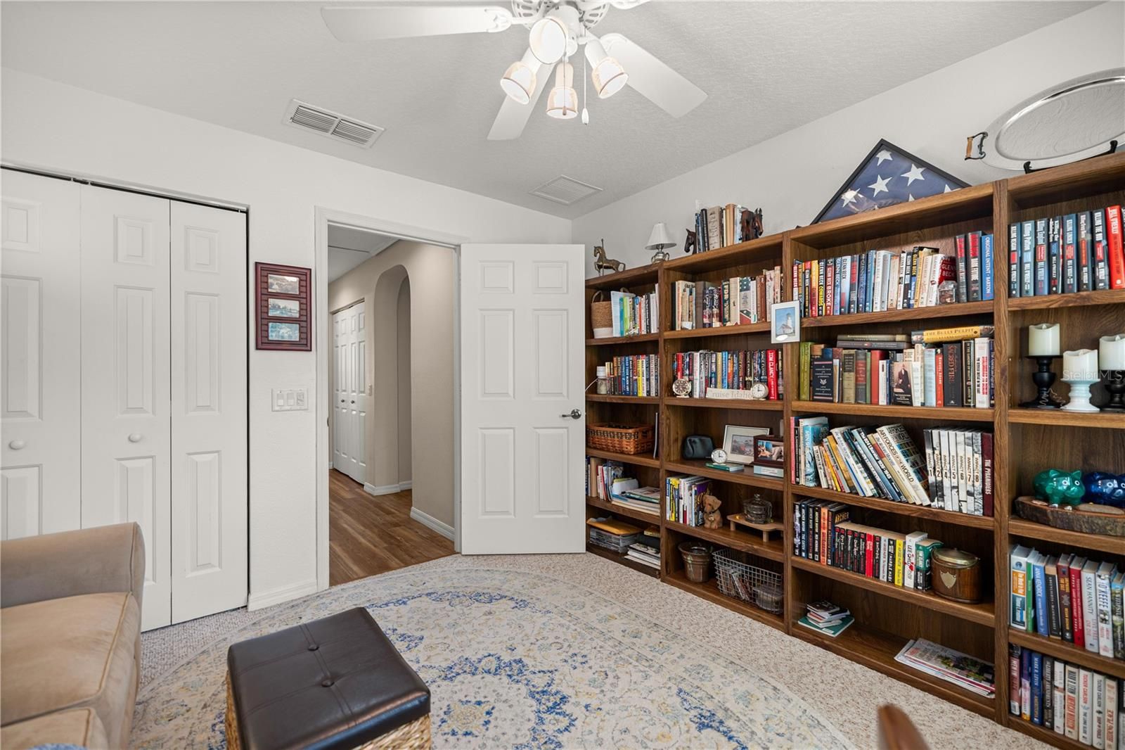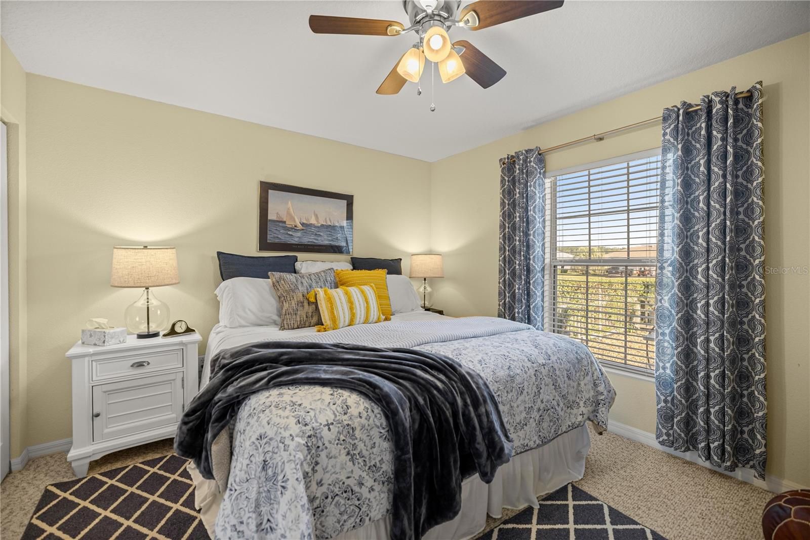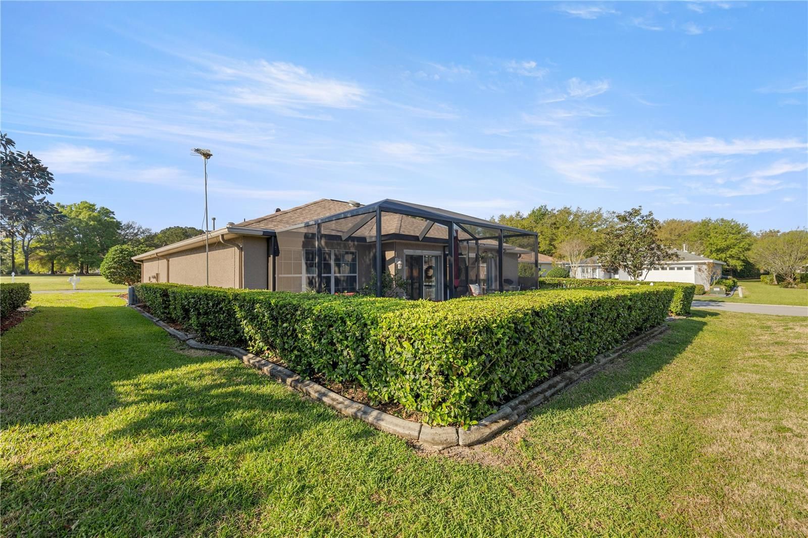 Walk into this beautiful corner lot home through its inviting entryway into a spacious living room, where recessed lighting, two skylights, and an open flow lead you to a beautifully updated kitchen. The main open areas have laminate and tile flooring, while bedrooms have carpet for comfort. The kitchen features Forevermark soft-close cabinets with dividers, granite countertops, a double pantry with pull-out shelving, over/under cabinet lighting, a drinking water purifier under the sink, and a cozy eating nook. The living room has extra-wide sliding glass doors and is plumbed for gas if you’d like a chimney leading you to the enclosed lanai, heated and cooled, complementing patio w/ birdcage for added living, relaxing and entertaining. The primary suite offers a tray ceiling, ceiling fan, and a walk-in closet with a built-in shelving system. Ceiling fans and lights are found throughout the home. The primary bath has quartz countertops and dual sinks. The front bedroom has a bay window with plantation shutters, and the guest bath includes a deep tub. Don’t miss the mudroom between the garage and kitchen, featuring a bar and extra storage cabinets. The garage houses the washer/dryer with generous cabinet and counter space. Ample storage throughout the home and garage. This home shows like a brand-new upgraded model—you don’t want to miss it! The Verbina model, on owned property, includes a low-maintenance rock yard, a Ring doorbell with motion light, a whole-house water softener/purifier, and a 3-year transferable HVAC and systems warranty.