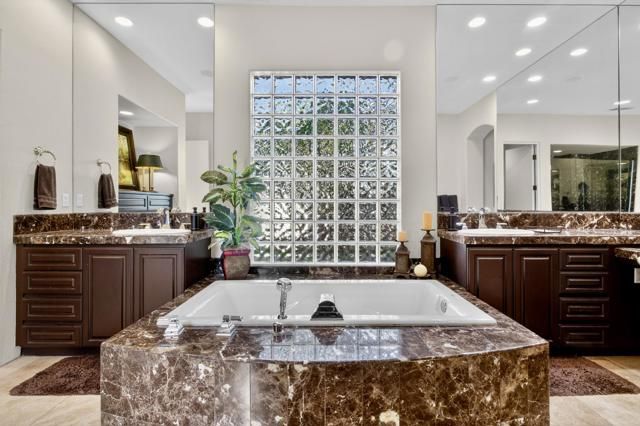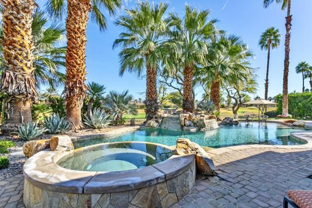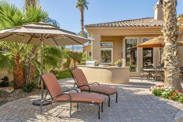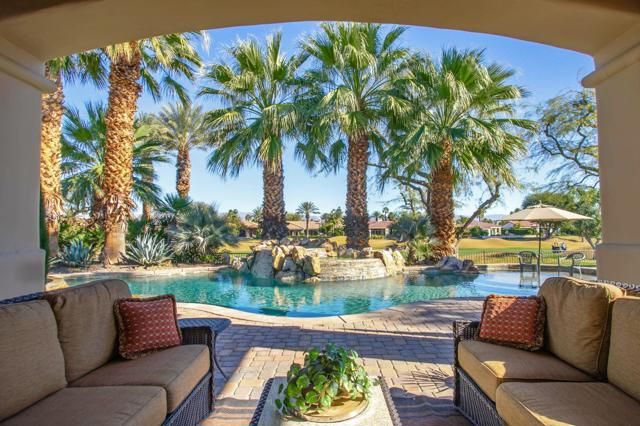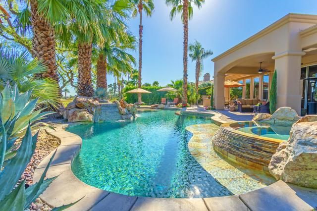 Nestled on the 10th hole of the Nicholas tournament course in PGA WEST this 4 bedroom 5 bath masterpiece blends Mediterranean charm with modern luxury. A coveted street to live on Weiskoff, this home is a masters 1 floor plan. Stunning entrance, as you step through an enchanted courtyard lush and inviting. The Formal entry welcomes you into a grand open great room, impeccably decorated, featuring travertine and mosaic tile floors, a see-through fireplace that separates the living and breakfast areas. A formal dining room illuminated by an elegant chandelier. The gourmet kitchen boasts beautiful cabinetry, granite countertops, a center Island, and stainless steel high-end appliances. There are 2 wine refrigerators, one being extra large in the Butler's pantry, and the other in the entertainer's wet bar. There is a place for everyone in this home! The spacious primary retreat has a large walk-in closet, beautiful granite showers, separate water closets, and a bonus room that can be used as an office or fitness room. There are gorgeous views. gorgeous views of the pool and golf course. There are panoramic Mountain views from all aspects on this property. The owners have done several upgrades from new A/C , new roof tiles, adding vintage lush, palms, citrus, fruit trees, new sound system and upgraded salt water pool unit for waterfall. A spa, tanning deck, fire pit, new built-in barbecue, new artificial turf. The covered patio allows plenty of space for dining and entertaining and privacy provided by multiple fruit trees. The Casita has a separate entrance from the main house. The home is close to Shopping, dining, World class Tennis BNP, festivals, and home to American Express PGA tournament. A true desert oasis comes turnkey furnished. Don't miss this opportunity. Welcome home!