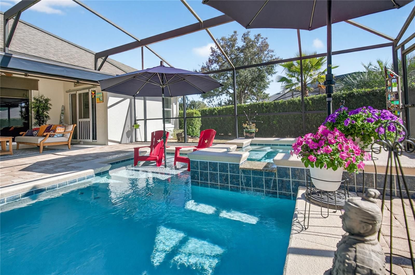 Beautifully renovated home featuring a private backyard oasis with a screened, heated pool and spa. The spa cascades into the pool, creating a serene ambiance, and the system includes an ozonator for a fresh, low-maintenance alternative to chlorine or salt. A remotely operated awning provides shade over the lanai seating area—perfect for relaxing with a glass of wine or entertaining guests. Or sit on the front porch and enjoy a peek at the lake just a block or so away! Inside, enjoy a popular open and split floor plan with stunning pool views. Updates include imported porcelain wood-plank tile throughout the living room, dining and kitchen areas, and new carpet in the bedrooms, a built-in wine bar with custom shelving, and gorgeous stone countertops in the kitchen and baths. The kitchen also features pull-out shelving and soft-close cabinetry. The primary suite boasts a shiplap accent wall, an extended walk-in closet, and a newly installed shower. Home is equipped with a Whole House Generac Generator for extra peace of mind. With so many tasteful upgrades, this home truly must be seen to be appreciated. The Lakes of Mount Dora is an award-winning 55+ gated community in Central Florida with an 18,000 sq ft Clubhouse, library, billiards room, card/game room, social hall, gym, arts/crafts room, 4 miles of interconnecting waterways, pickle ball, tennis, bocce ball and croquet lawns, pool, hot tub, walking trails, fire pits, and an amazing fenced and gated RV/Boat Parking! All of this, plus reclaimed sprinkler system lawn irrigation AND internet/cable, is included in the low fee of $290. a month! Located just under 15 minutes to downtown Mount Dora, the quaint little town with art, festivals, shopping, unique eateries, and coffee shops, and just over an hour to Orlando with all its attractions, you can be sure to never get bored! One hour from the beach! Don't let this opportunity pass you by - discover your perfect Florida home today!