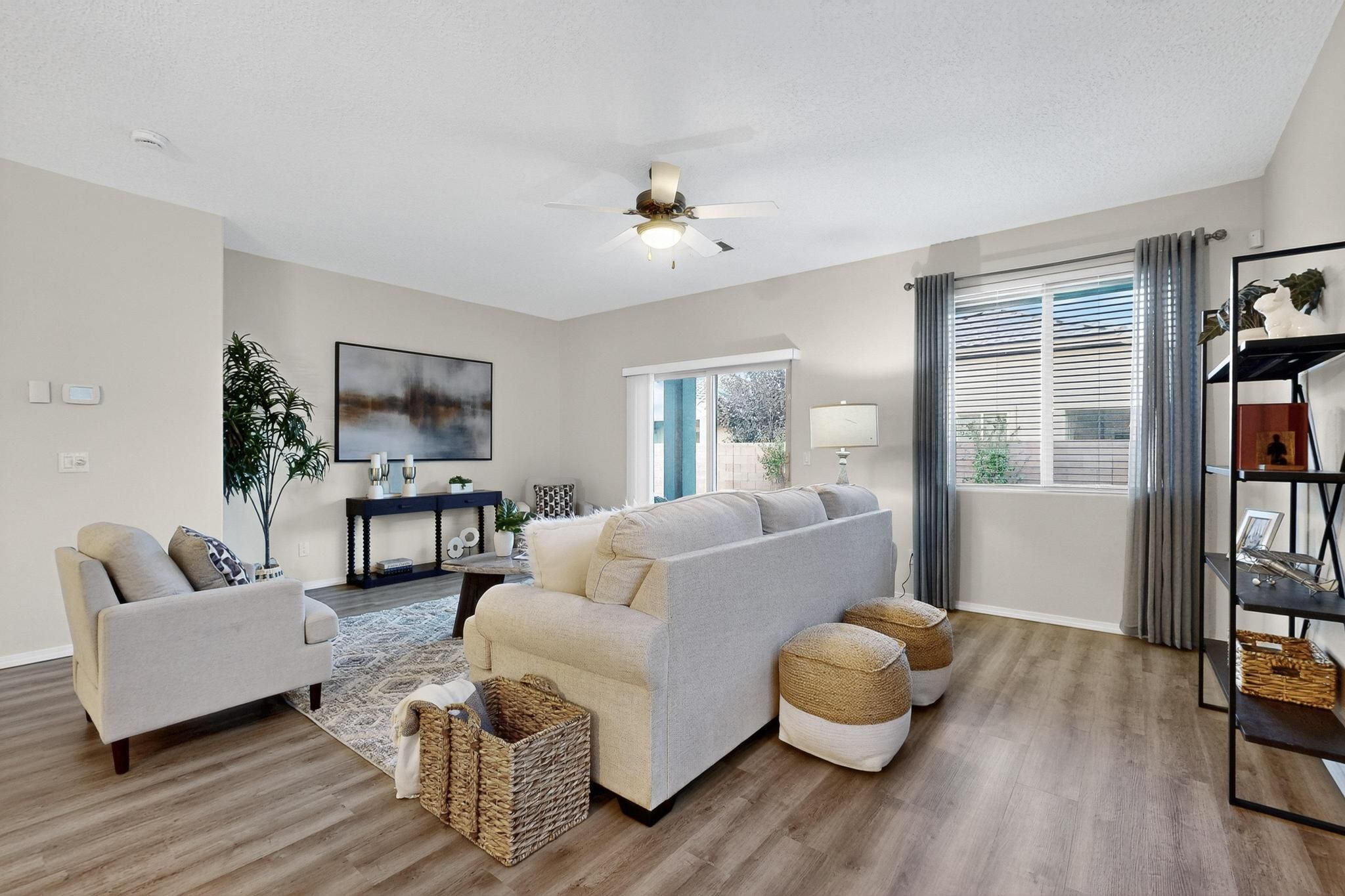 Beautifully renovated 2-bedroom, 2-bath, 1,649 sq. ft. home in the desirable Del Webb 55+ gated community, nestled near the peaceful Bosque Preserve. Like new with fresh paint, new laminate wood flooring, carpet, upgraded lighting, and new blinds throughout. Kitchen and baths feature new granite countertops, stylish backsplash, professionally painted cabinets with new pulls, plus new cooktop and dishwasher. Primary bath includes a stunning new shower renovation. Enjoy new water heater, furnace, and refrigerated air (Feb 2025). Covered back patio and fully xeriscaped front & back yards offer easy maintenance. Community amenities include Clubhouse with 2 pools, fitness center, walking & bike trails, and more! Move-in ready and better than new!