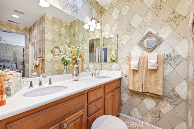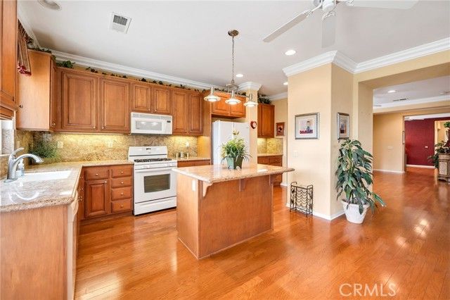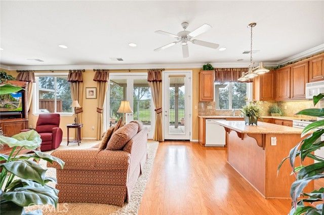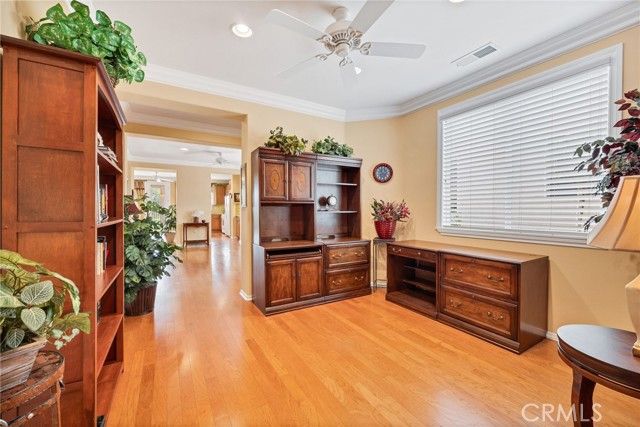 Welcome to resort-style living in the gated and guarded 55+ community of Four Seasons Hemet. Ideally situated with beautiful golf course views, this elegant single-story residence offers 1,809 square feet of thoughtfully designed living space, blending comfort, quality finishes, and an exceptional lifestyle. From the moment you enter, you’ll appreciate the inviting den/office just off the entry — perfect for a home workspace, reading room, or hobby area. Rich hardwood flooring flows through the main living areas, complemented by crown moulding and tasteful custom wallpaper accents in various rooms that add warmth and sophistication. The open-concept design creates a seamless connection between the kitchen and living room, making the home feel both spacious and welcoming. The kitchen is the heart of the home, featuring granite countertops, a center island ideal for casual dining or entertaining, and ample cabinetry for storage. Large windows frame tranquil golf course views, which can also be enjoyed from the living room — bringing natural light and a peaceful backdrop into your everyday living space. The generously sized primary suite is designed for comfort, offering dual sinks, a large step-in shower, and a well-appointed layout that provides both convenience and privacy. Ceiling fans in the bedrooms enhance comfort year-round. Step outside to the covered patio, where you can unwind with morning coffee or evening sunsets while overlooking the beautifully maintained golf course — a perfect extension of your indoor living space. Living in Four Seasons Hemet means enjoying a vibrant, active lifestyle. This guard-gated community offers an impressive array of amenities including a resort-style pool and spa, tennis courts lined for pickleball, bocce ball, and shuffleboard. The stunning lodge serves as the social hub of the community and features a bistro, movie theater, library, billiard room, craft room, and a grand ballroom that hosts events, clubs, and gatherings throughout the year. If you’ve been searching for a beautifully upgraded home with golf course views in a premier active-adult community, this exceptional property delivers both comfort and lifestyle in one remarkable package.