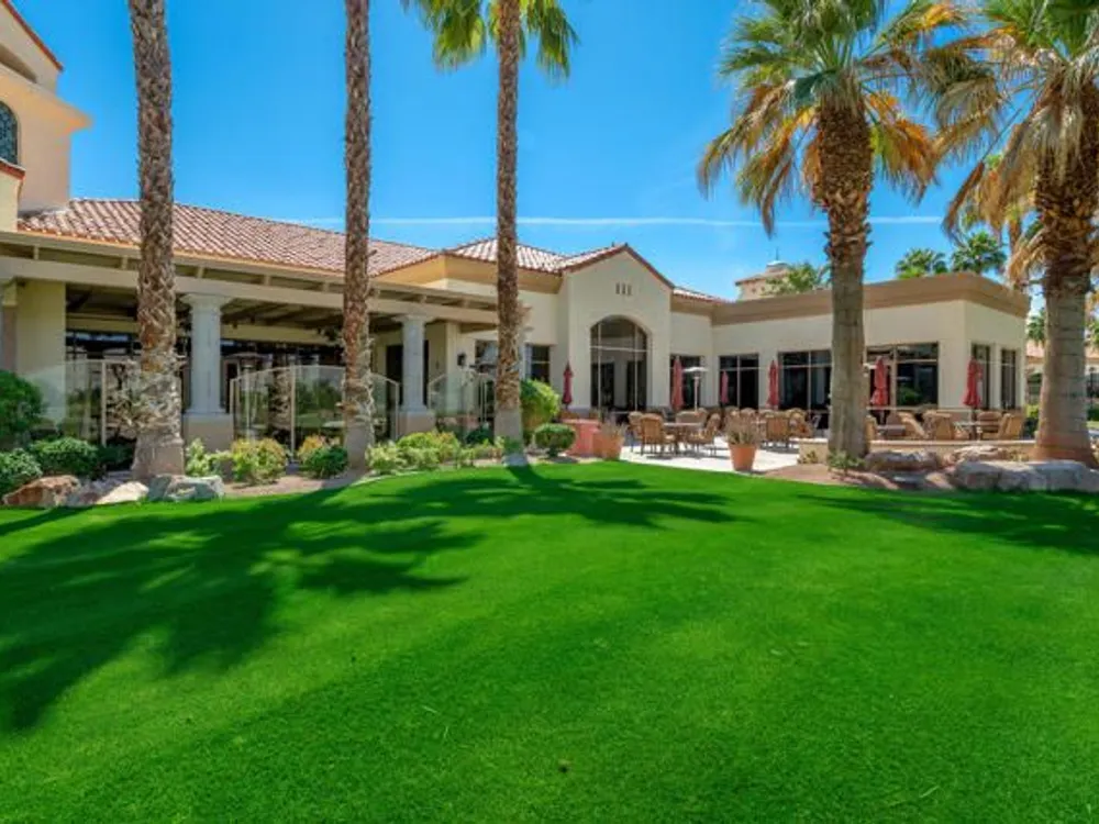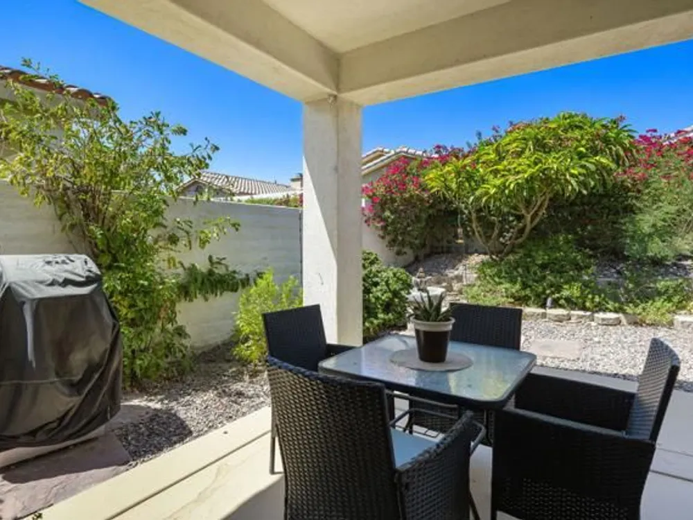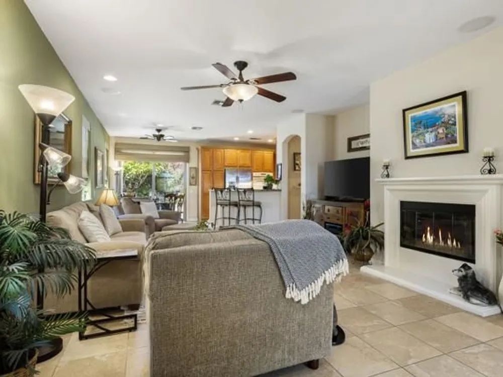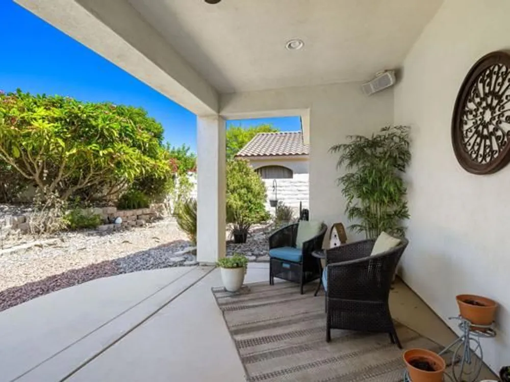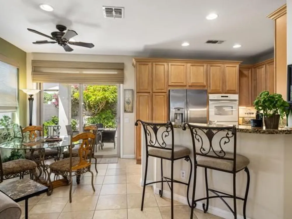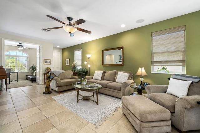 This beautifully-maintained San Ysidro model in the highly sought-after 55+ community of Sun City Shadow Hills is offered FURNISHED. Ideally located across from a greenbelt and near the dog park, this inviting home offers two spacious bedrooms + a versatile DEN, two baths, and ample living space. The primary suite offers a spacious en-suite bath, large walk-in shower, and walk-in closet, while the kitchen features a gas cooktop, double-wall oven, STAINLESS STEEL REFRIGERATOR, and generous counter space ideal for entertaining. A separate laundry room with utility sink, washer, and gas dryer adds convenience, and the two-car garage includes BUILT-IN CABINETS and a water-conserving hot water recirculating pump. Interior highlights include custom designer paint, extended Italian porcelain tile floors, a cozy FIREPLACE with reflective fire glass, SURROUND SOUND in the Great Room, and ceiling fans throughout, including the patio. Recent updates bring peace of mind with a NEWER HVAC CONDENSER (2022), York furnace blower (2025), Lift Master garage door motor (2024), newer refrigerator (2021), garbage disposal (2022), clothes washer and thermostat (2022). The private backyard is beautifully landscaped with lush lawn, mature Plumeria trees, low-voltage lighting, upgraded hardscape, and a soothing fountain with remote. Enjoy resort-style living with access to golf, tennis, pools, fitness centers, restaurants, social clubs, and more. Move-in ready and waiting for you to live the lifestyle you deserve! Schedule a private tour today!