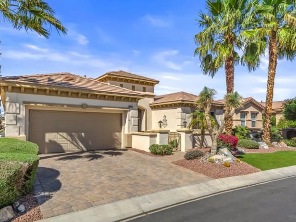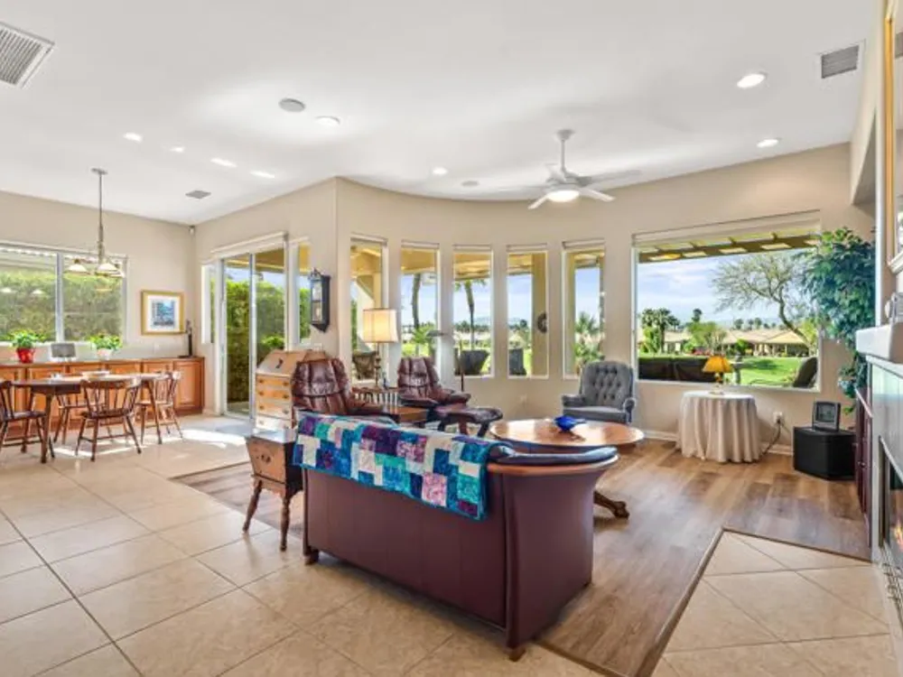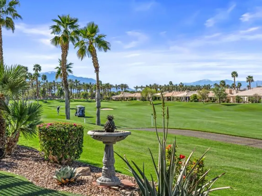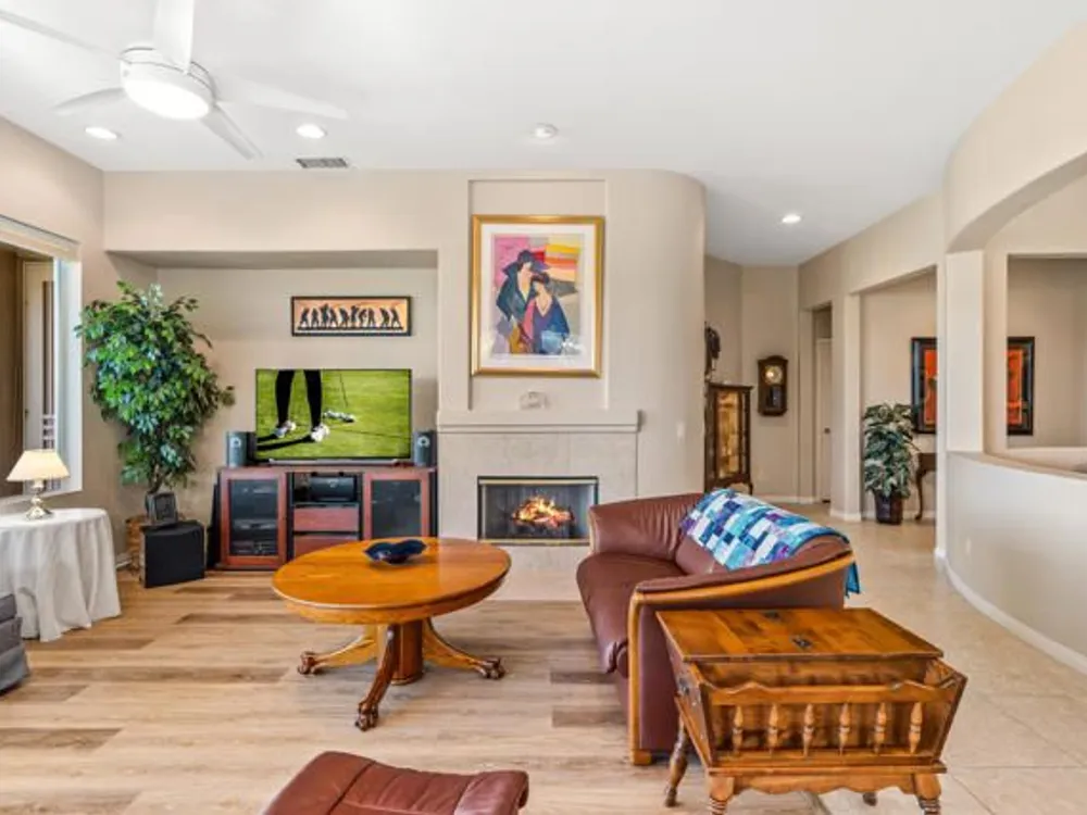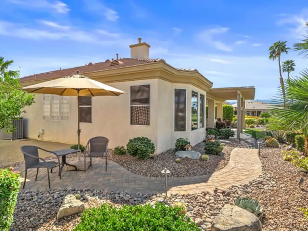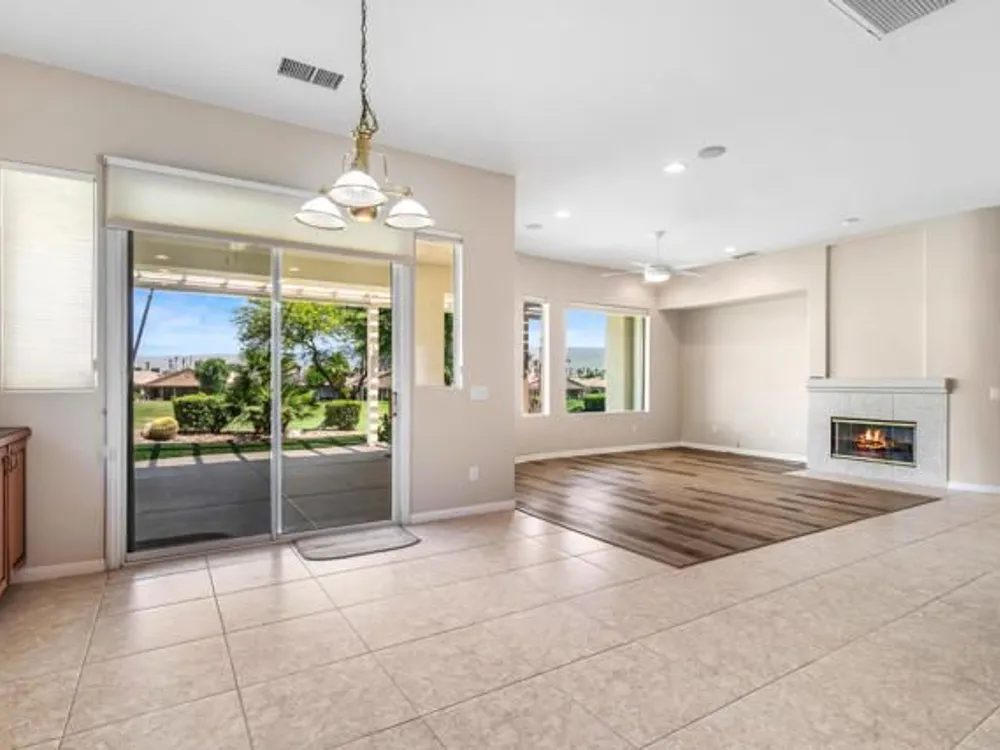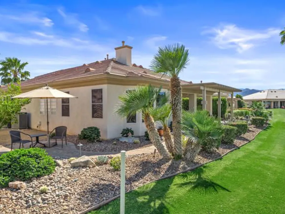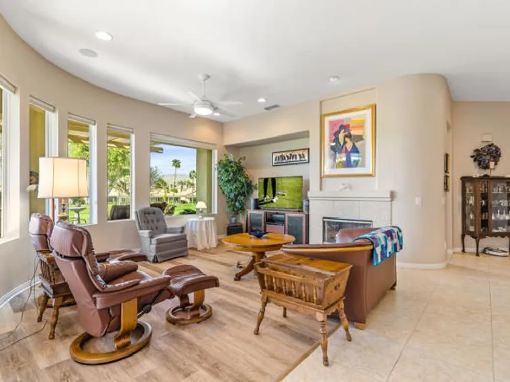 BEAUTIFUL PANORAMIC Fairway & Mountain views from this elevated site on the 15th fairway in Heritage Palms. Featuring 3 bedrooms, 2 1/2 baths, a large open design with fireplace in the family room, beautiful slab granite kitchen counters with cherry wood cabinetry including the optional buffet, stainless/black appliances, and upgraded picture windows replacements of the entire rear/view side of the home. The spacious primary suite with optional bay window features a large bathroom with soaking tub, separate shower, dual vanities, walk-in closet and french door to your covered rear patio with flagstone style overlay. Motorized drop down shades, brick paver walkway, drought tolerant desert landscaping, artificial turf and plenty of room for entertaining your friends & family or simply taking in the spectacular views. Bedroom #2 not shown in pictures. ( please refer to the floor plan shown). Additional upgrades include brick paver driveway, golf cart parking area, hanging racks, garage A/C unit, both of the homes A/C units and furnaces have also been replaced. Heritage Palms is a premier adult community featuring an 18 hole championship golf course, indoor & outdoor pools, pickleball & tennis courts, fitness center, billiards room, card rooms, grill room, social clubs and more.