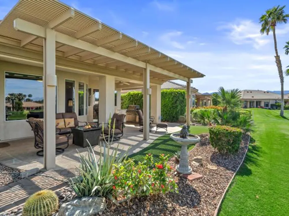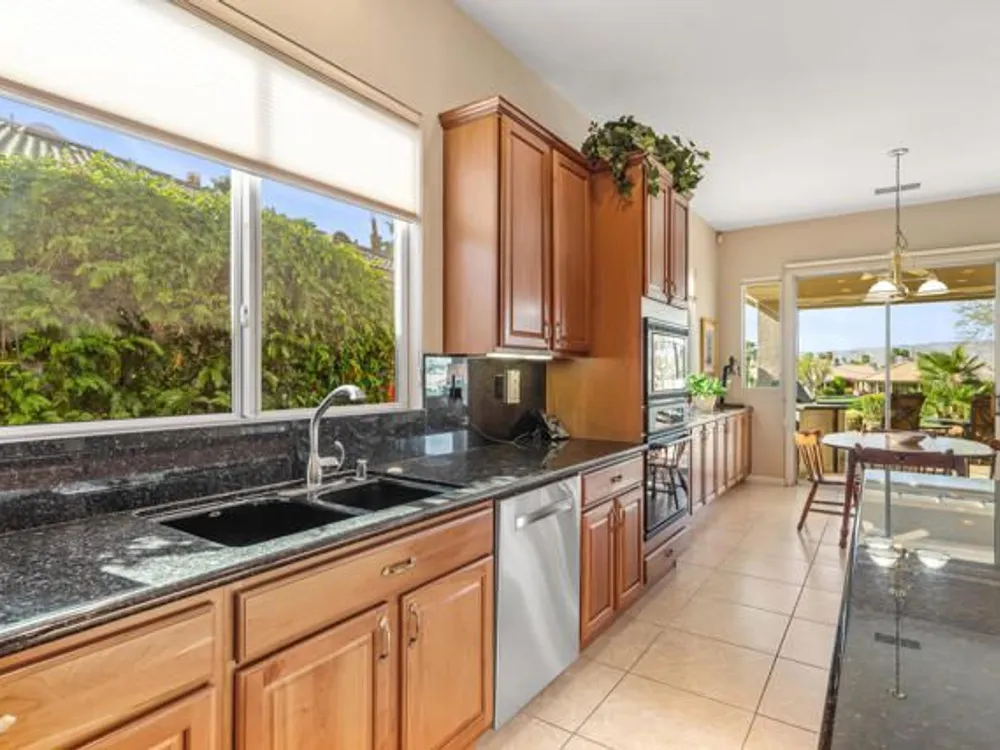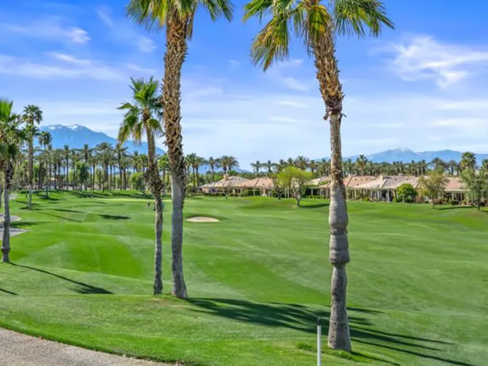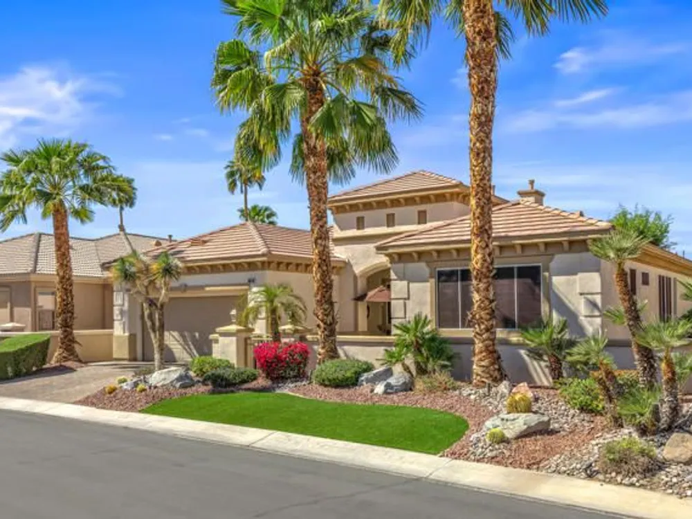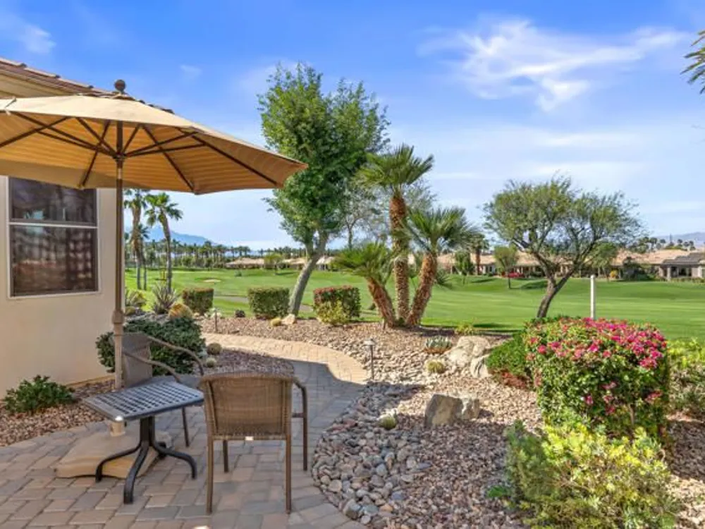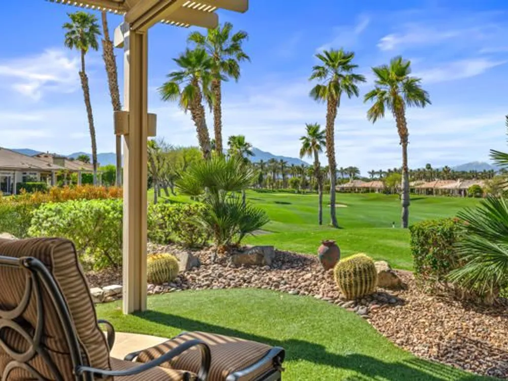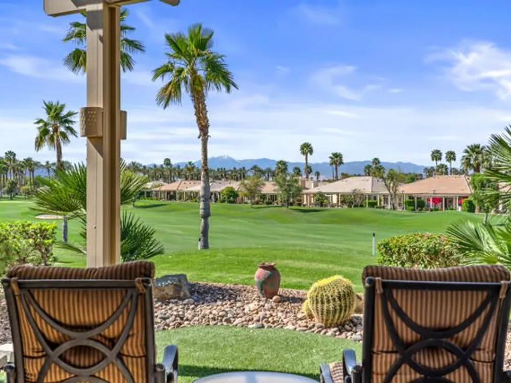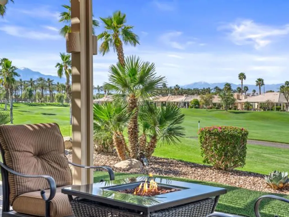 BEAUTIFUL PANORAMIC Fairway & Mountain views from this elevated site on the 15th fairway in Heritage Palms. Featuring 3 bedrooms, 2 1/2 baths, a large open design with fireplace in the family room, beautiful slab granite kitchen counters with cherry wood cabinetry including the optional buffet, stainless/black appliances, and upgraded picture windows replacements of the entire rear/view side of the home. The spacious primary suite with optional bay window features a large bathroom with soaking tub, separate shower, dual vanities, walk-in closet and french door to your covered rear patio with flagstone style overlay. Motorized drop down shades, brick paver walkway, drought tolerant desert landscaping, artificial turf and plenty of room for entertaining your friends & family or simply taking in the spectacular views. Bedroom #2 not shown in pictures. ( please refer to the floor plan shown). Additional upgrades include brick paver driveway, golf cart parking area, hanging racks, garage A/C unit, both of the homes A/C units and furnaces have also been replaced. Heritage Palms is a premier adult community featuring an 18 hole championship golf course, indoor & outdoor pools, pickleball & tennis courts, fitness center, billiards room, card rooms, grill room, social clubs and more.
