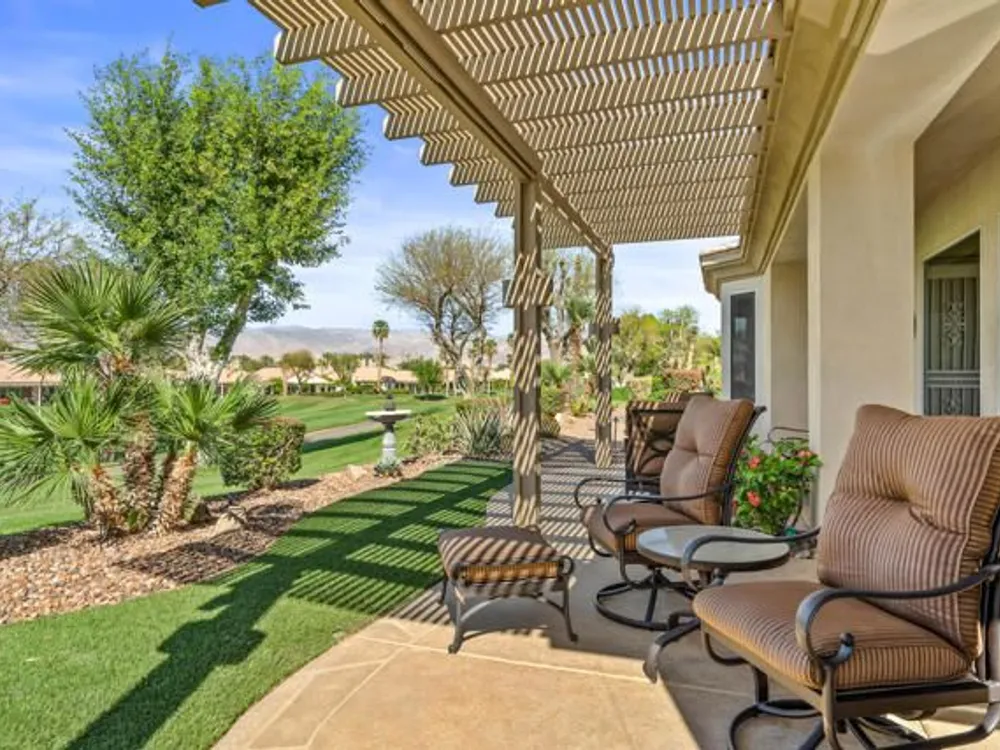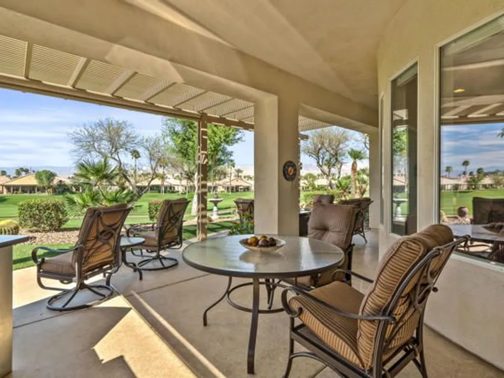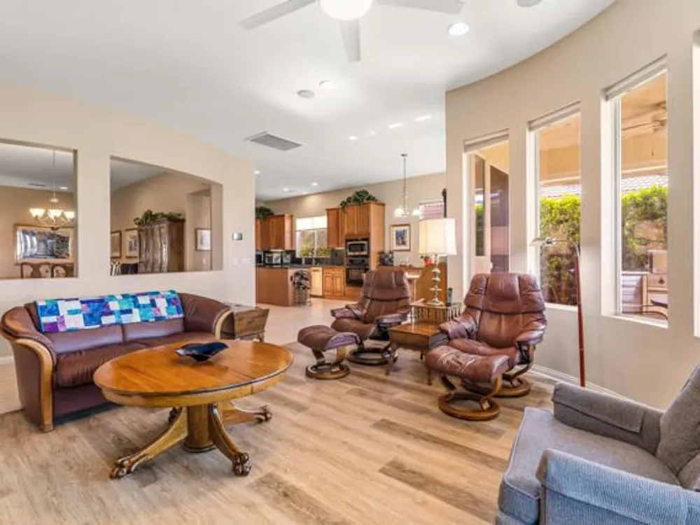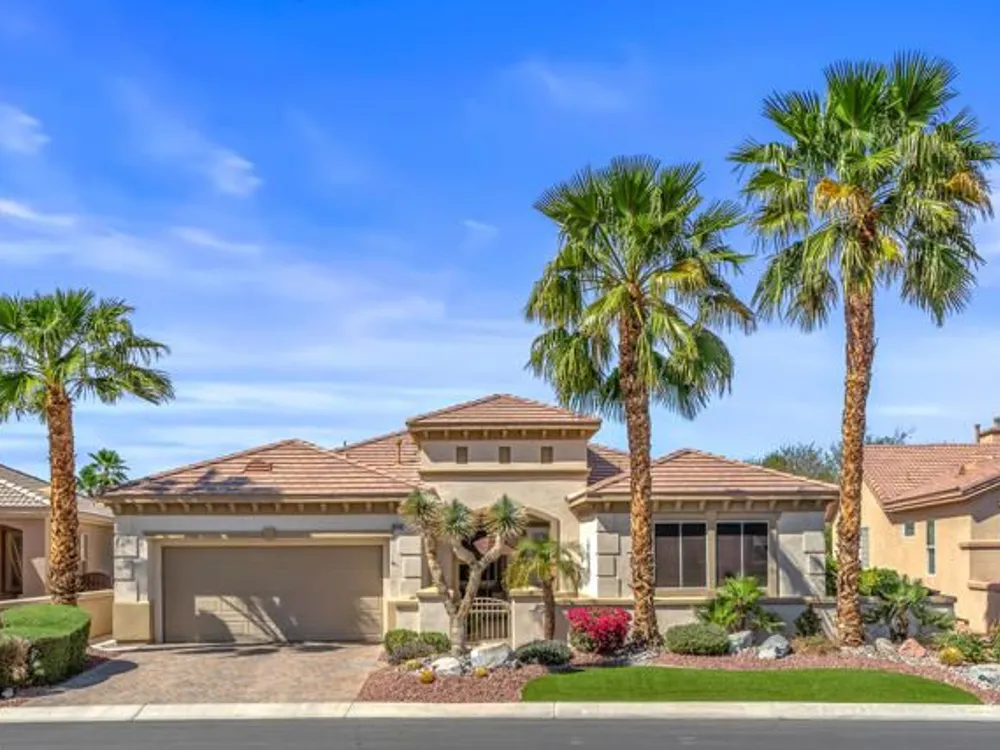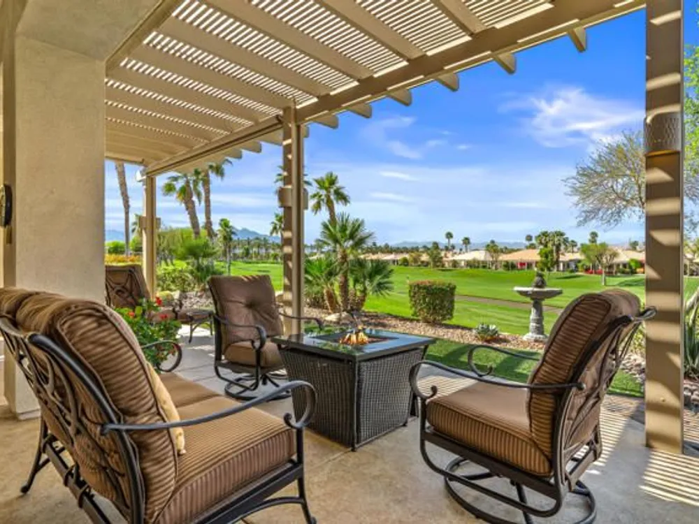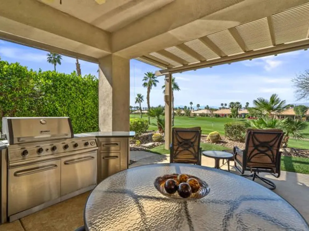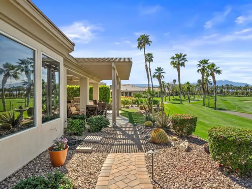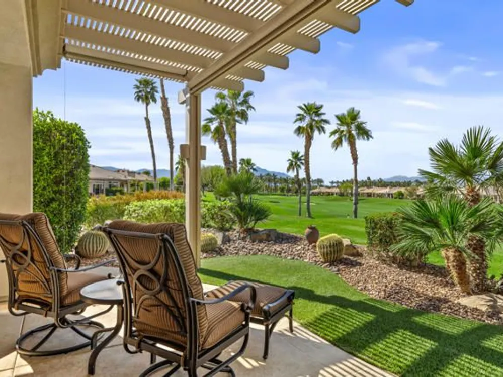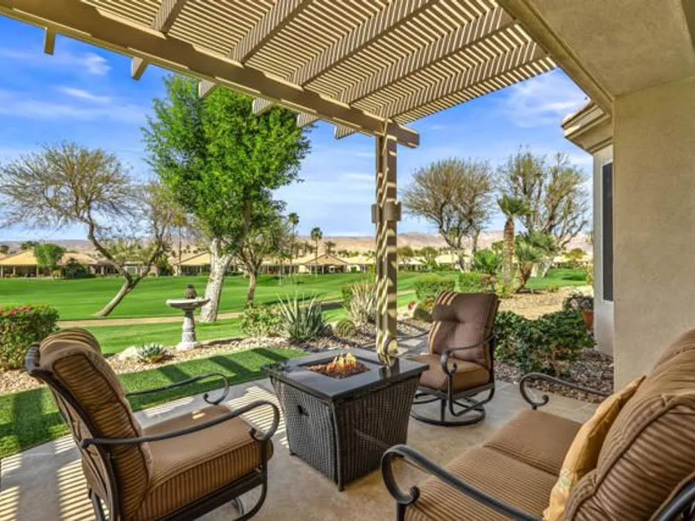 BEAUTIFUL PANORAMIC Fairway & Mountain views from this elevated site on the 15th fairway in Heritage Palms. Featuring 3 bedrooms, 2 1/2 baths, a large open design with fireplace in the family room, beautiful slab granite kitchen counters with cherry wood cabinetry including the optional buffet, stainless/black appliances, and upgraded picture windows replacements of the entire rear/view side of the home. The spacious primary suite with optional bay window features a large bathroom with soaking tub, separate shower, dual vanities, walk-in closet and french door to your covered rear patio with flagstone style overlay. Motorized drop down shades, brick paver walkway, drought tolerant desert landscaping, artificial turf and plenty of room for entertaining your friends & family or simply taking in the spectacular views. Bedroom #2 not shown in pictures. ( please refer to the floor plan shown). Additional upgrades include brick paver driveway, golf cart parking area, hanging racks, garage A/C unit, both of the homes A/C units and furnaces have also been replaced. Heritage Palms is a premier adult community featuring an 18 hole championship golf course, indoor & outdoor pools, pickleball & tennis courts, fitness center, billiards room, card rooms, grill room, social clubs and more.