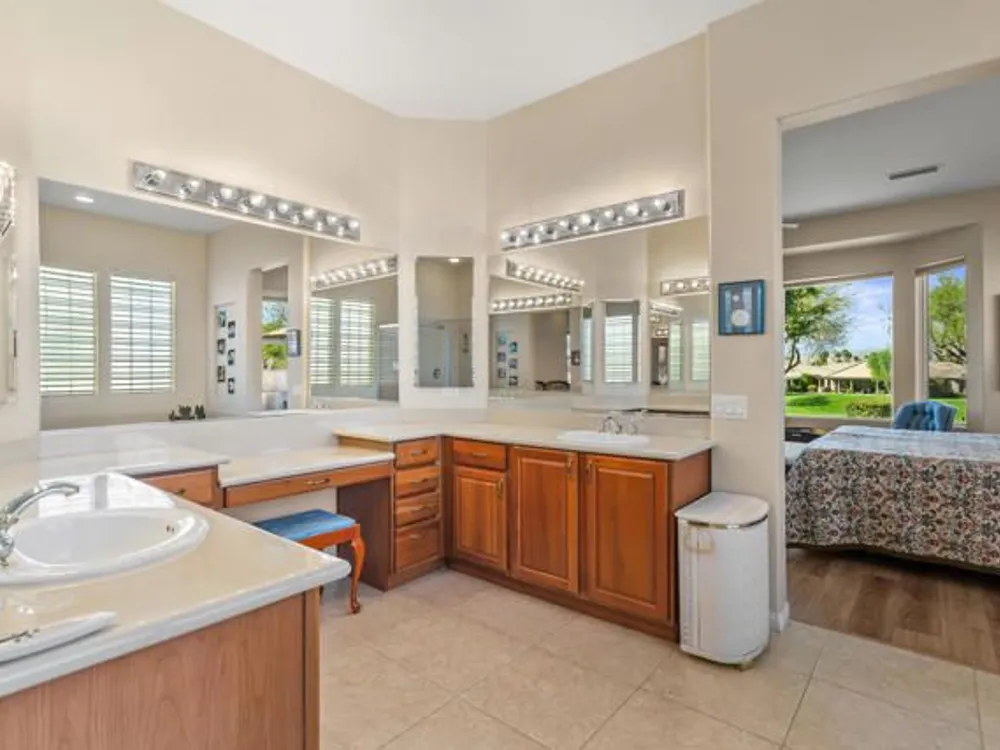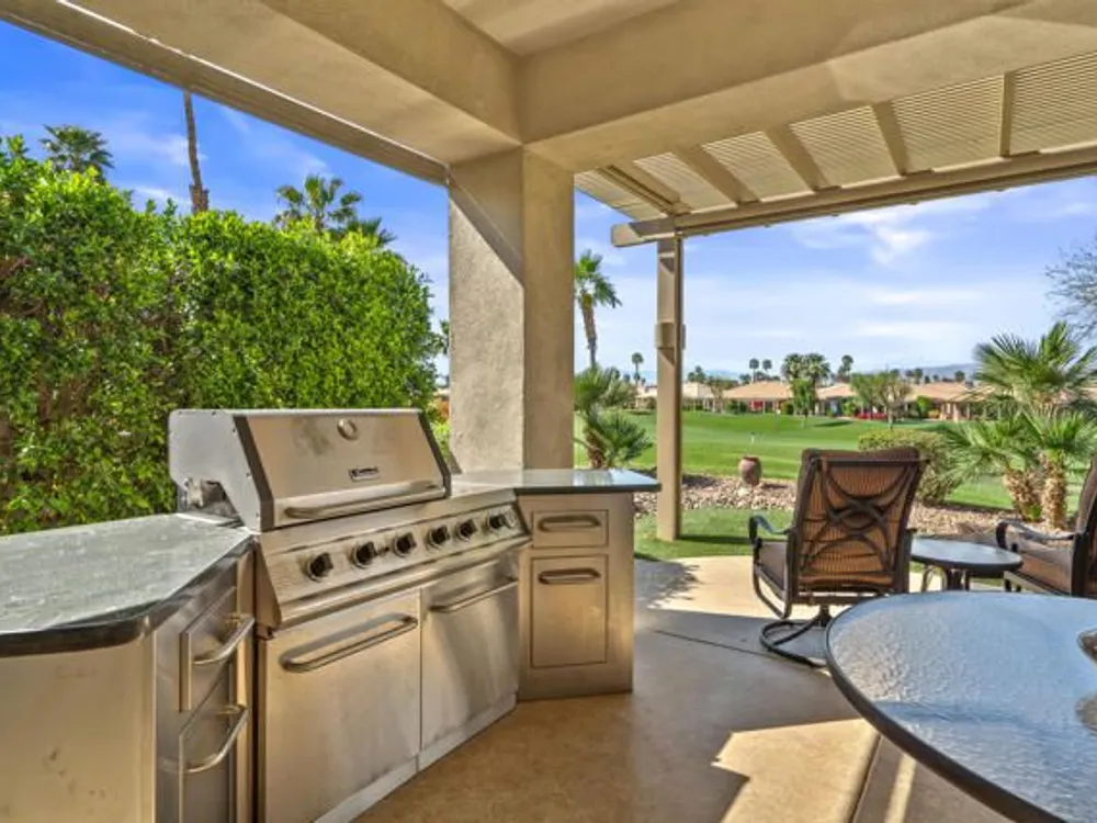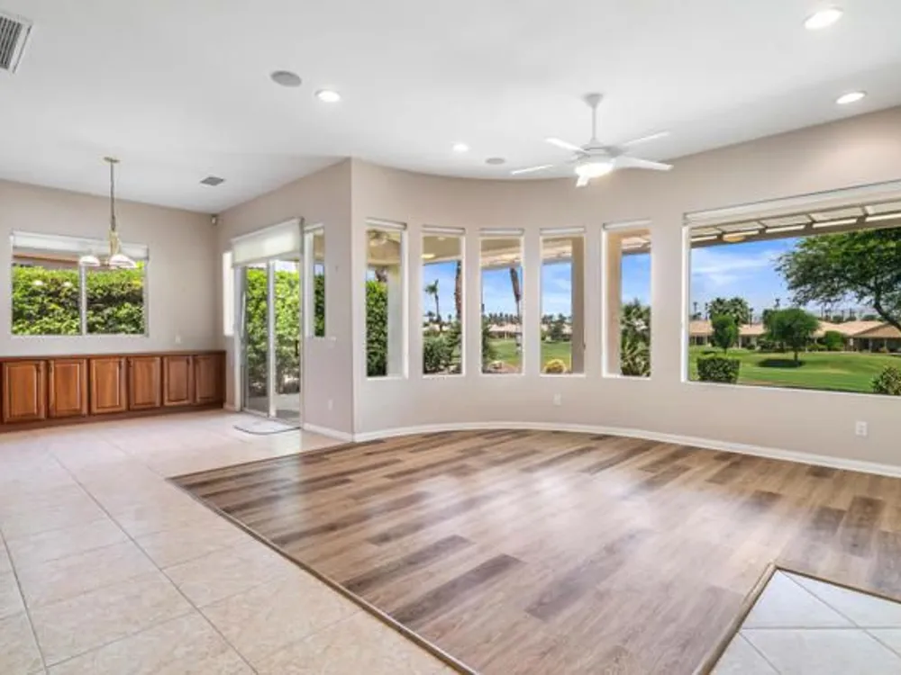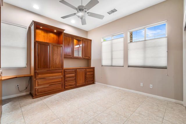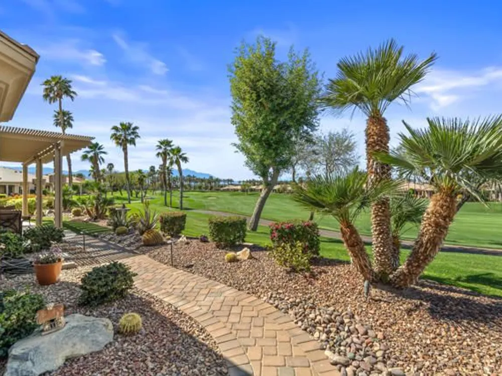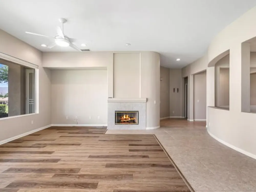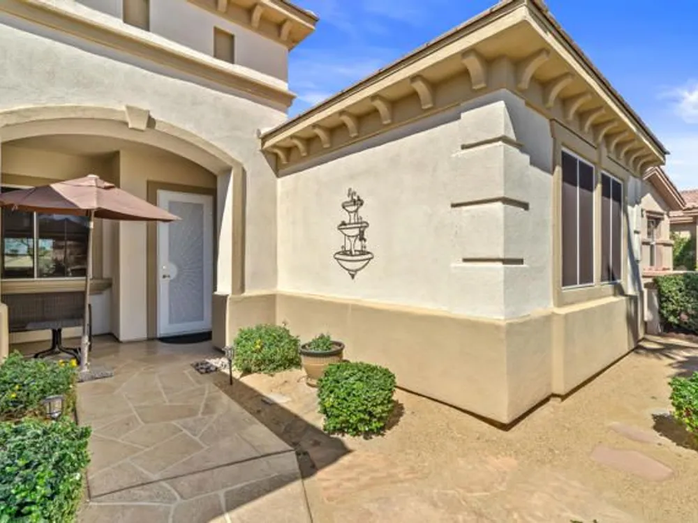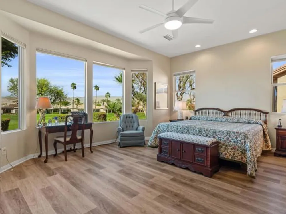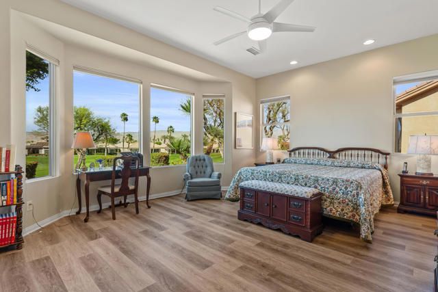 BEAUTIFUL PANORAMIC Fairway & Mountain views from this elevated site on the 15th fairway in Heritage Palms. Featuring 3 bedrooms, 2 1/2 baths, a large open design with fireplace in the family room, beautiful slab granite kitchen counters with cherry wood cabinetry including the optional buffet, stainless/black appliances, and upgraded picture windows replacements of the entire rear/view side of the home. The spacious primary suite with optional bay window features a large bathroom with soaking tub, separate shower, dual vanities, walk-in closet and french door to your covered rear patio with flagstone style overlay. Motorized drop down shades, brick paver walkway, drought tolerant desert landscaping, artificial turf and plenty of room for entertaining your friends & family or simply taking in the spectacular views. Bedroom #2 not shown in pictures. ( please refer to the floor plan shown). Additional upgrades include brick paver driveway, golf cart parking area, hanging racks, garage A/C unit, both of the homes A/C units and furnaces have also been replaced. Heritage Palms is a premier adult community featuring an 18 hole championship golf course, indoor & outdoor pools, pickleball & tennis courts, fitness center, billiards room, card rooms, grill room, social clubs and more.