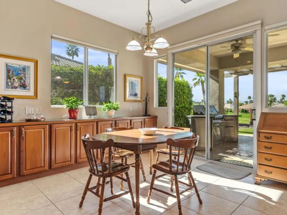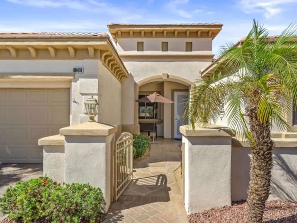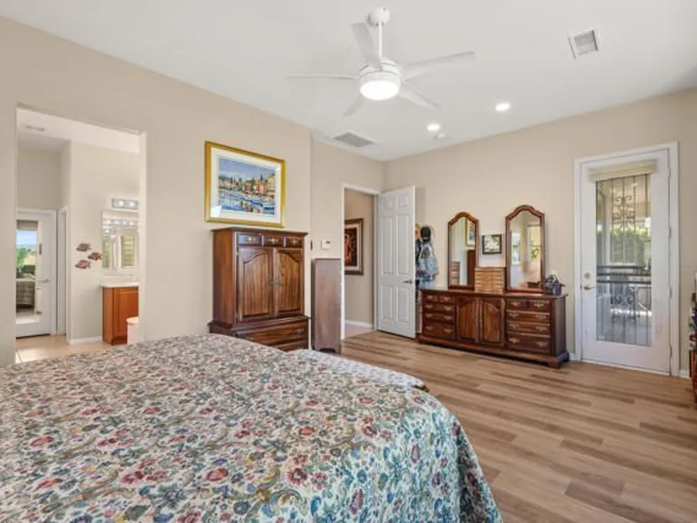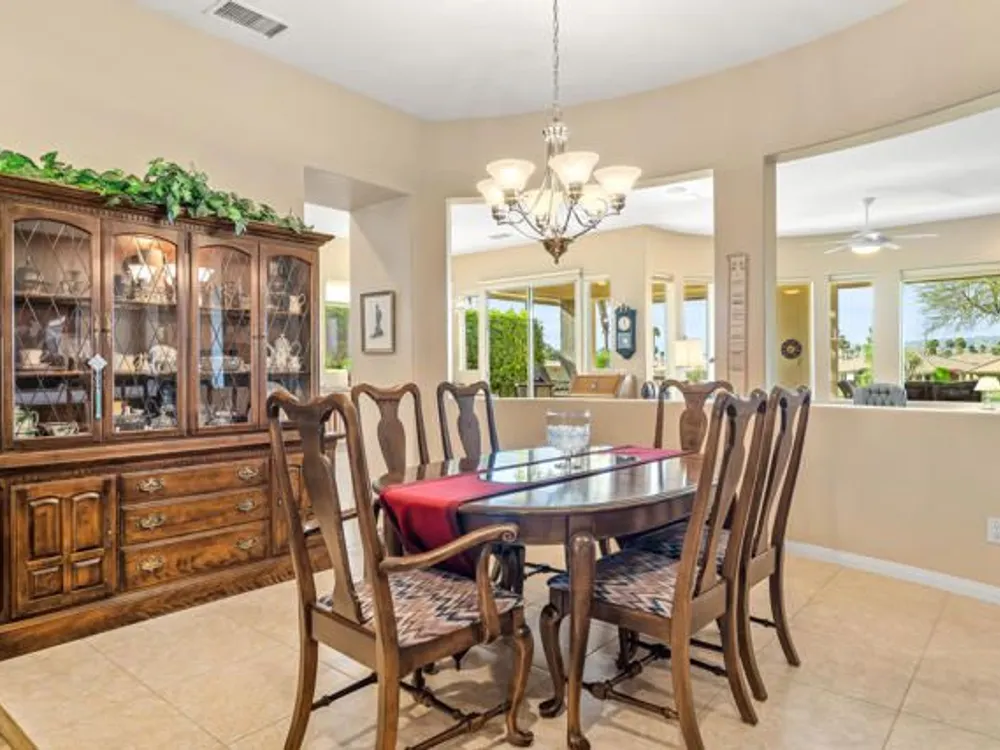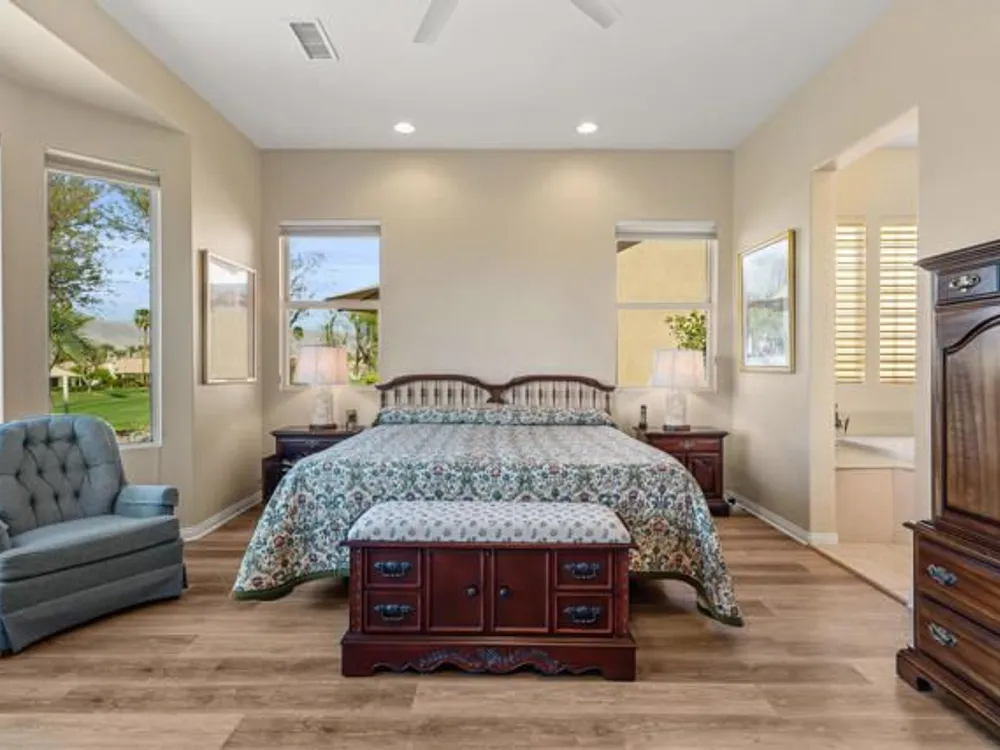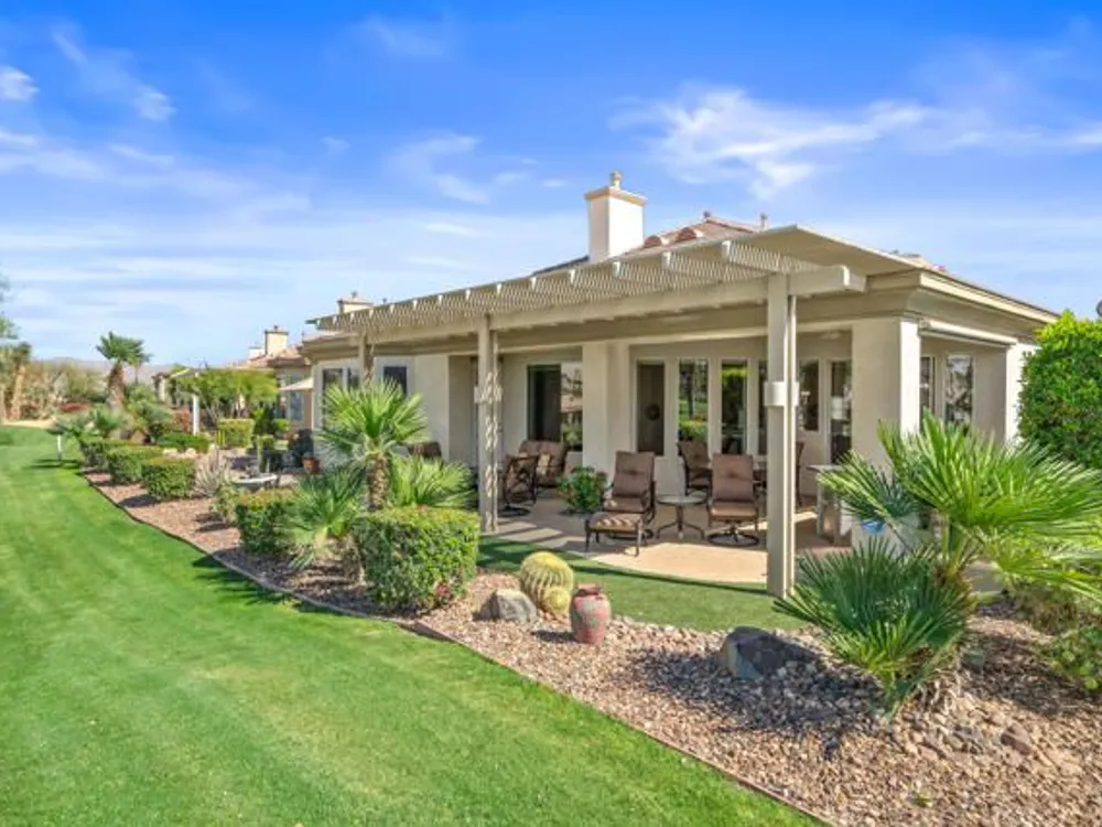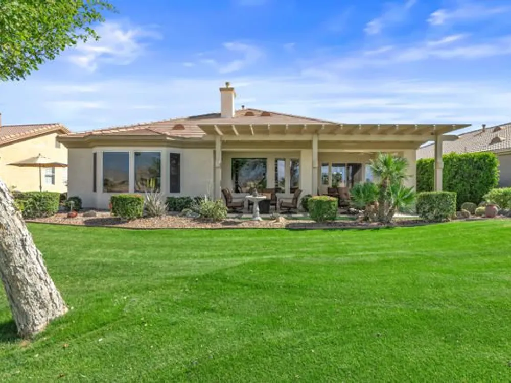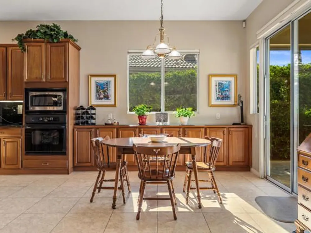 BEAUTIFUL PANORAMIC Fairway & Mountain views from this elevated site on the 15th fairway in Heritage Palms. Featuring 3 bedrooms, 2 1/2 baths, a large open design with fireplace in the family room, beautiful slab granite kitchen counters with cherry wood cabinetry including the optional buffet, stainless/black appliances, and upgraded picture windows replacements of the entire rear/view side of the home. The spacious primary suite with optional bay window features a large bathroom with soaking tub, separate shower, dual vanities, walk-in closet and french door to your covered rear patio with flagstone style overlay. Motorized drop down shades, brick paver walkway, drought tolerant desert landscaping, artificial turf and plenty of room for entertaining your friends & family or simply taking in the spectacular views. Bedroom #2 not shown in pictures. ( please refer to the floor plan shown). Additional upgrades include brick paver driveway, golf cart parking area, hanging racks, garage A/C unit, both of the homes A/C units and furnaces have also been replaced. Heritage Palms is a premier adult community featuring an 18 hole championship golf course, indoor & outdoor pools, pickleball & tennis courts, fitness center, billiards room, card rooms, grill room, social clubs and more.