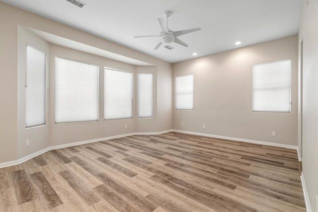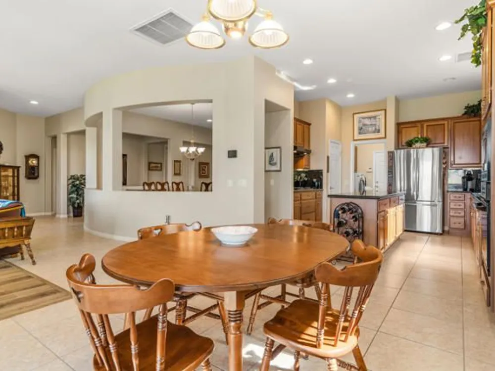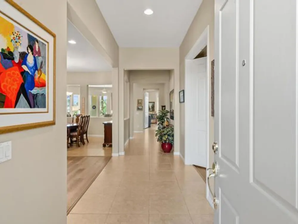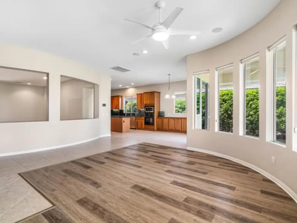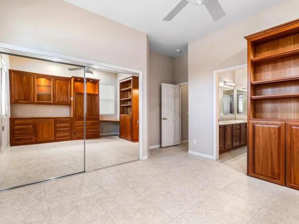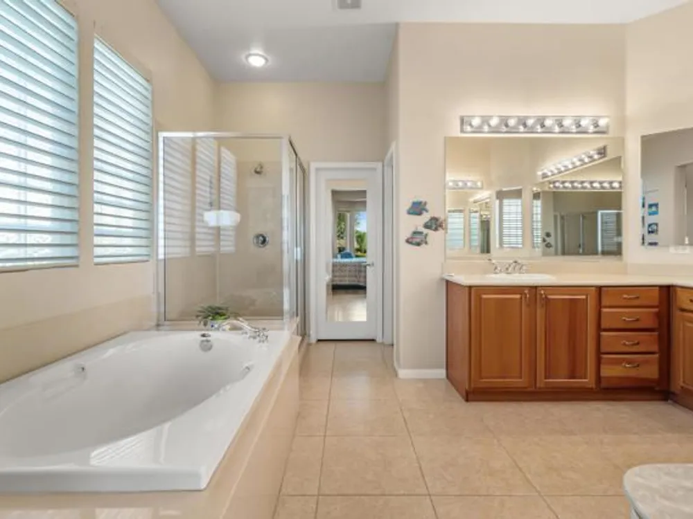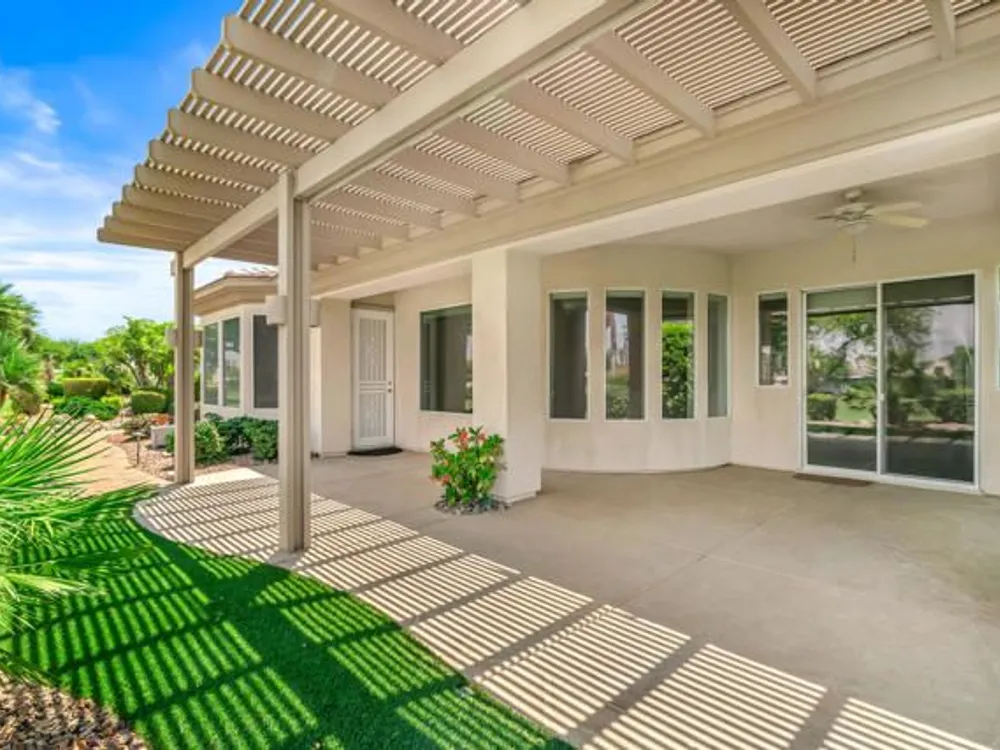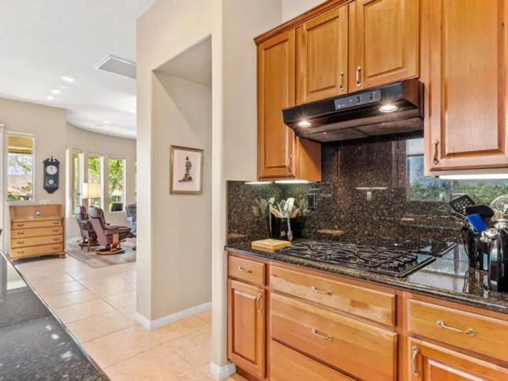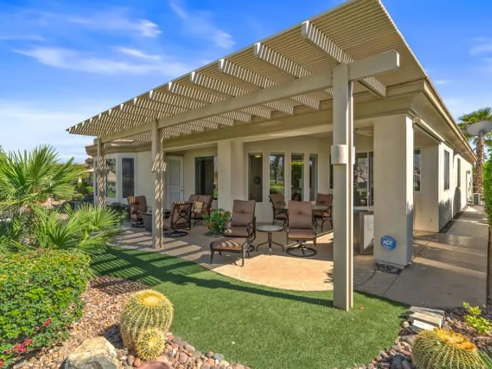 BEAUTIFUL PANORAMIC Fairway & Mountain views from this elevated site on the 15th fairway in Heritage Palms. Featuring 3 bedrooms, 2 1/2 baths, a large open design with fireplace in the family room, beautiful slab granite kitchen counters with cherry wood cabinetry including the optional buffet, stainless/black appliances, and upgraded picture windows replacements of the entire rear/view side of the home. The spacious primary suite with optional bay window features a large bathroom with soaking tub, separate shower, dual vanities, walk-in closet and french door to your covered rear patio with flagstone style overlay. Motorized drop down shades, brick paver walkway, drought tolerant desert landscaping, artificial turf and plenty of room for entertaining your friends & family or simply taking in the spectacular views. Bedroom #2 not shown in pictures. ( please refer to the floor plan shown). Additional upgrades include brick paver driveway, golf cart parking area, hanging racks, garage A/C unit, both of the homes A/C units and furnaces have also been replaced. Heritage Palms is a premier adult community featuring an 18 hole championship golf course, indoor & outdoor pools, pickleball & tennis courts, fitness center, billiards room, card rooms, grill room, social clubs and more.