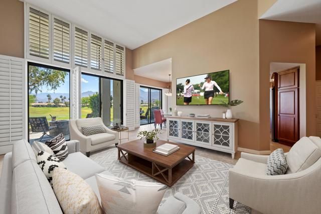 Stunning location on the 14th fairway of the acclaimed PGA West Stadium Course. This beautiful Champion 3 model showcases sweeping double fairway views with the dramatic Santa Rosa mountains as a backdrop. Featuring 3 bedrooms and 2.5 baths, this property offers an exceptional layout ideal for both quiet enjoyment and effortless entertaining. The interior welcomes you with neutral tile flooring and the kitchen is accented with granite counters and stainless appliances. Both primary and guest bathrooms have been beautifully updated. Key upgrades include a tankless hot water heater, 2018 HVAC system with Nest thermostat, plus all windows and slider glass seals installed in 2024 for improved energy efficiency. The expansive rear patio-complete with retractable awning-is a true highlight. It offers seamless extension of indoor living space and the perfect setting to enjoy your morning coffee, al fresco dining and premier views of the American Express golf tournament. Just a short stroll to one of the many community pools and spas, this home provides a suberb blend of privacy and accessibility. Homeowners enjoy the convenience of an HOA that covers exterior maintenance, cable/WIFI, landscaping, trash, and 24 hour guard gated security. PGA West offers a range of membership opportunities with access to six world class golf courses, tennis, pickleball, fitness, multiple dining venues, a vibrant social calendar, dog park and Bocce courts. Located minutes to Old Town La Quinta, residents are close to boutique shopping, cafes, fine dining, retail, supermarkets and fabulous seasonal activities, farmers market and art festivals. An exceptional opportunity to enjoy the best of resort living in one of La Quinta's premier communities. Living room/guest/primary bedrooms display virtual staging.