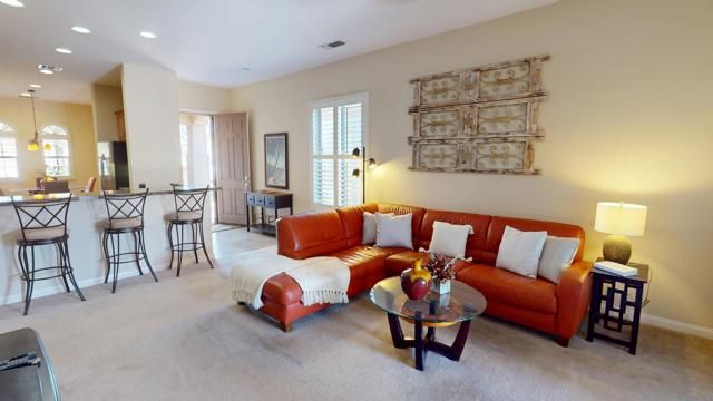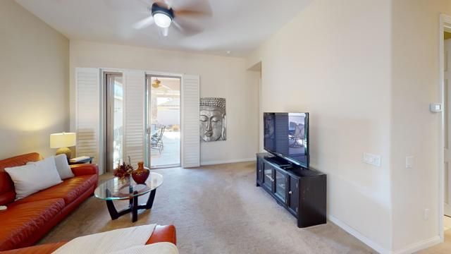 LEAST EXPENSIVE HOME with PRIVATE SPOOL in the community! Welcome to your SOUTHERN EXPOSURE desert oasis in Sun City Shadow Hills, a vibrant 55+ community! This sought-after Montoya model offers 3 bedrooms and 2 baths, blending comfort and style. The chef's kitchen features slab granite countertops, stainless steel appliances, a breakfast bar, and ample cabinetry. Relax in the primary suite with a spa-like ensuite and walk-in closet. Plantation shutters, lighted remote controlled ceiling fans offer added style and function, while the blend of tile and lush carpeted flooring offer added comfort. Outside is a private backyard retreat with an extended low maintenance aluma-wood type patio cover. The current owner had a combo beach access / tanning shelf large spool installed; an energy efficient balance between pool and spa lounging. There is also a gas firepit for added warmth and ambiance. The finished garage boasts plenty of built-in cabinets with a workbench area. Sun City Shadow Hills is located in the the lower cost Imperial Irrigation District, with lower power rates. Sun City Shadow Hills' world-class amenities include; Two Clubhouses, Two Bistros and a Restaurant, Tennis and Pickleball, Bocce, 2 Fitness Centers, 1 Indoor and 2 Outdoor Pools/Spas, 2 Dog Parks, a Championship Golf Course, a Challenging 3-Par Course and dozens of Social and Activity Clubs. Golf is extra and affordable. The low HOAs of only $369 monthly includes 24/7 guarded gates, security patrols, common area maintenance, internet and access to all activities, clubs and amenities.