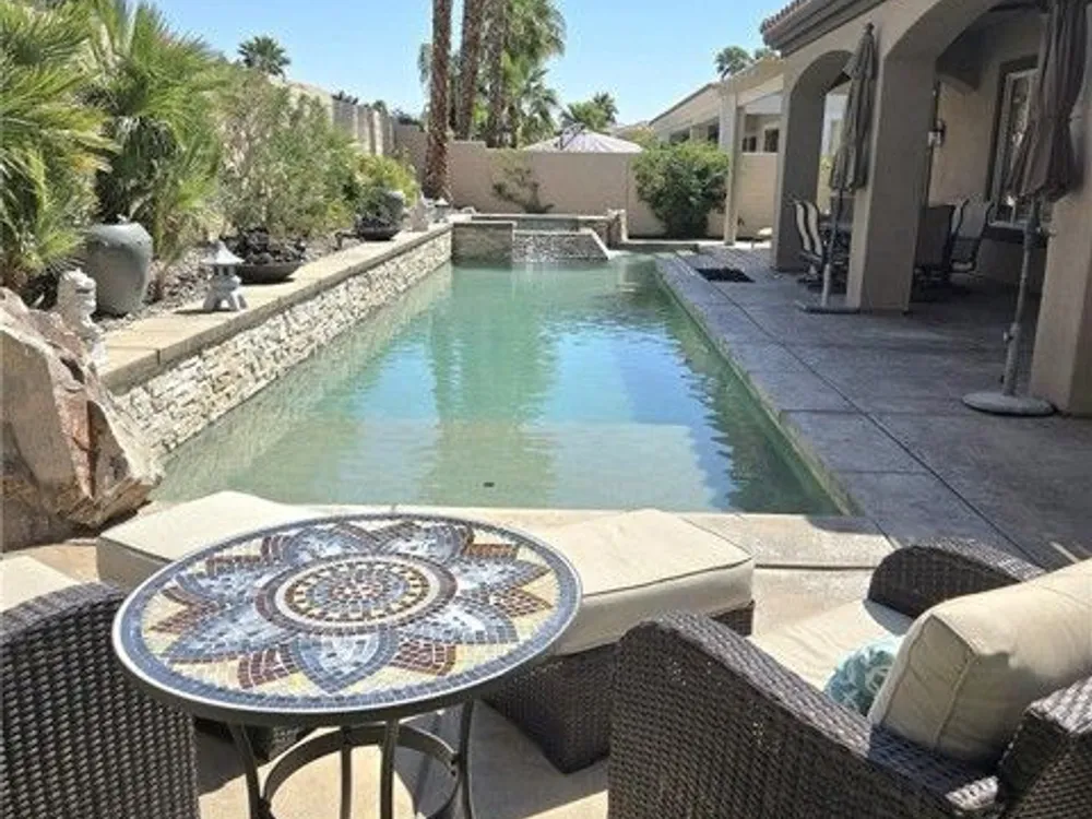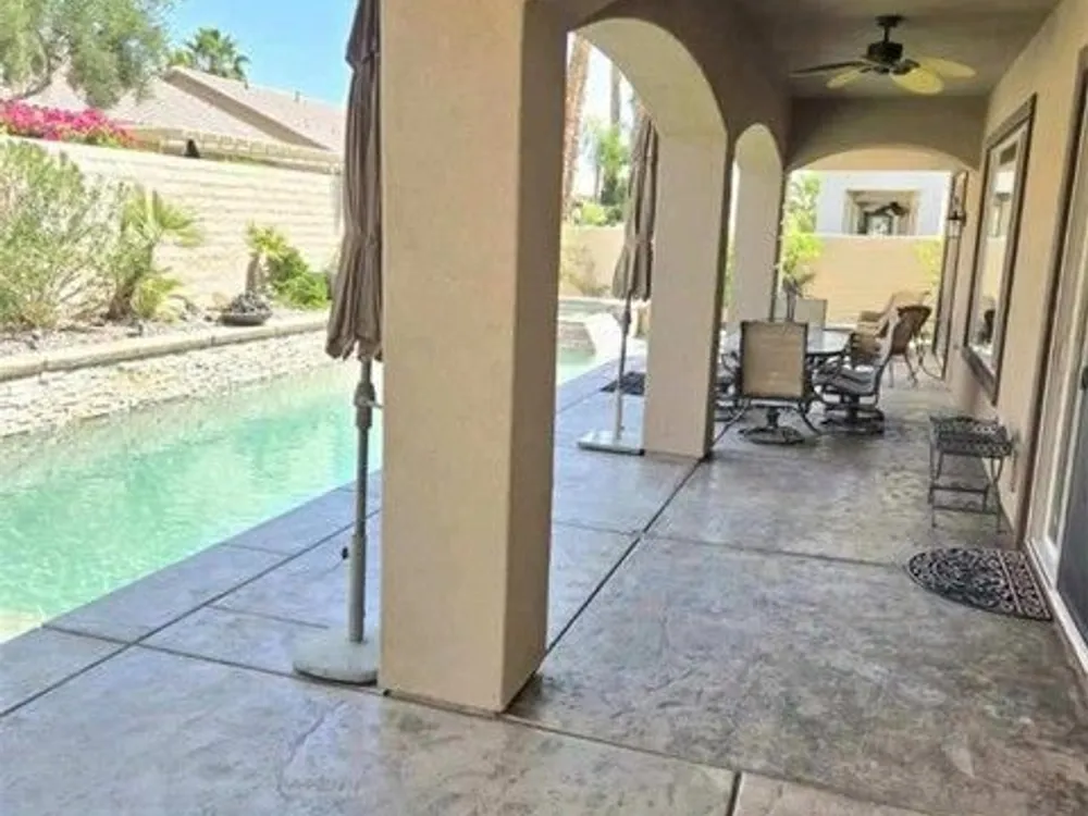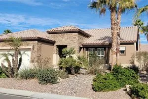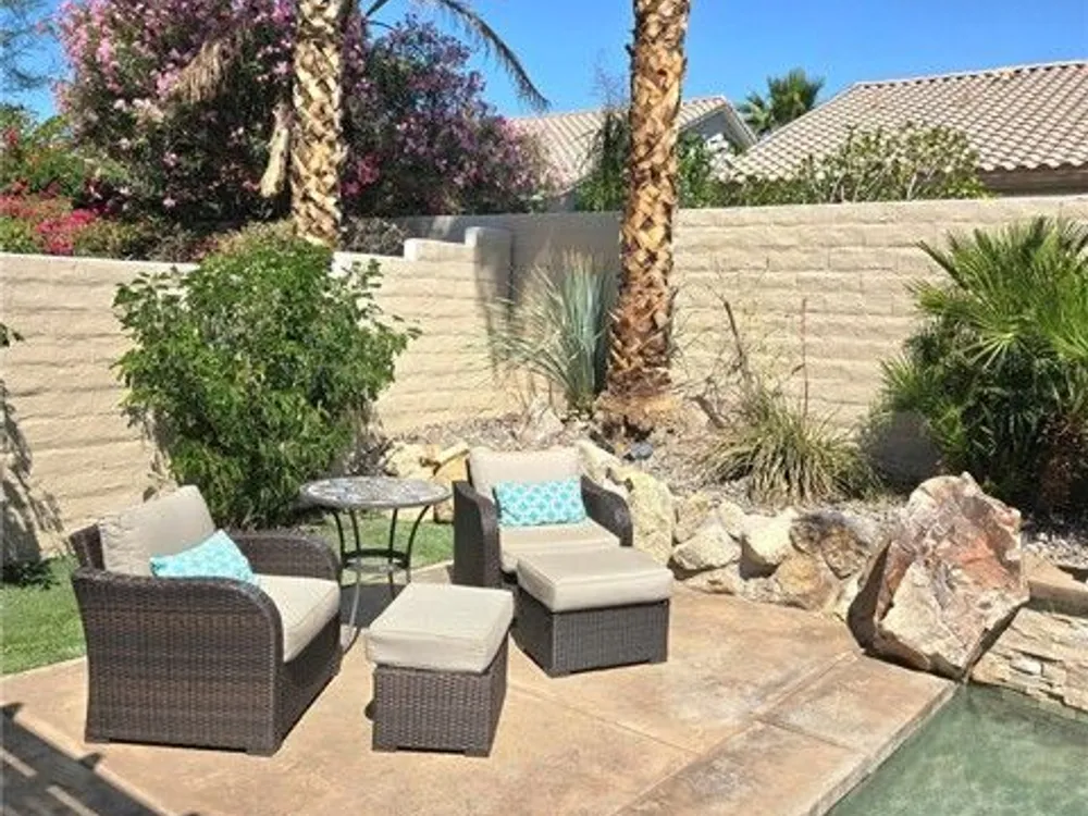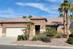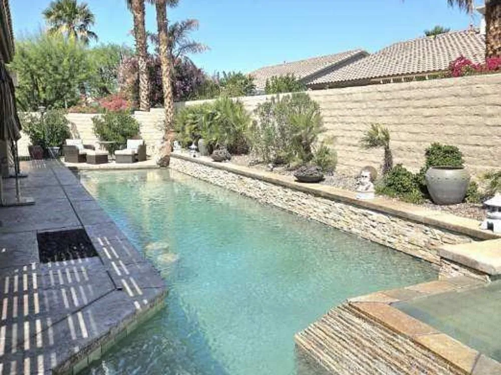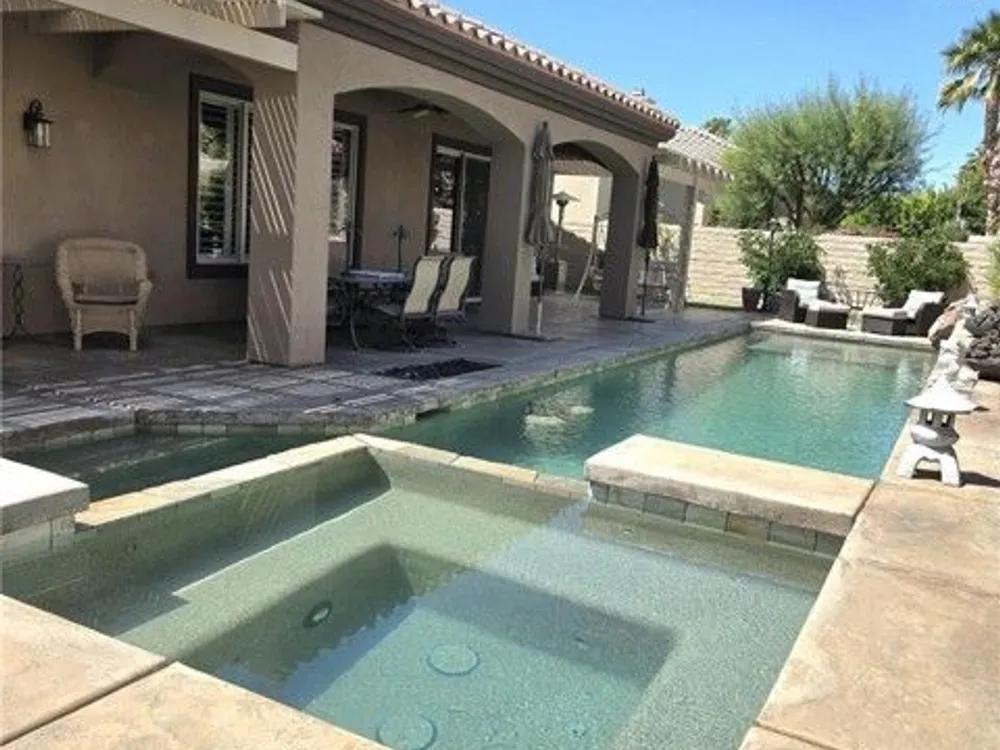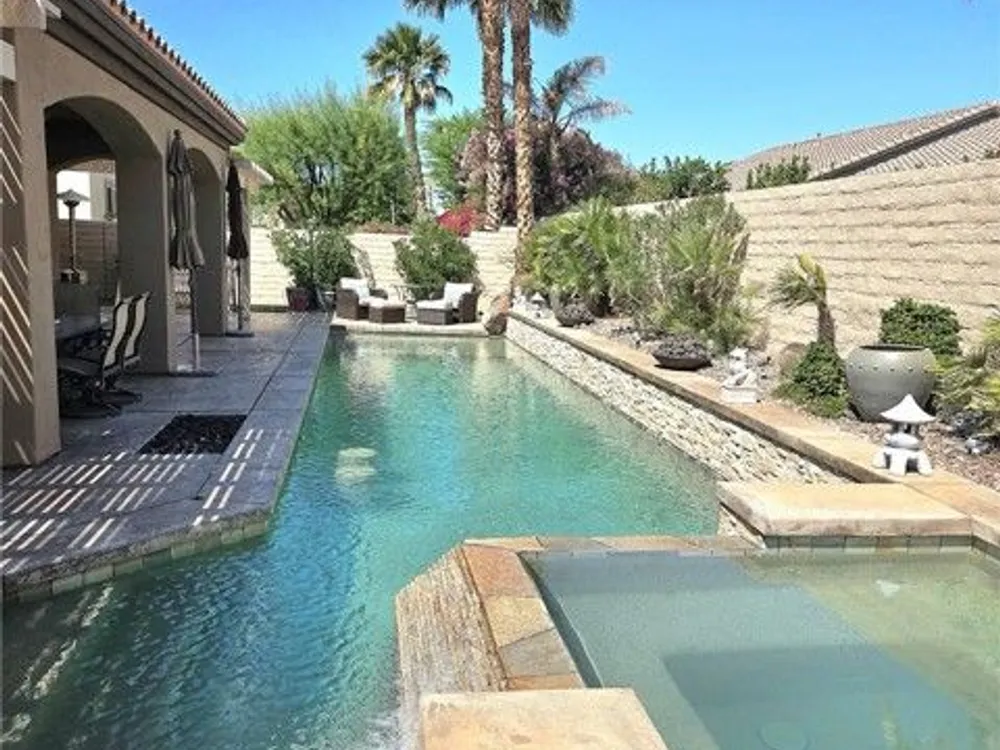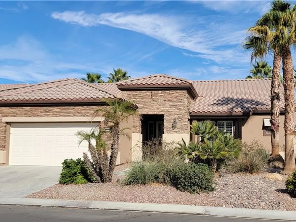 Welcome to the absolutely beautiful and stunning highly sought after San Rafael 3 bedroom 3 bathroom model home. The first thing you notice as you approach this special home is that it is freshly painted with extensive stacked stone on the garage and entry. The yard is professionally landscaped with drought tolerant plants and palms. As you pass the front entry you will observe the beautiful leaded glass door. The home features ten foot ceilings with crown molding throughout the entire home including the bathrooms, updated lighting, ceiling fans, solar tube lights, and additional spotlights added above the couch area. The custom designed large in-ground salt water Pebble-Tec heated pool has a tanning shelf, and two built in stools next to the fire pit, with an elevated spa including two waterfalls that cascade down the stack stone wall. This lap pool is over 50 foot long. The backyard has dual fire bowls on the stacked stone wall , the extended patio has a stamped concrete finish with alumawood covers on each side of the patio. This desirable open floor plan features a primary ensuite on one side where the bedroom has an attached large bathroom including a Jacuzzi soaking tub, walk in shower, with dual vanities sinks with a seating area for cosmetics and an attached walk-in closet with plenty of storage space and built-in cabinets and shoe racks. The two secondary bedrooms on the other side are separated by a shared Jack and Jill bathroom with double sinks. The gourmet kitchen has granite counters, black stainless steel appliances, gas double wall ovens, counter depth refrigerator, large walk-in pantry includes a glass door with palm designs, and breakfast bar at the island. The kitchen opens to a large living room with unlimited entertaining options. The air-conditioning was replaced in 2018. Other features include custom plantation shutters, 8 foot doors, a dedicated laundry room, The house features an extra deep 3 car garage with a back wall of tall storage cabinets with outdoor carpet flooring, and 3 spacious car driveway, well maintained, just the beautiful home you are looking for. Indulge in the amazing amenities of Sun City Shadow Hills, including two championship golf courses, multiple pools, hot tubs, clubhouses, fitness centers, billiards room, bocce ball courts, tennis, pickle ball, social club and so much. This is much more than a neighborhood, it is a lifestyle that will be the envy of your friends.