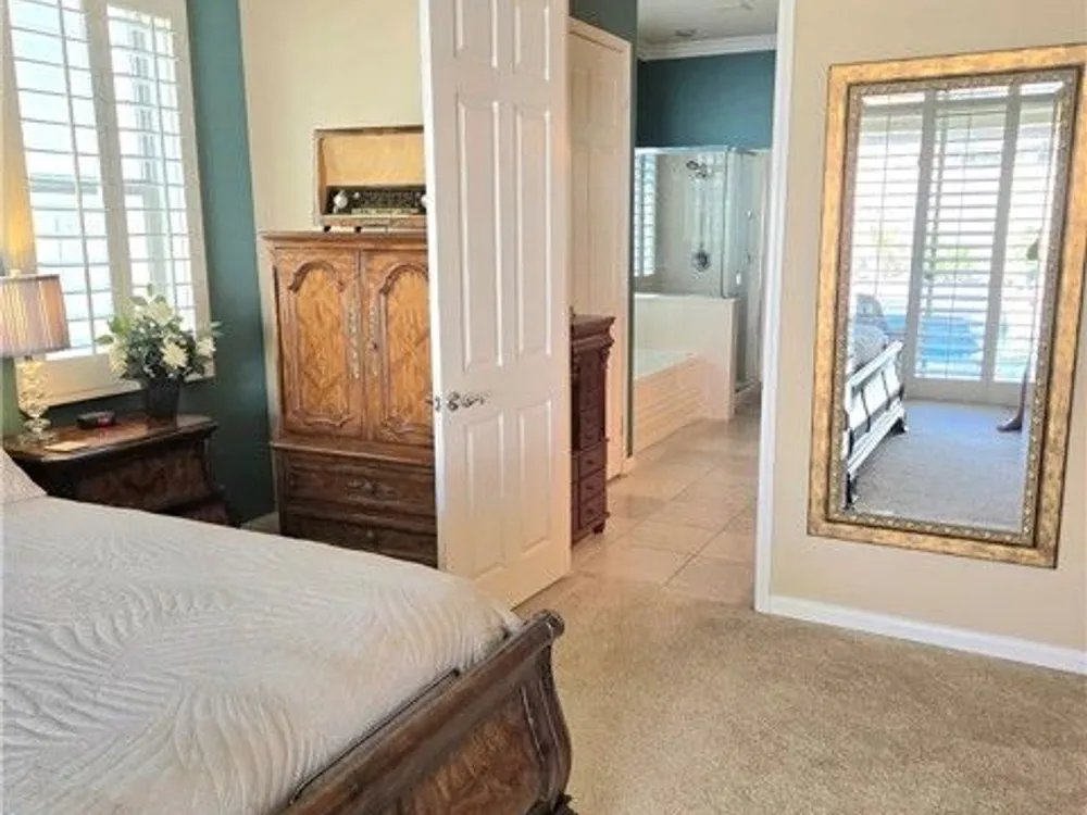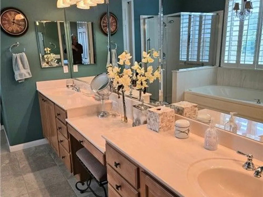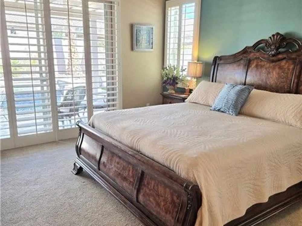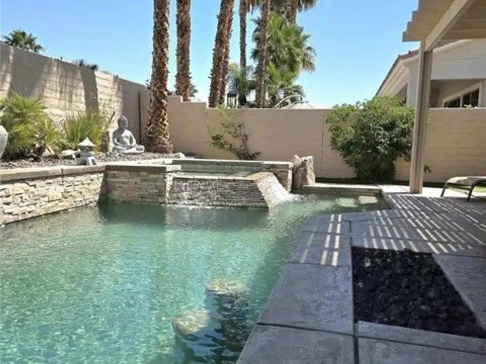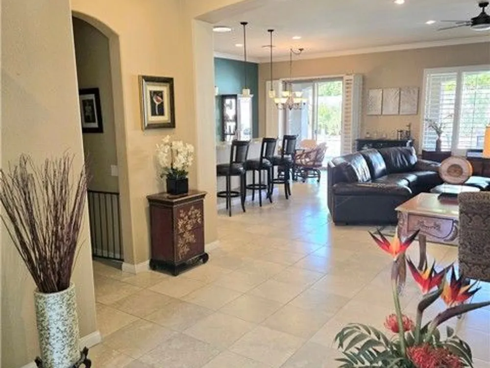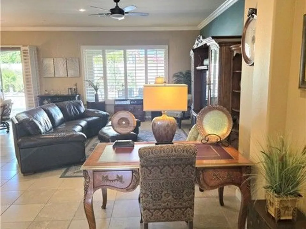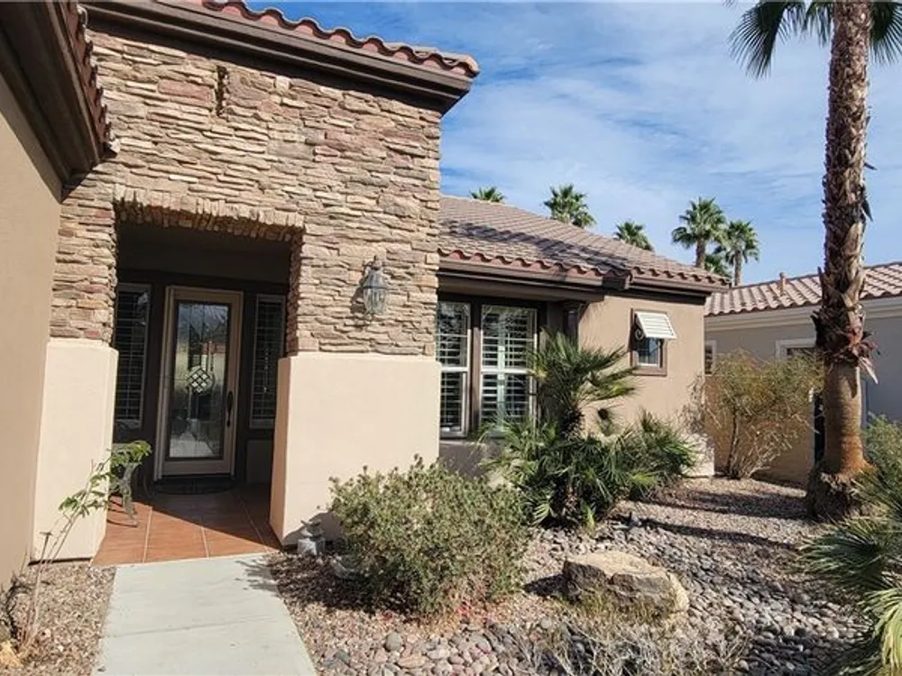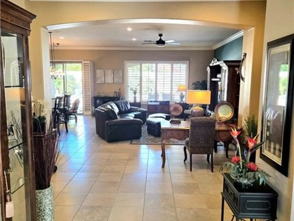 Welcome to the absolutely beautiful and stunning highly sought after San Rafael 3 bedroom 3 bathroom model home. The first thing you notice as you approach this special home is that it is freshly painted with extensive stacked stone on the garage and entry. The yard is professionally landscaped with drought tolerant plants and palms. As you pass the front entry you will observe the beautiful leaded glass door. The home features ten foot ceilings with crown molding throughout the entire home including the bathrooms, updated lighting, ceiling fans, solar tube lights, and additional spotlights added above the couch area. The custom designed large in-ground salt water Pebble-Tec heated pool has a tanning shelf, and two built in stools next to the fire pit, with an elevated spa including two waterfalls that cascade down the stack stone wall. This lap pool is over 50 foot long. The backyard has dual fire bowls on the stacked stone wall , the extended patio has a stamped concrete finish with alumawood covers on each side of the patio. This desirable open floor plan features a primary ensuite on one side where the bedroom has an attached large bathroom including a Jacuzzi soaking tub, walk in shower, with dual vanities sinks with a seating area for cosmetics and an attached walk-in closet with plenty of storage space and built-in cabinets and shoe racks. The two secondary bedrooms on the other side are separated by a shared Jack and Jill bathroom with double sinks. The gourmet kitchen has granite counters, black stainless steel appliances, gas double wall ovens, counter depth refrigerator, large walk-in pantry includes a glass door with palm designs, and breakfast bar at the island. The kitchen opens to a large living room with unlimited entertaining options. The air-conditioning was replaced in 2018. Other features include custom plantation shutters, 8 foot doors, a dedicated laundry room, The house features an extra deep 3 car garage with a back wall of tall storage cabinets with outdoor carpet flooring, and 3 spacious car driveway, well maintained, just the beautiful home you are looking for. Indulge in the amazing amenities of Sun City Shadow Hills, including two championship golf courses, multiple pools, hot tubs, clubhouses, fitness centers, billiards room, bocce ball courts, tennis, pickle ball, social club and so much. This is much more than a neighborhood, it is a lifestyle that will be the envy of your friends.