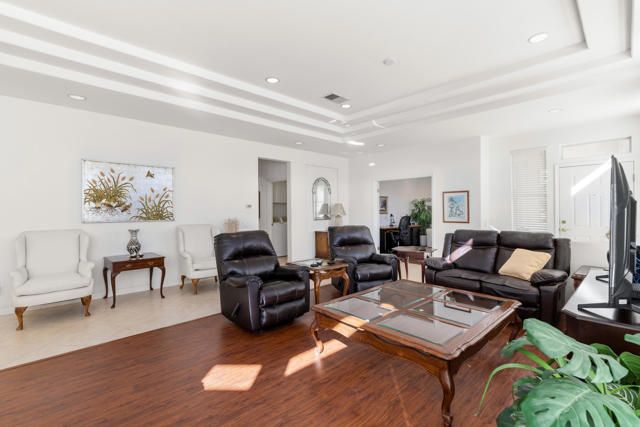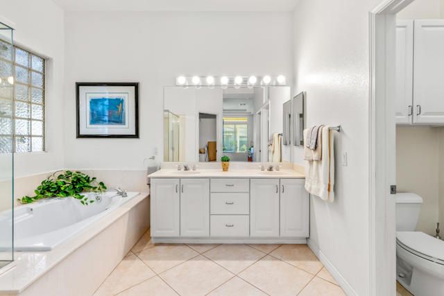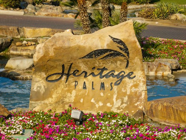 MOTIVATED SELLER - Light and bright, south facing Southampton plan located behind the gates in beautiful Heritage Palms CC. As you enter the home you are flooded with sunshine throughout and gorgeous mountain views off the back of the house. The home features 2 bedrooms plus a den that can be used as third bedroom, and two full baths. The spacious kitchen has been updated tile backsplash, new faucet, and light fixture. Carpeting has been removed and replaced with wood laminate flooring. The primary bath features dual vanities, soaking tub, and two large walk-in closets. The spacious back patio has ample space for dining and lounging. It's the perfect place to enjoy the beautiful mountain views and desert weather. The home has dual zoned A/C units, one was replaced in 2023. New water heater was installed as well. Washer and dryer were replaced in October 2025. The two car garage also has a golf cart garage space with storage cabinetry, and epoxy flooring throughout. Exterior has been painted, landscaping has been redesigned and sprinkler system has been reconfigured. Heritage Palms is premier adult community featuring an 18 hole championship golf course, indoor & outdoor pools, Pickleball & Tennis courts, fitness center, grill room, billiards room, card rooms, social clubs and more. Start enjoying your desert lifestyle today!