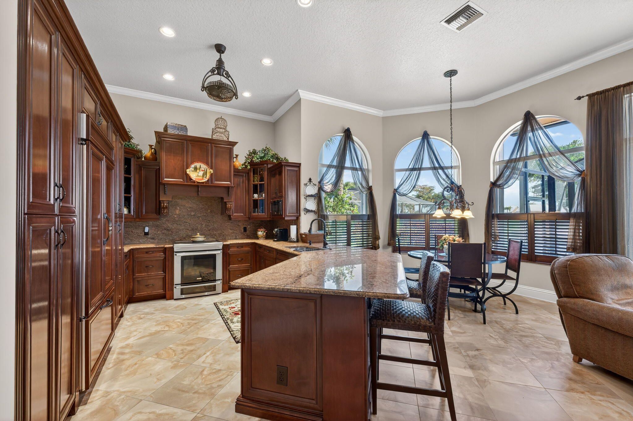 Experience the ''best of both worlds'' in the prestigious Estates at Aberdeen Golf & Country Club. Mandatory membership requires buy-in & annual dues. This home offers stunning lake & golf course views from a large, caged pool newly finished w/ Diamond Brite 2024 & heater. The interior features crown molding, knockdown ceilings, & a wet bar. The gourmet kitchen shines w/ KitchenAid appliances.Primary suite is a true retreat w/ coffered ceilings, 3 closets, & dual sinks. Modern comforts include 2 new AC units, a 2016 roof, & a laundry rm w/ sink/cabinets under air. Peace of mind is provided by hurricane windows, front/sides & accordion shutters. Complete w/ a circular paver driveway & elegant glass front door, this home is the pinnacle of Florida luxury living. Exceptional views & quality! Experience Aberdeen lifestyle to the fullest! Enjoy access to the golf course, tennis and pickleball courts, bocce ball courts, 3 restaurants, resort style pool and an array of activities that cater to diverse interests. Countless social events! Mandatory membership country club located in Boynton Beach!