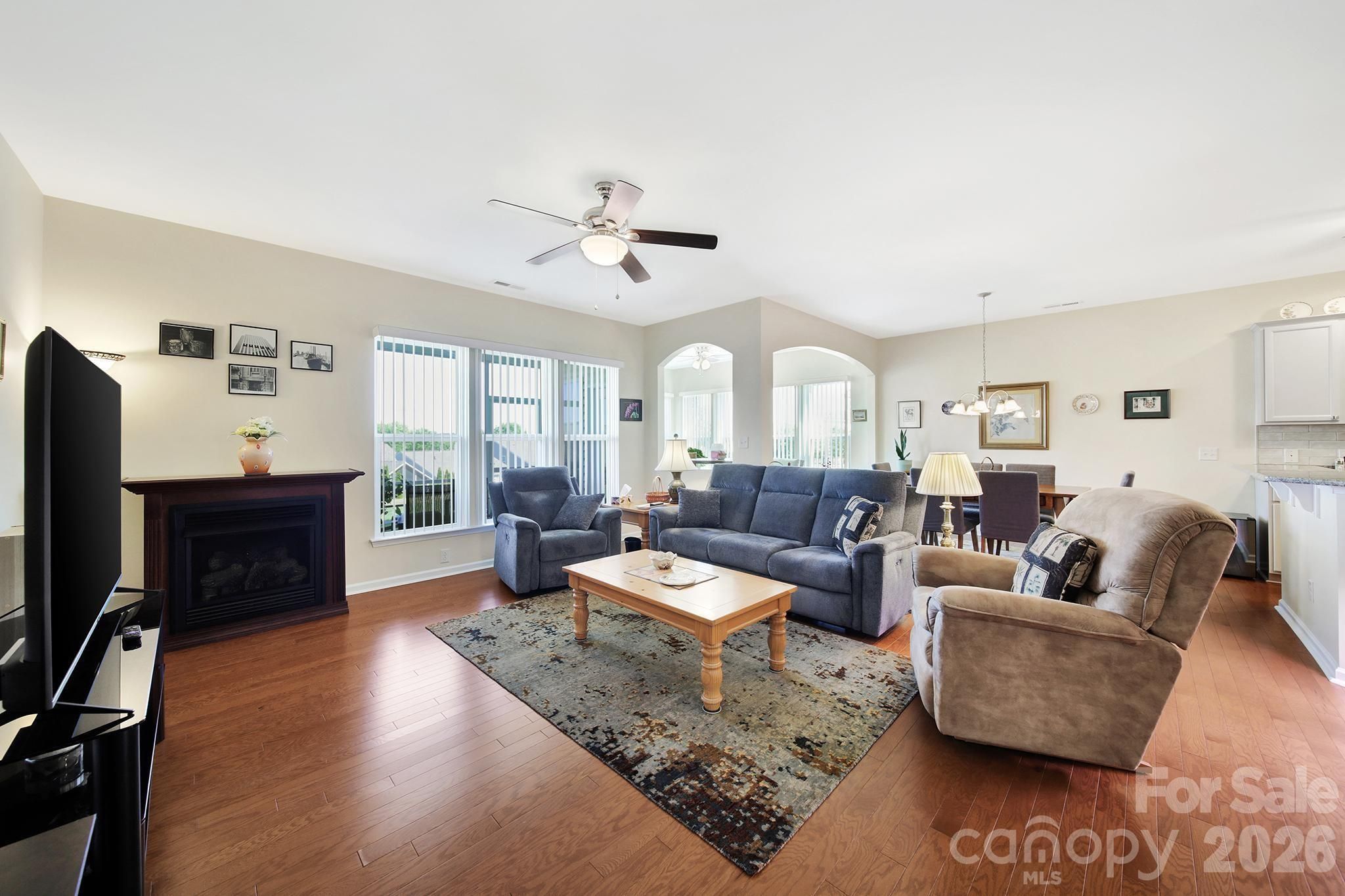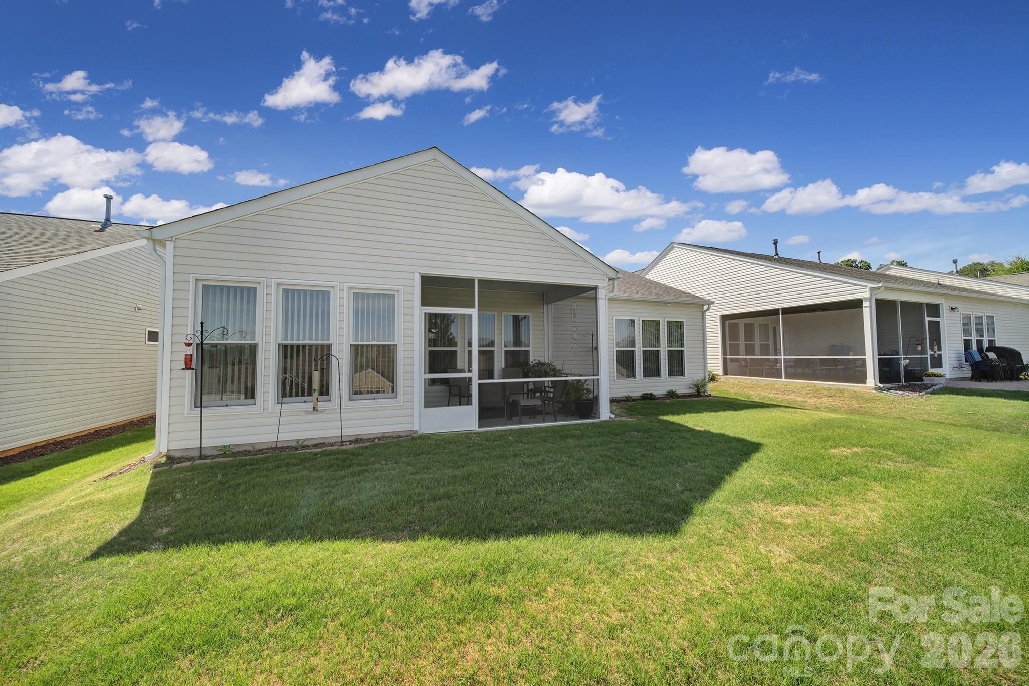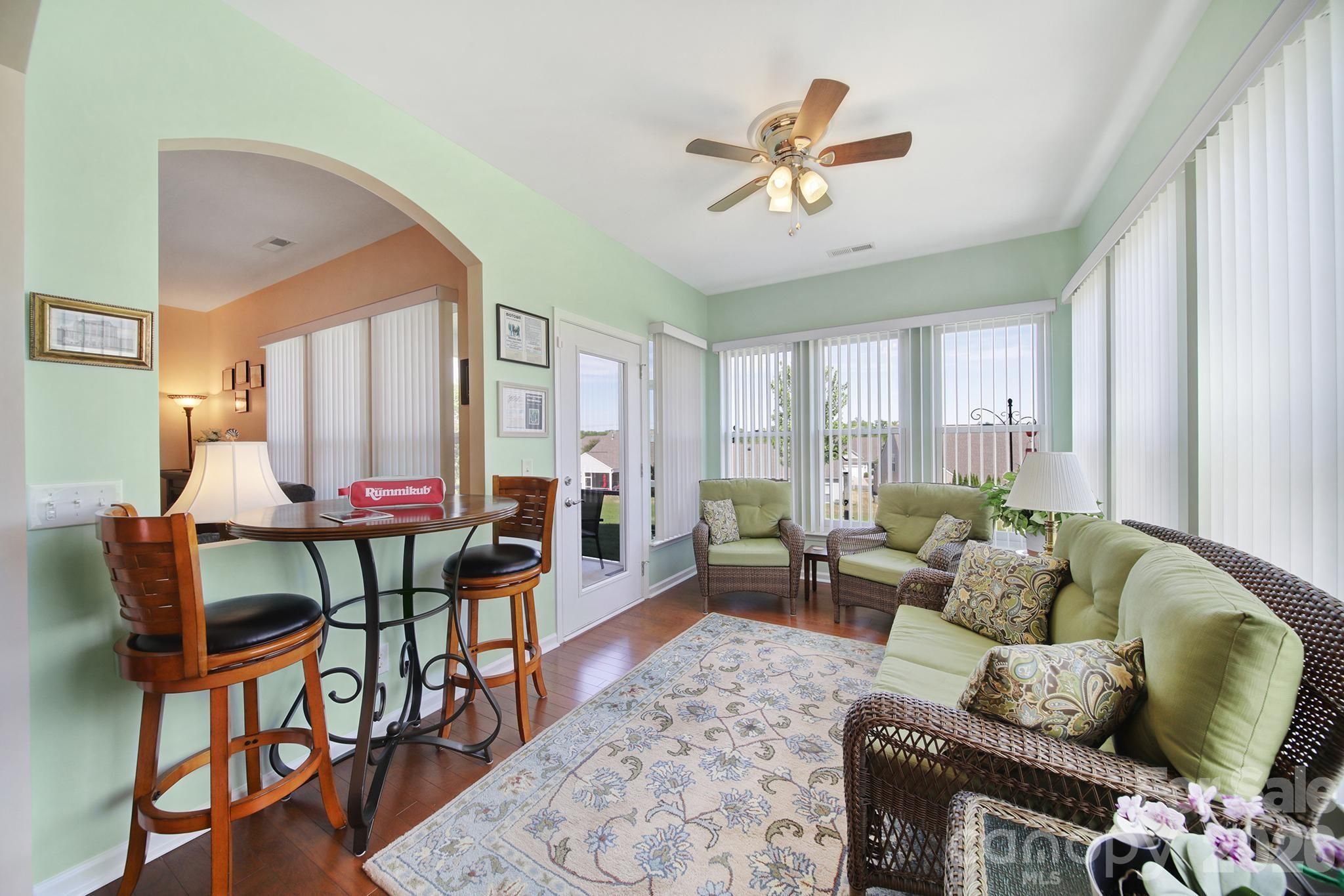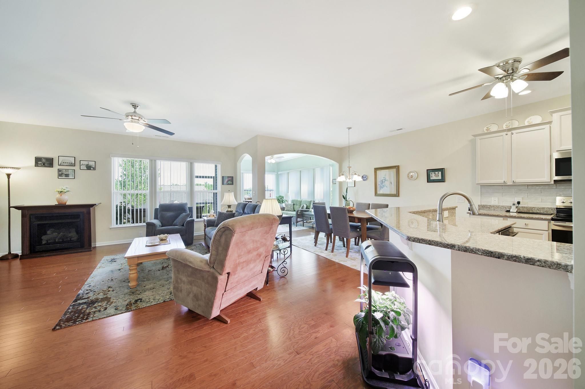 Beautiful Copper Ridge model, loaded with upgrades, in the highly desirable 55+ community of Sun City Carolina Lakes. A welcoming covered entry with storm door sets the tone as you step inside to a welcoming foyer. The heart of the home features a well-appointed kitchen with granite countertops, stainless steel appliances, an electric range, and a stylish tile backsplash. The breakfast bar seamlessly connects the kitchen to the open-concept dining area highlighted by a chandelier, and the spacious living room with a cozy gas fireplace - ideal for both everyday living and entertaining. Just beyond the main living area is a bright sunroom, surrounded by windows, inviting an abundance of natural light while creating a peaceful retreat to relax and unwind. The private primary suite is thoughtfully positioned at the rear of the home and includes an updated ensuite bath with dual sink vanity, a tiled walk-in shower with glass enclosure, safety seating and grab bar, as well as a walk-in closet with custom shelving. At the front of the home you will find a generous secondary bedroom with access to a full hall bath which provides comfortable accommodations for guests. A dedicated home office offers the perfect space for work, study, or hobbies. Step outside to enjoy warm evenings on the covered screened porch overlooking the backyard - perfect for taking in the beauty of the season. Residents of Sun City Carolina Lakes enjoy an exceptional lifestyle with access to resort-style amenities, including golf, tennis, pickleball, state of the art gym, dog park, miles of scenic walking trails, water access, and a vibrant array of social clubs. And, you are a golf cart ride away from shopping, groceries, restaurants, medical and so much more. Additional highlights include a whole-house Generac generator (2020) and a whole-house air purifier, offering added comfort and peace of mind. Irrigation system, Rinnai tankless water heater (2021), Comfortmaker 3 ton a/c (2022)