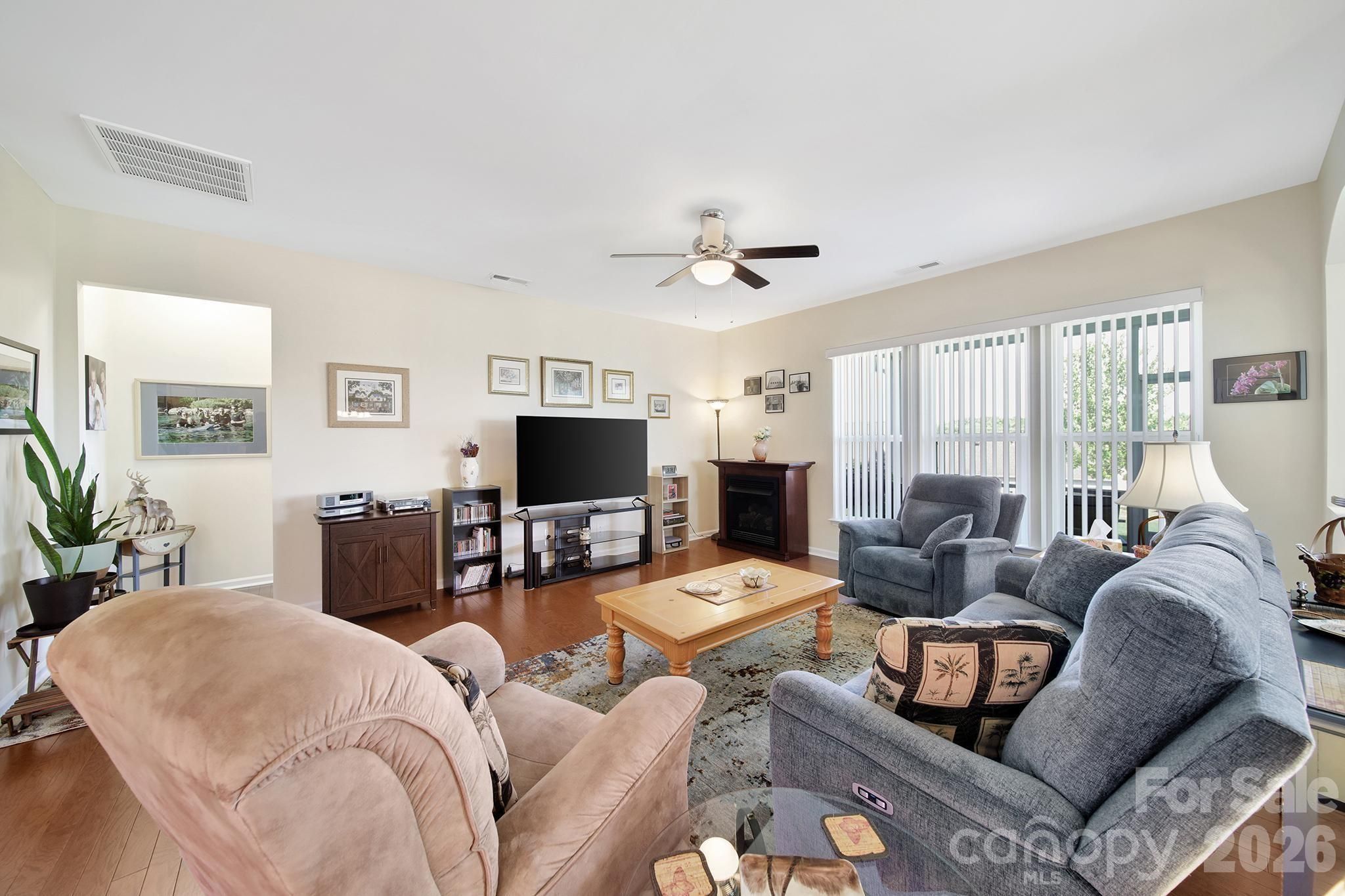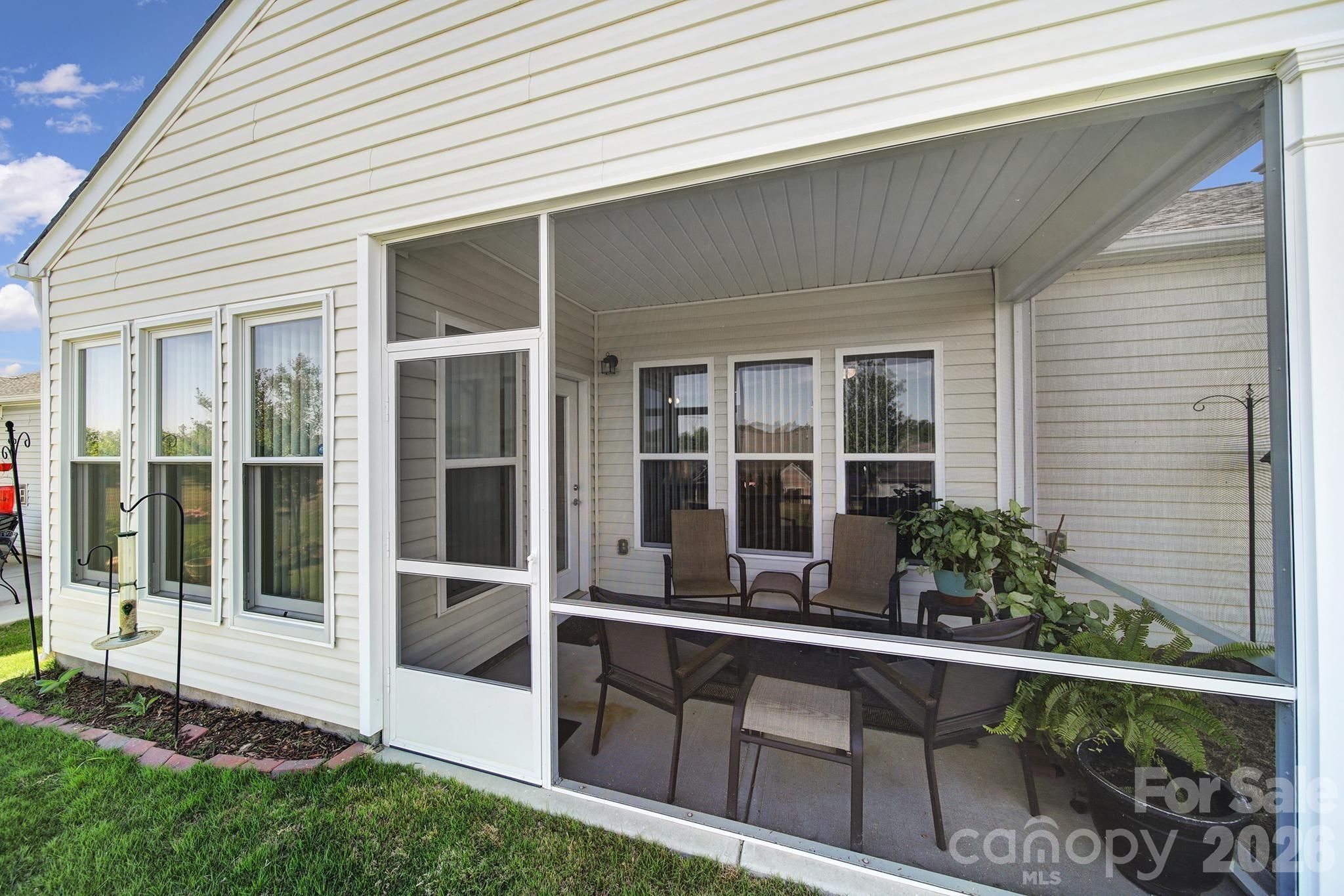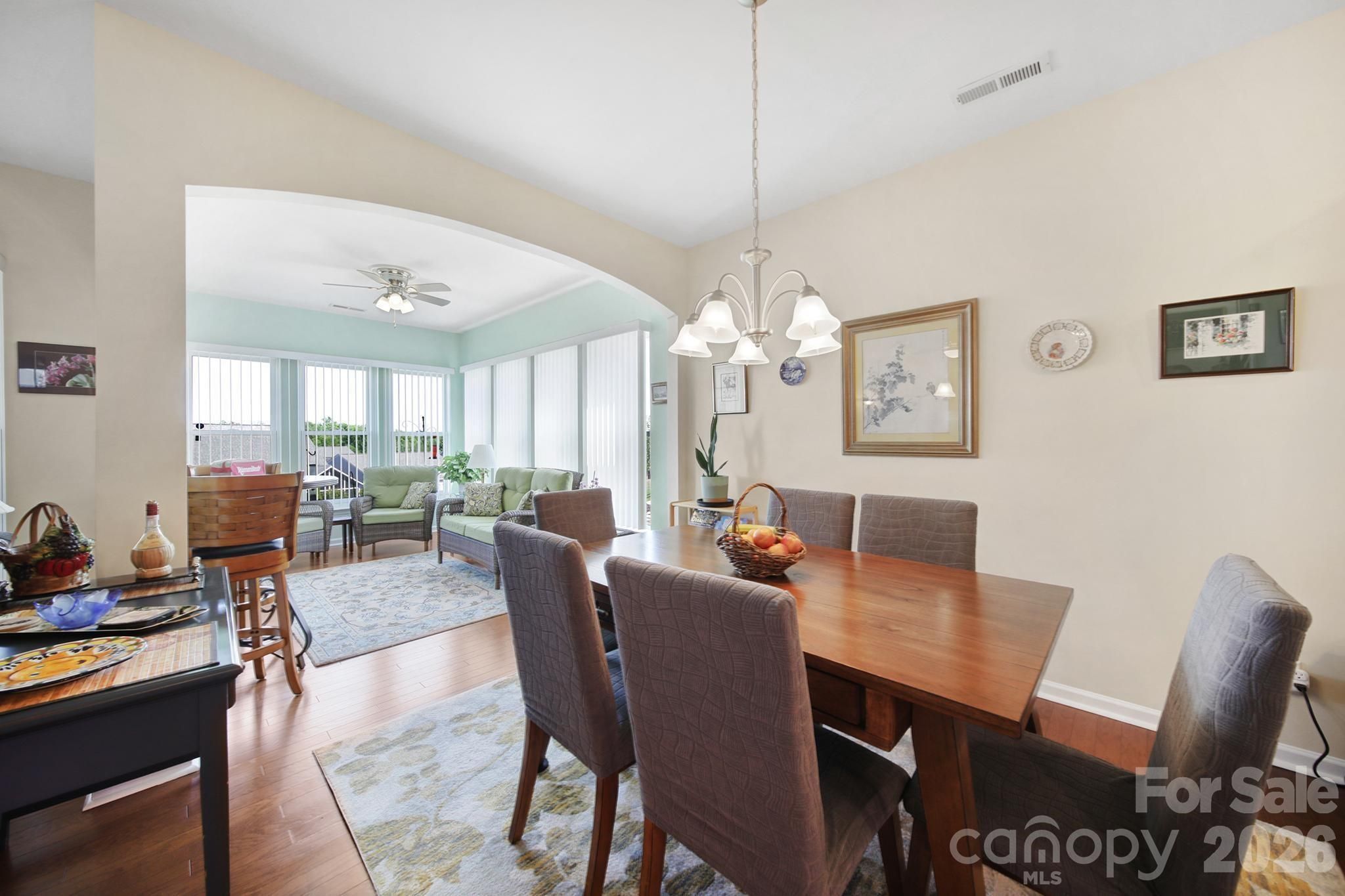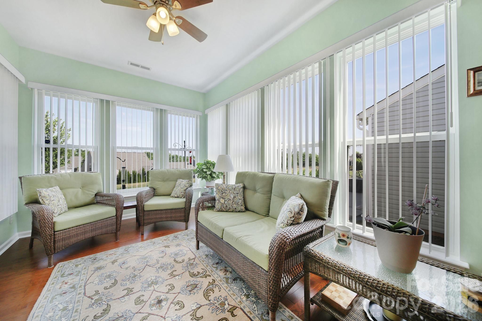 Beautiful Copper Ridge model, loaded with upgrades, in the highly desirable 55+ community of Sun City Carolina Lakes. A welcoming covered entry with storm door sets the tone as you step inside to a welcoming foyer. The heart of the home features a well-appointed kitchen with granite countertops, stainless steel appliances, an electric range, and a stylish tile backsplash. The breakfast bar seamlessly connects the kitchen to the open-concept dining area highlighted by a chandelier, and the spacious living room with a cozy gas fireplace - ideal for both everyday living and entertaining. Just beyond the main living area is a bright sunroom, surrounded by windows, inviting an abundance of natural light while creating a peaceful retreat to relax and unwind. The private primary suite is thoughtfully positioned at the rear of the home and includes an updated ensuite bath with dual sink vanity, a tiled walk-in shower with glass enclosure, safety seating and grab bar, as well as a walk-in closet with custom shelving. At the front of the home you will find a generous secondary bedroom with access to a full hall bath which provides comfortable accommodations for guests. A dedicated home office offers the perfect space for work, study, or hobbies. Step outside to enjoy warm evenings on the covered screened porch overlooking the backyard - perfect for taking in the beauty of the season. Residents of Sun City Carolina Lakes enjoy an exceptional lifestyle with access to resort-style amenities, including golf, tennis, pickleball, state of the art gym, dog park, miles of scenic walking trails, water access, and a vibrant array of social clubs. And, you are a golf cart ride away from shopping, groceries, restaurants, medical and so much more. Additional highlights include a whole-house Generac generator (2020) and a whole-house air purifier, offering added comfort and peace of mind. Irrigation system, Rinnai tankless water heater (2021), Comfortmaker 3 ton a/c (2022)