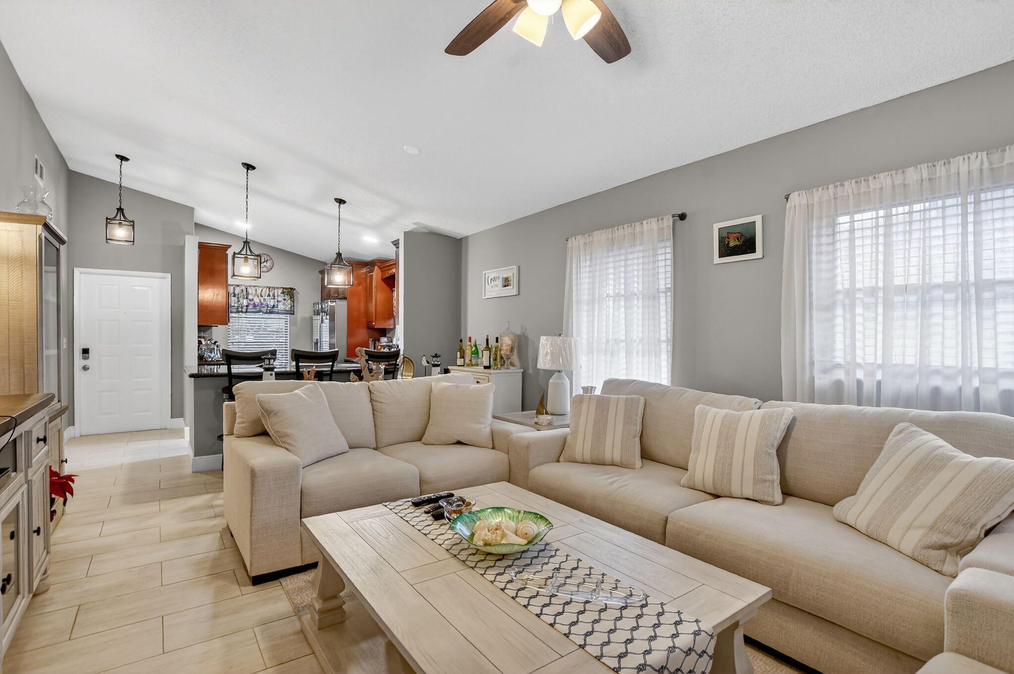 Experience Resort-Style Living! This meticulously 2-bed, 2-bath updated villa offers an open-concept design with a modern kitchen, granite counters, stainless steel appliances, and gleaming tile throughout. Freshly painted, new fixtures, and updated baths add to the appeal, plus a 1-car garage & 2-car driveway. Ready for someone to just bring their furniture and start to enjoy life in sought-after Whisper Walk! Whisper Walk is a gated community in a park-like setting with lush landscaping, lakes & tennis center including pickle ball, handball/paddleball & basketball courts, shows, events, exercise room, library, billiards, hot tub and heated pool. Internet,cable & water included in the quarterly maintenance