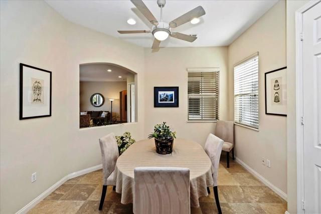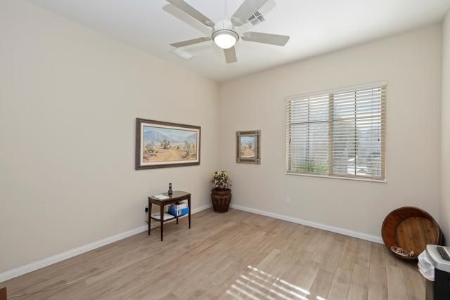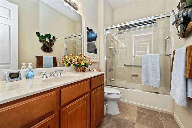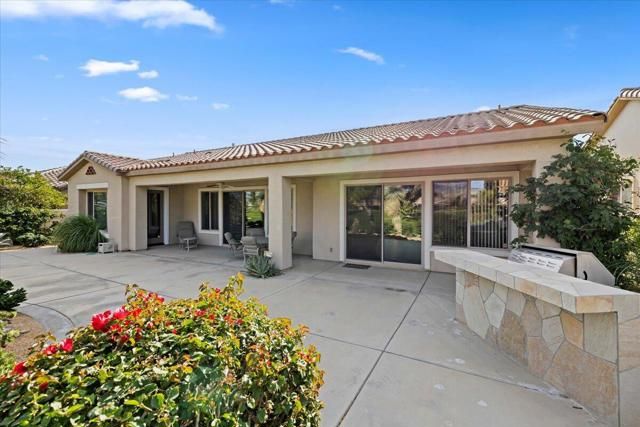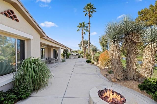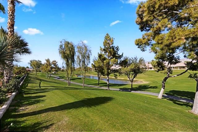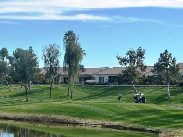 Exceptional golf course home with breathtaking golf, lake, AND mountain views. The elevated patio is a virtual haven for relaxing and enjoying the firepit and built in BBQ. Once inside this San Miguel model, you'll find the same magnificent views from the living room, kitchen, great room, and primary bedroom. The primary bath has a large dual vanity, separate soaking tub, shower and an incredible built in custom closet. The ensuite 2nd bedroom and bath have an outside courtyard entrance and could easily be separated from the main house by another interior door. Think...guests, extended family, a future caretaker, etc. The office is large enough to easily make a 3rd guest room. The garage has loads of built in storage. This home has been impeccably maintained by the original part time owners and is being sold with high end furnishings and artwork. Complete inventory list available . Close to the main Montecito Clubhouse. Sun City Shadow Hills is an over 55 community with 2 clubhouses, 3 pools, 2 golf courses, 2 fitness centers, pickleball, tennis, and over 50 clubs.NOTE: The 3rd bay of the garage is a golf cart bay