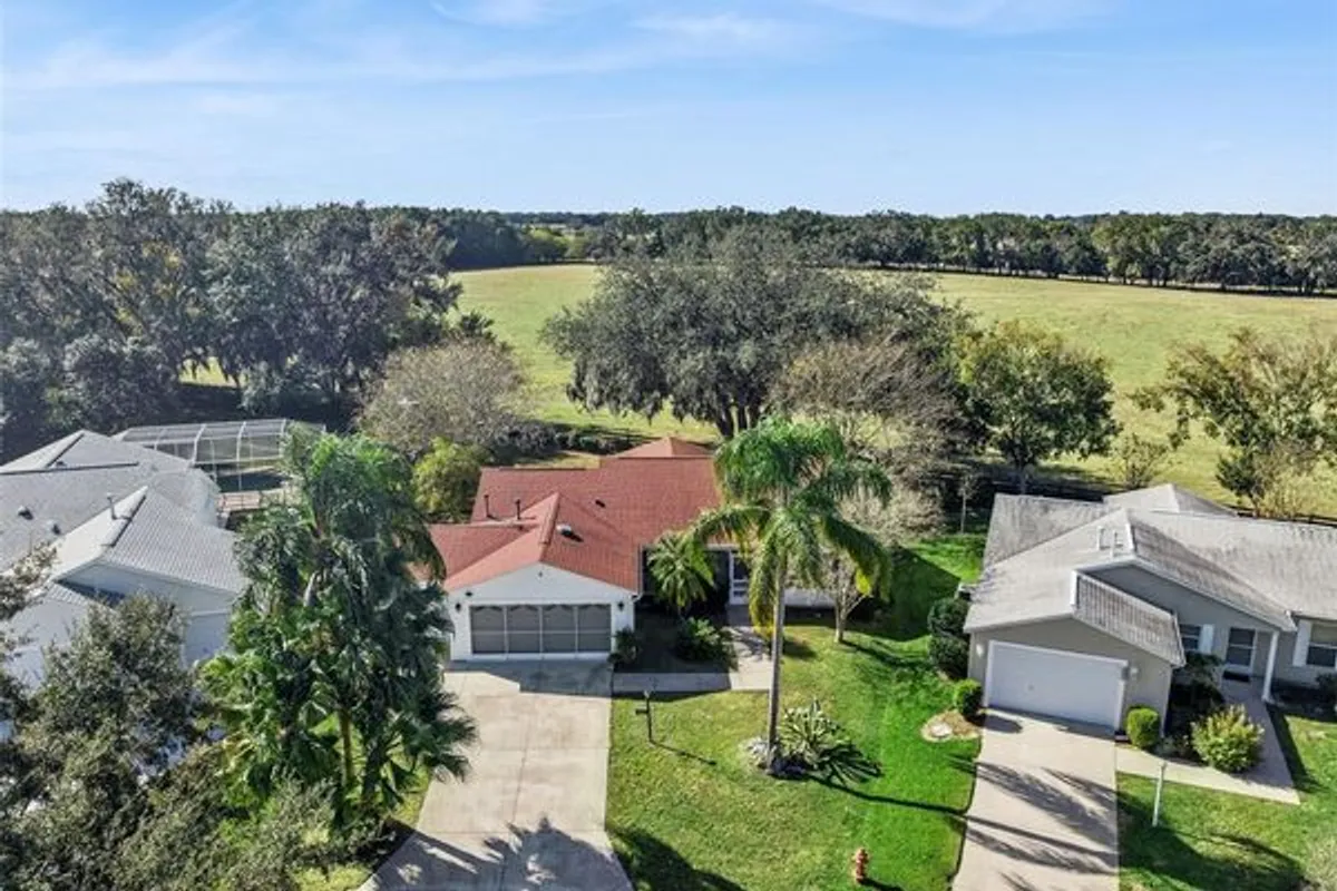 Welcome HOME to The Villages — where comfort, privacy, and peaceful living come together. Opportunities like this are rare: a one-owner residence on an oversized .27-acre lot offering exceptional space and thoughtful design. What truly sets this home apart is the gorgeous, serene cattle farm directly behind the property. With no rear neighbors and sweeping pastoral views, you’ll enjoy one of the most private and tranquil settings in all of The Villages. It’s the kind of backdrop that makes every morning feel peaceful and every evening feel like a retreat. This home also features a 2-car garage PLUS an oversized 3rd golf-cart garage, deep enough to fit two golf carts in tandem — an incredibly rare find in this community. Relax on the screened front porch with a cup of coffee or a good book, then step inside to an open-concept layout where the kitchen overlooks the living room, perfect for entertaining. A natural gas stove makes cooking a delight, and the split-floorplan ensures privacy for you and your guests. The spacious primary suite includes a custom walk-in closet with wooden built-ins and an en-suite bath with a walk-in shower. The secondary bedrooms are generously sized and ideal for guests, hobbies, or an office. Your screened and covered back lanai may quickly become your favorite place — a peaceful oasis overlooking mature landscaping and fruit trees. The extended patio offers room for grilling, lounging, or simply enjoying the quiet beauty of the farm views. Notable updates include: Gas Water Heater (2025) Roof (2020) HVAC (2016) WiFi-enabled garage door opener, Updated electrical outlets & dimmable LED lighting, WiFi-enabled thermostat, dishwasher & washer, newer ceiling fans, rain gutters, garage service door & window. Custom wood shelving in the laundry room for extra storage. Located near Nancy Lopez Legacy Country Club, tennis, aquatic centers, dining, Spanish Springs, Lake Sumter Landing, medical plazas, Costco, Lowe’s, and major highways including I-75 and the Florida Turnpike — this home offers both serenity and convenience. This is a property you truly must see in person to appreciate the privacy, upgrades, and thoughtful features throughout.