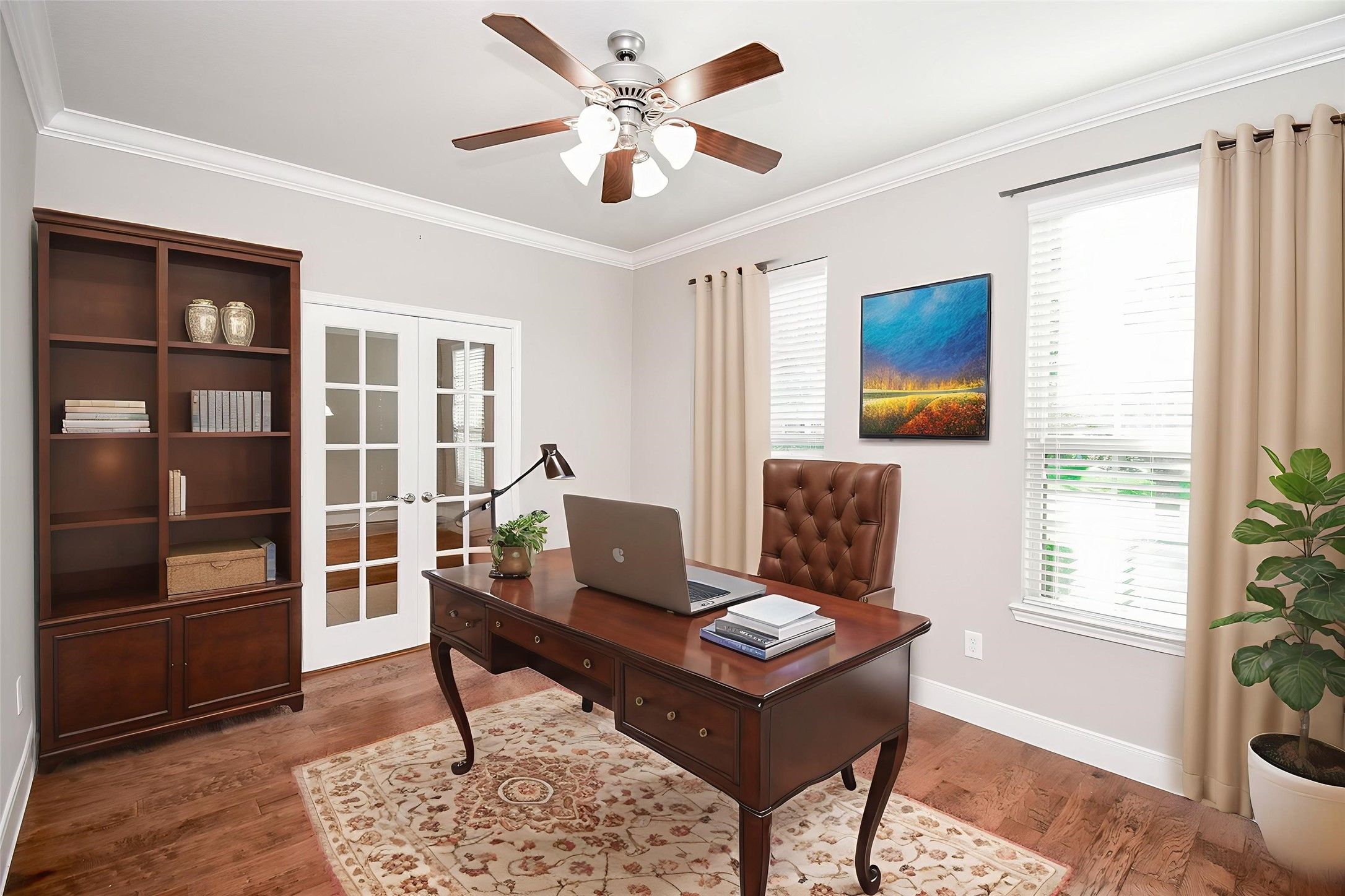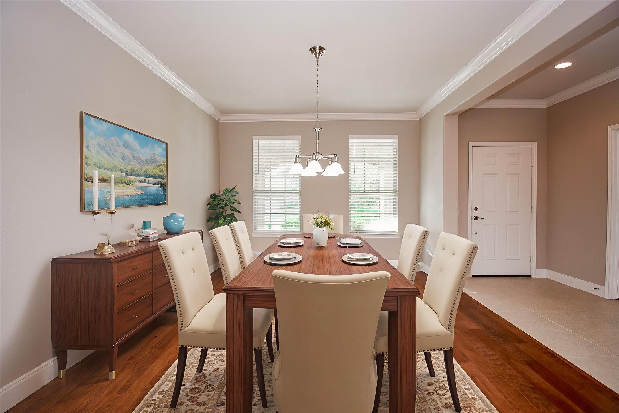 Welcome to this exquisite three-bedroom, two and a half-bath home, featuring a formal dining room and a dedicated home office. Situated in the heart of Del Webb, just a few steps from the Lakehouse and community amenities, making it an ideal location for an active lifestyle. The home boasts gleaming wood floors, crown molding, 5 1/4" baseboards, and high ceilings, among other exquisite features. The spacious kitchen features sleek granite countertops and a large island, stainless steel appliances, maple cabinets with raised panels, roll-out trays/drawers, under-cabinet lighting, and a charming butler's pantry with glass-front cabinets for displaying fine china and crystal. The guest bedroom provides a perfect setting for relaxation and enjoyment. The luxurious primary suite features a spa-like jetted tub, a separate shower, a large walk-in closet, and peaceful surroundings. Brand New Back Fence being installed Feb 16th! Bring your dogs! Let the GrandKids play in the large backyard!