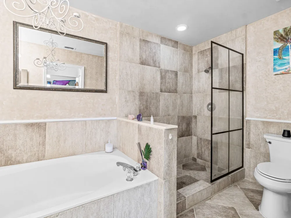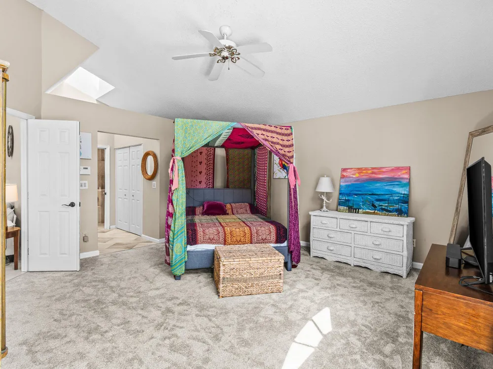 - Cathedral Ceiling(s), Entry Level Living Area, Entrance Foyer, Skylights, Split Bedrooms, Walk-In Closet(s), Attic, Family Room, Breakfast Area, Separate/Formal Dining Room, Primary Downstairs, Sitting Area In Primary Bedroom, Separate Shower, Bathtub, Storm Shutters