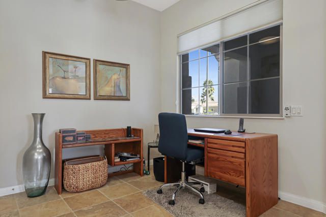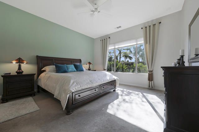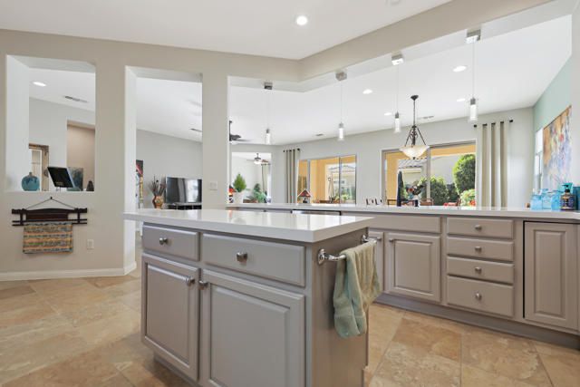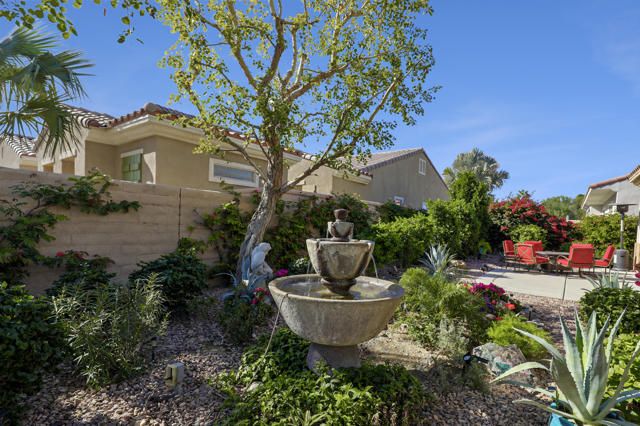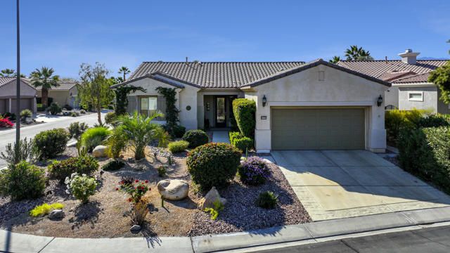 This popular Madera Model, offering peace, serenity, comfort and style are yours from this desirable south facing corner lot within the 55+ adult community of Sun City Shadow Hills. Entering thru the Leaded Glass Front door to a warm open floor plan. This 1854 sq. ft. home with 2 bedrooms, 2 bathrooms, den/office, formal dining area, kitchen nook and open bar. Remodeled kitchen with quartz counters, stainless steel appliances, an Island and pantry. Laundry room with a washer/dryer , sink and cabinets with direct access to the two- car garage with 2 work benches, epoxy floor and cabinets. A New HVAC with an air -conditioned garage. Custom window coverings and newly painted, this home comes fully furnished. The serene low maintenance back garden is landscaped for peaceful moments with a water fountain and floral landscaping. A quiet location near the Montecito club house make this a wonderful place to call home!